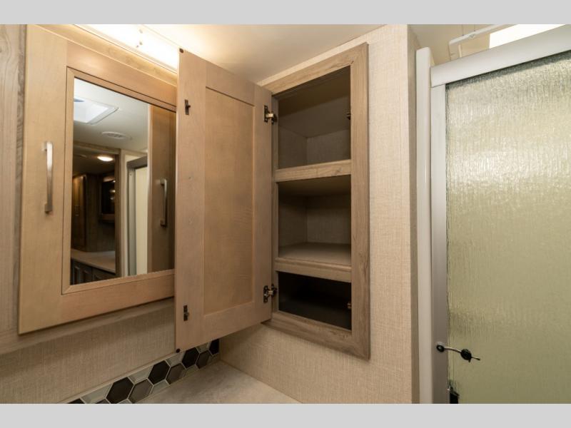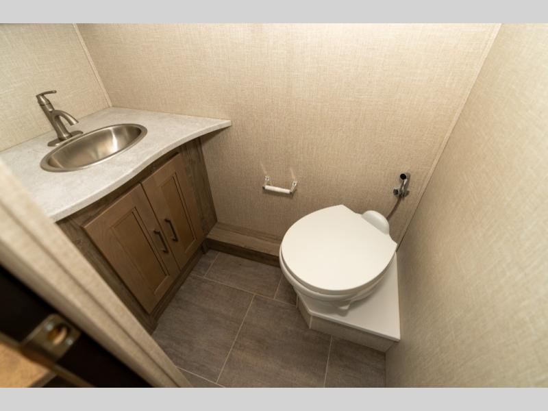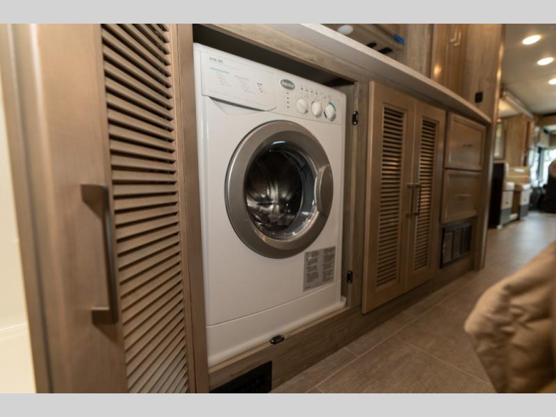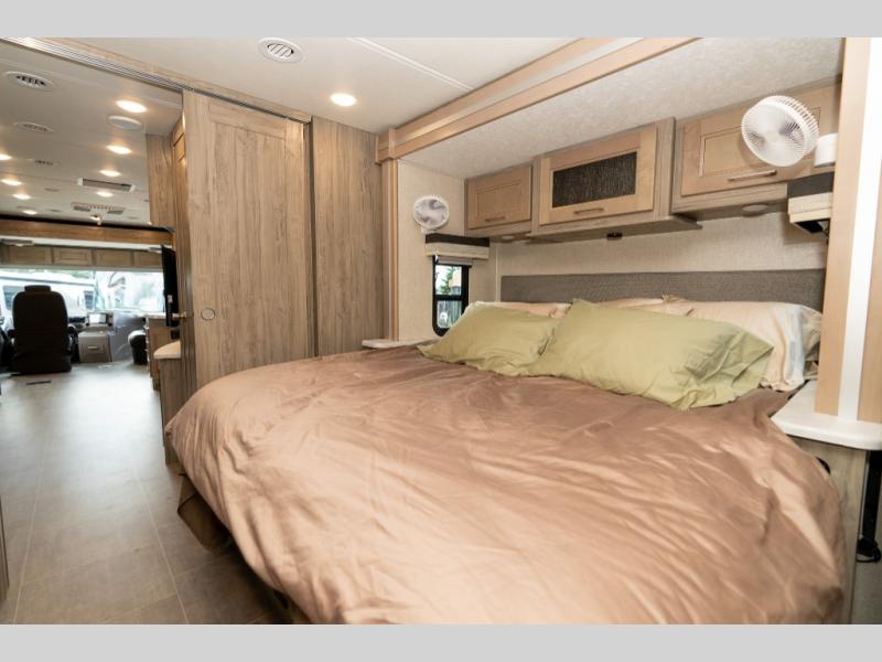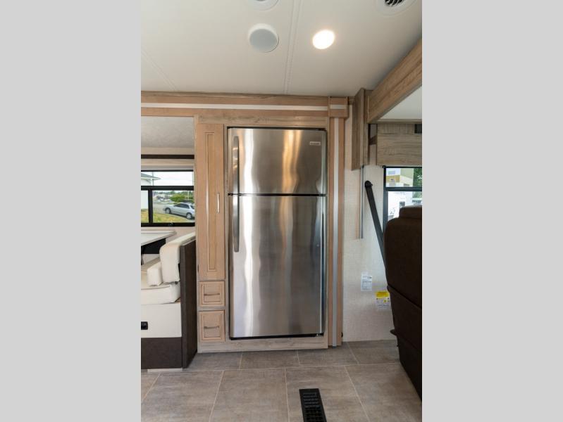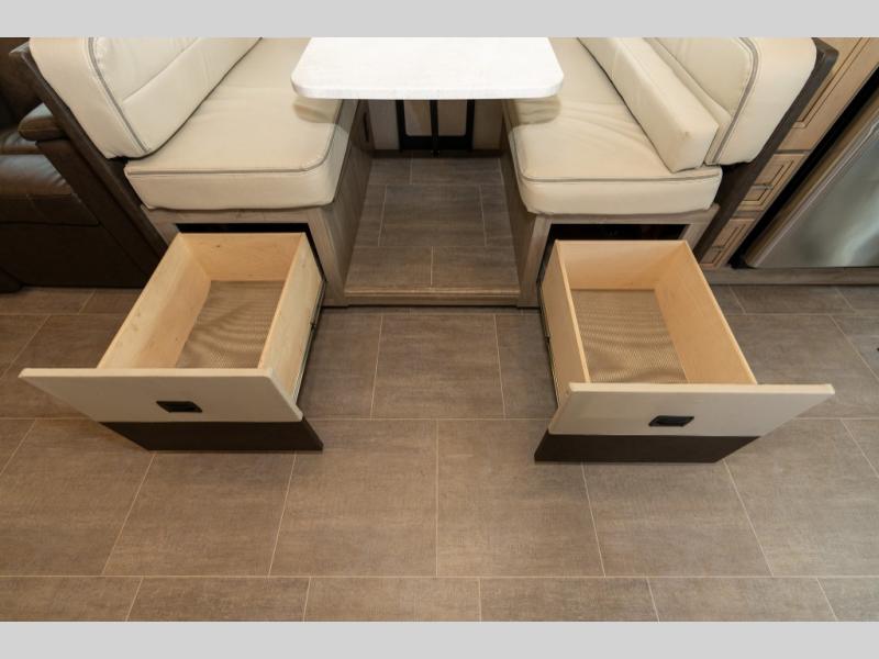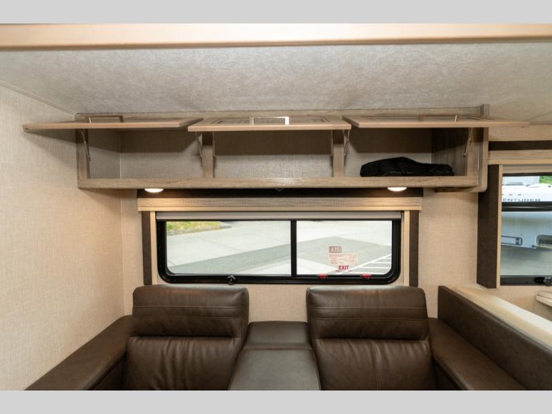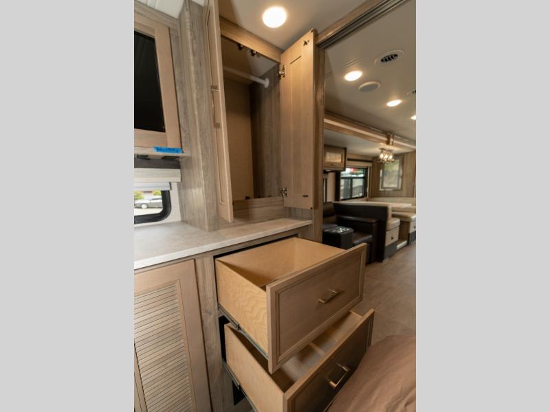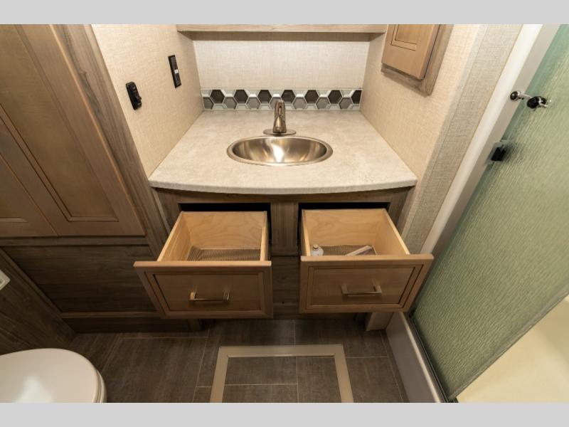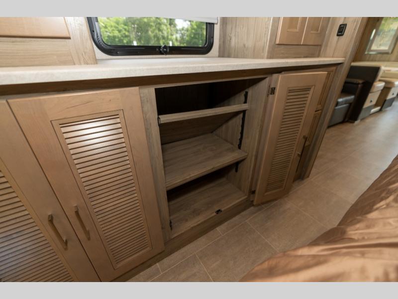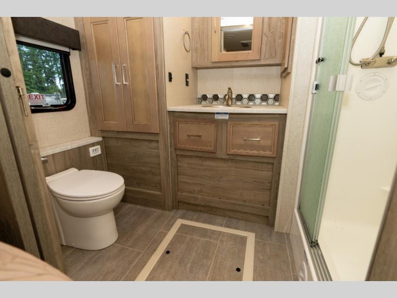 Comfortable and convenient are the adjectives you will be using when traveling in this coach. Imagine having a master suite with a king bed slid out and storage as well as a full bathroom with a closet including a hamper, linen storage, and a shower. You even have a half bath for your guests that might enjoy sleeping on the sofa bed, the dinette or the drop-down overhead bunk. You can enjoy your morning coffee at the cockpit table or the dinette, plus the power awning offers an outdoor living space. You can turn on the exterior TV if you like, or listen to sounds of nature while relaxing in your own camp chair.
