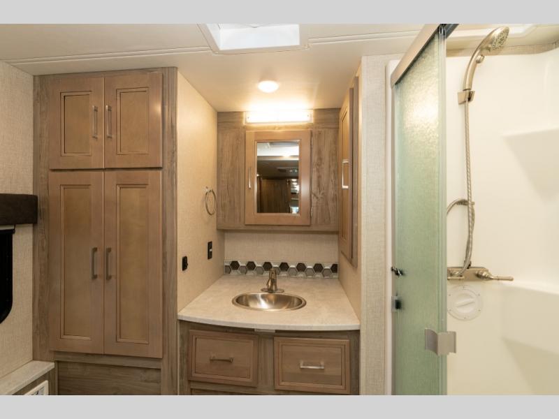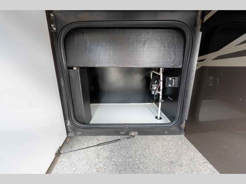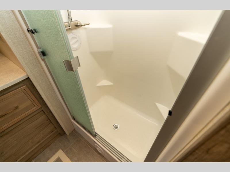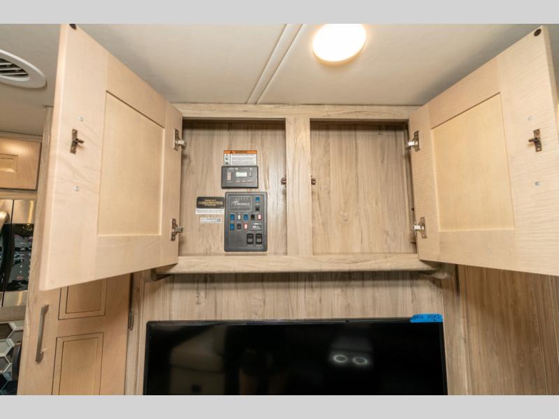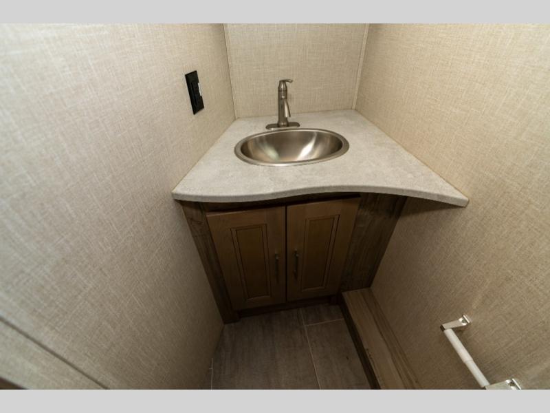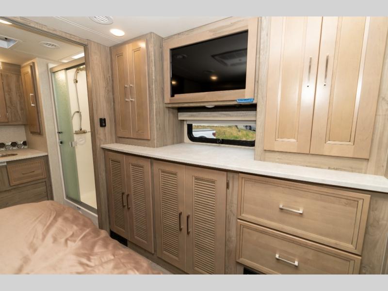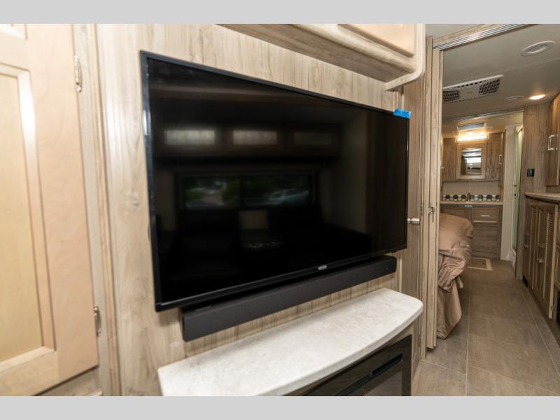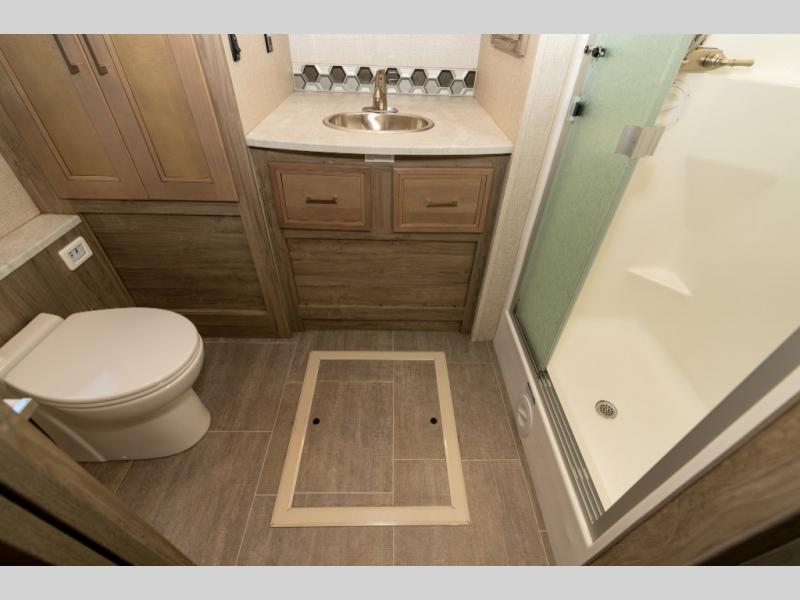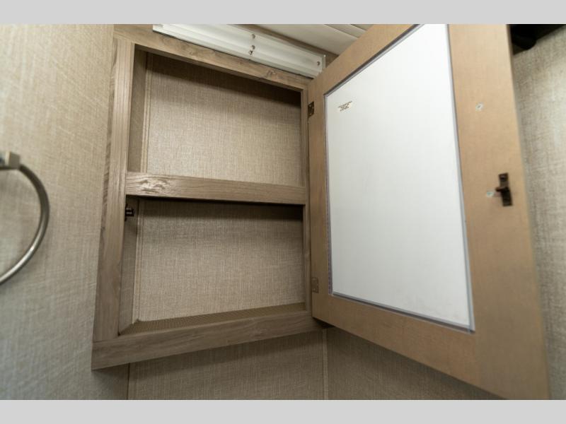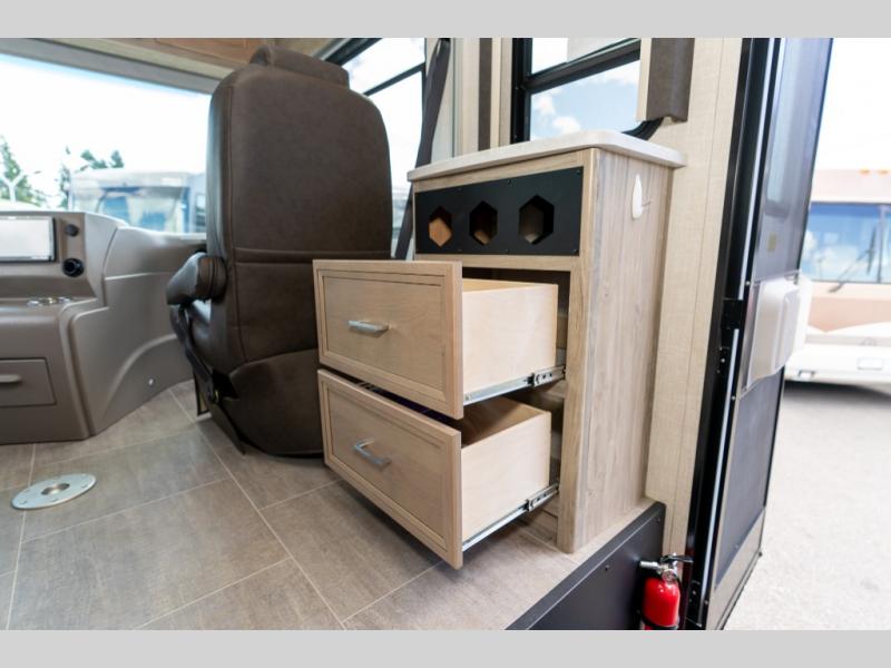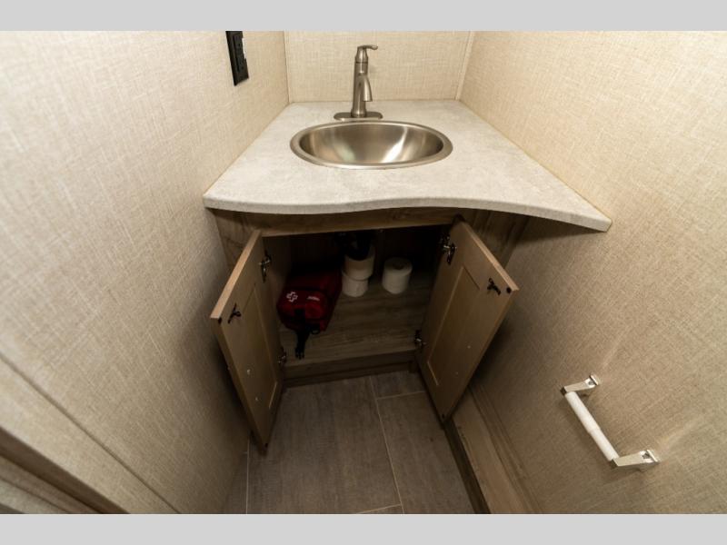 Comfortable and convenient are the adjectives you will be using when traveling in this coach. Imagine having a master suite with a king bed slid out and storage as well as a full bathroom with a closet including a hamper, linen storage, and a shower. You even have a half bath for your guests that might enjoy sleeping on the sofa bed, the dinette or the drop-down overhead bunk. You can enjoy your morning coffee at the cockpit table or the dinette, plus the power awning offers an outdoor living space. You can turn on the exterior TV if you like, or listen to sounds of nature while relaxing in your own camp chair.