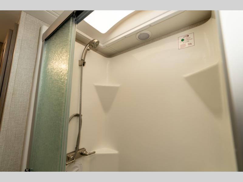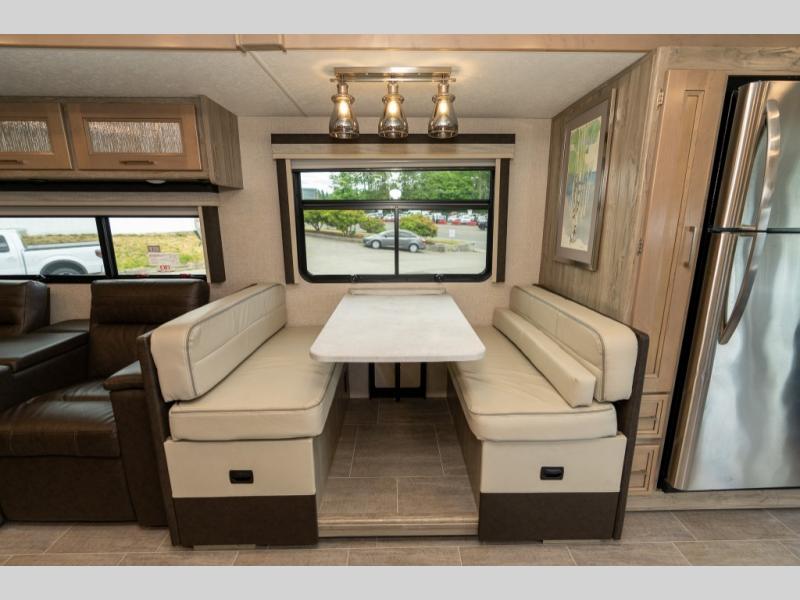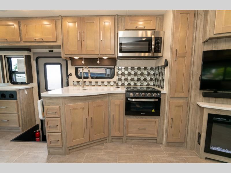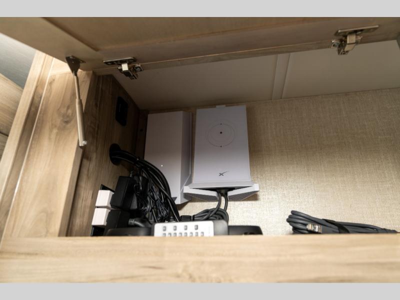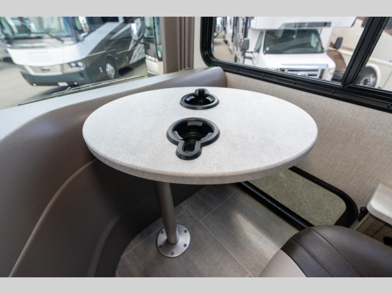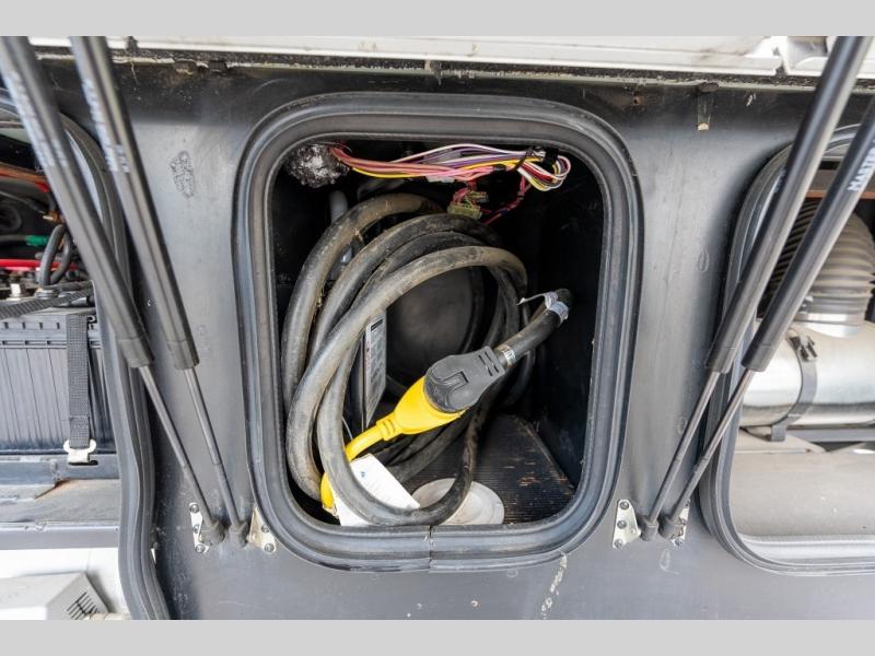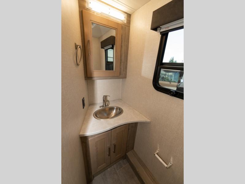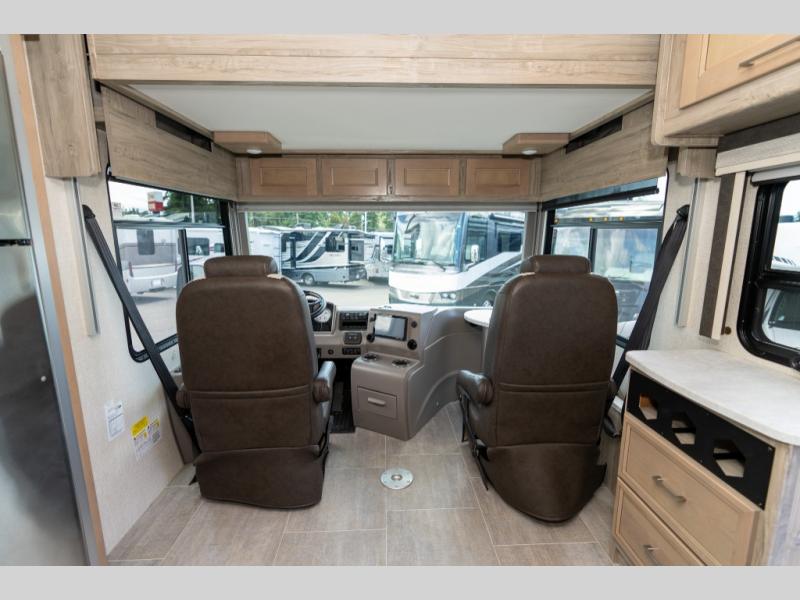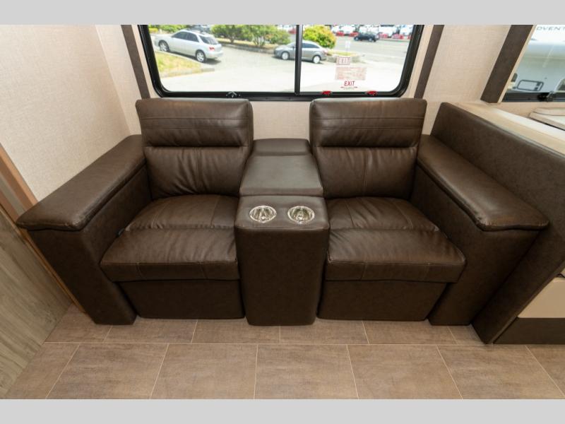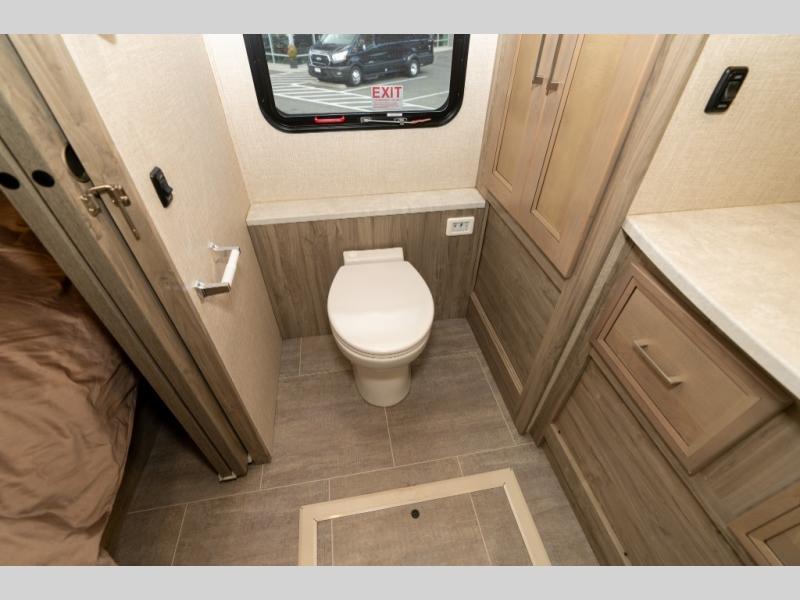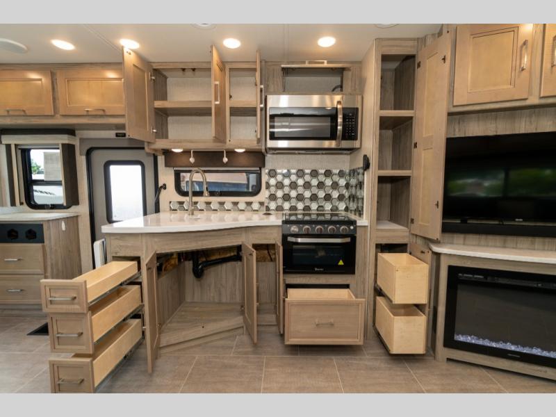 Comfortable and convenient are the adjectives you will be using when traveling in this coach. Imagine having a master suite with a king bed slid out and storage as well as a full bathroom with a closet including a hamper, linen storage, and a shower. You even have a half bath for your guests that might enjoy sleeping on the sofa bed, the dinette or the drop-down overhead bunk. You can enjoy your morning coffee at the cockpit table or the dinette, plus the power awning offers an outdoor living space. You can turn on the exterior TV if you like, or listen to sounds of nature while relaxing in your own camp chair.