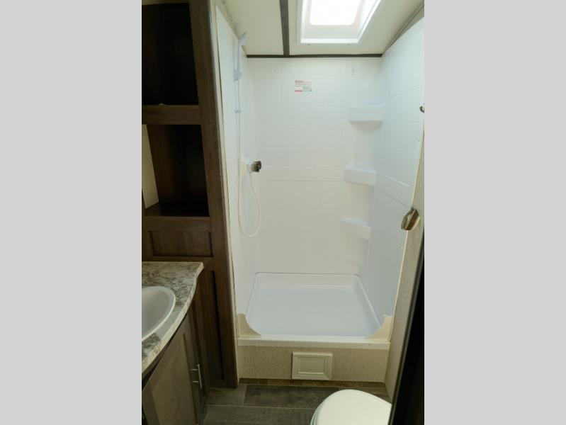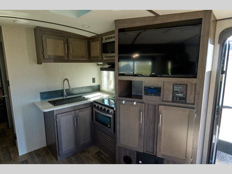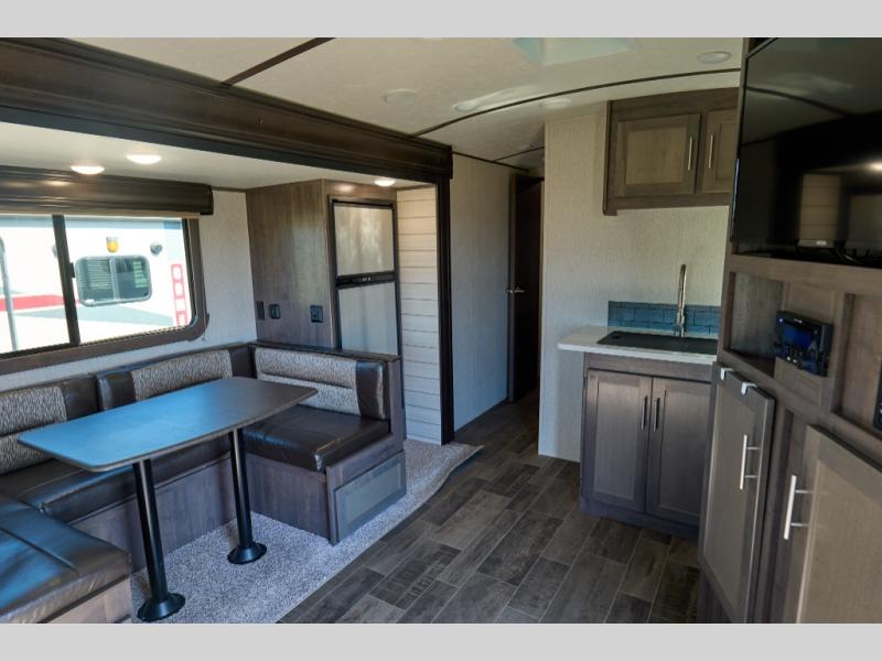 Invite the grandkids for a fun trip in this travel trailer that can sleep six people each night. Set up camp, then have a look around the campground or maybe take a quick hike to get some fresh air. Whip up some dinner on the cooktop or use the handy microwave oven and everyone can enjoy it around the U-shaped dinette within the slide out. This model includes a tri-fold sofa that is great for relaxing and also can be used for sleeping space as well. You'll appreciate the front private bedroom that includes a king bed, a closet, and dual wardrobes so you can bring all of your favorite outfits along.