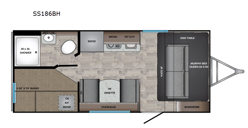You will love this travel trailer with its versatile Murphy bed that can fold up after bedtime and you can enjoy the jack-knife sofa during the daytime. The kids can easily clean up in the shower after a day at the lake and they'll love hopping into bunk beds for a good night's rest. The chef of the family can prepare dinner on the two burner range and grab ingredients from the inside or outside refrigerator. Enjoy a nice evening outside under the power awning with LED lights or play a game of card at the booth dinette. This travel trailer is the one for you!
