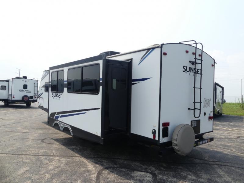 The Sunset Trail travel trailers by CrossRoads RV allow you to extend your camping season with the Extreme Weather Package that includes a reflective heat barrier, a heated and enclosed underbelly, and a 13,500 A/C. You'll enjoy many convenience features such as Keyed-A-Like locks, an HDMI Bluetooth stereo, solid doors to the bedroom, and cross ventilation slide windows that allow the fresh spring air in.