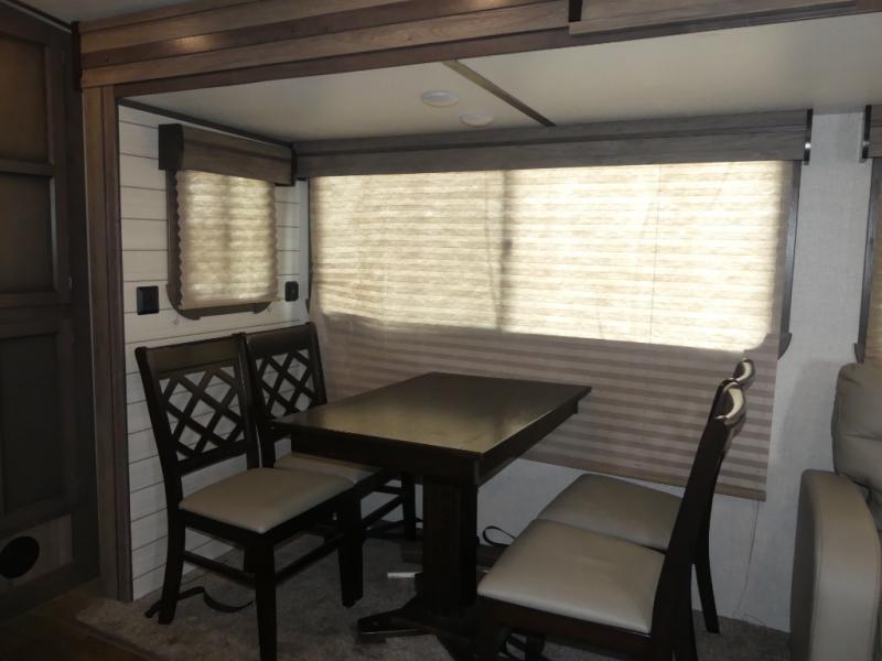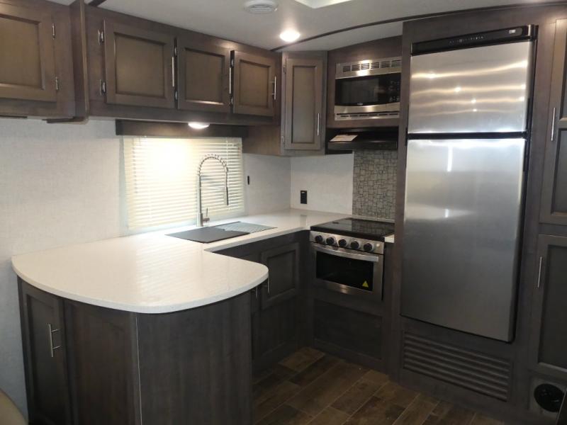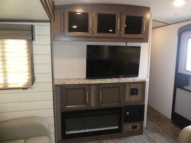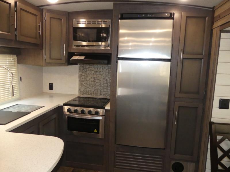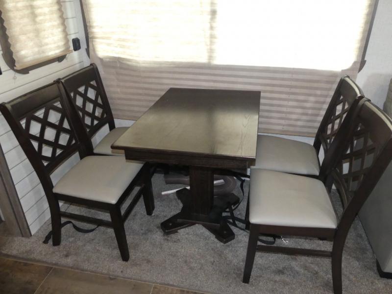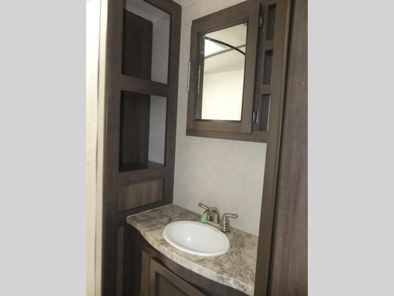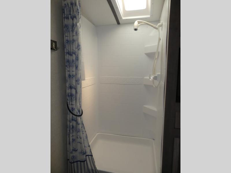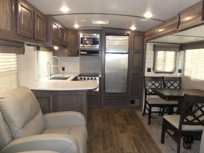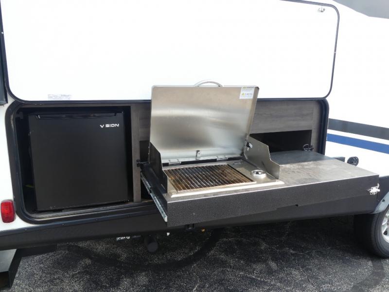 Eat, sleep, relax, and play all in this travel trailer features a large slide out for added interior space. There is plenty of seating choices, including dual lounge chairs, a theater seating, and a dinette. After you've worked up your appetite on a long bike ride, get cleaned up in the 30" x 36" shower then head outdoors to cook dinner on the outside camp kitchen. This model also includes a power awning with LED lights and outside speakers. So grab your camp chair and a cold drink from the outdoor refrigerator and enjoy some great company!