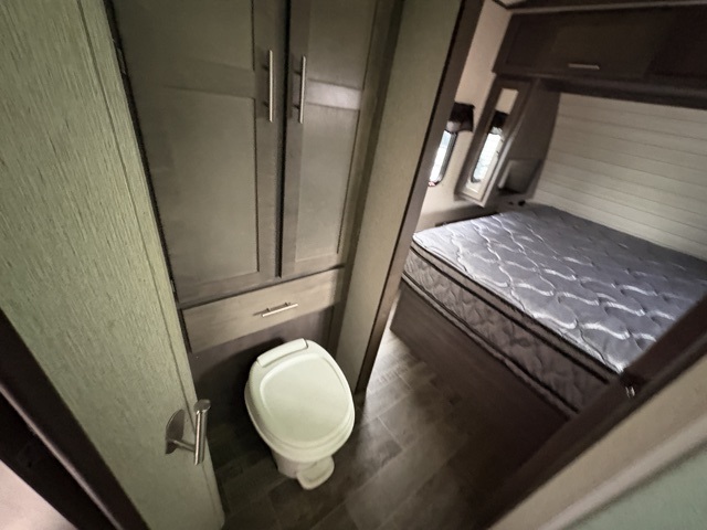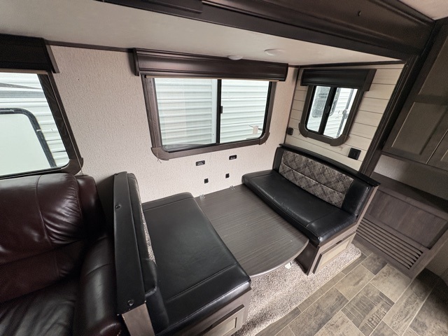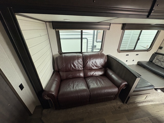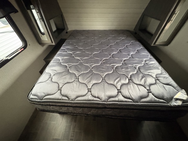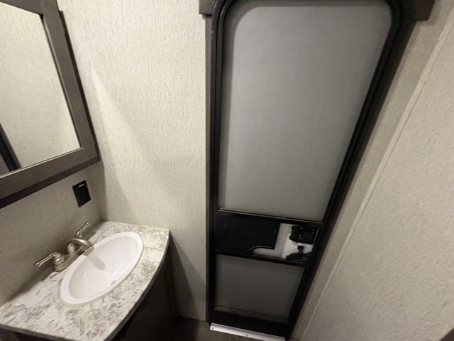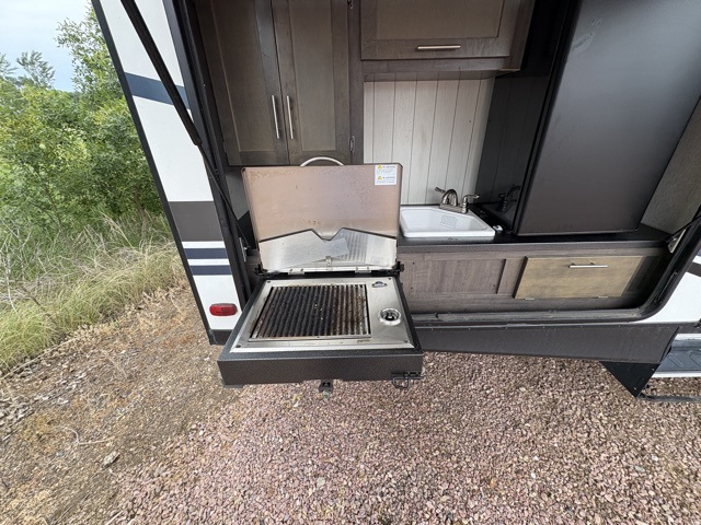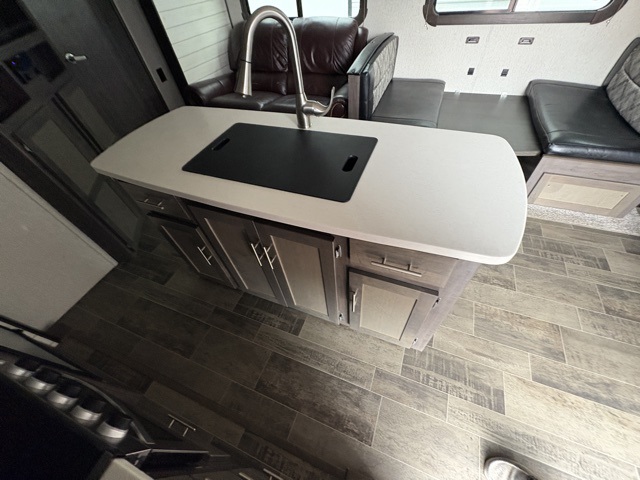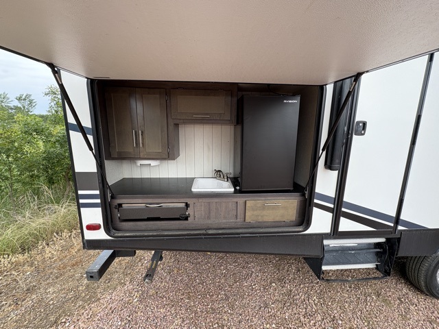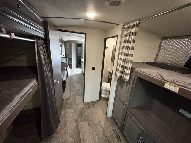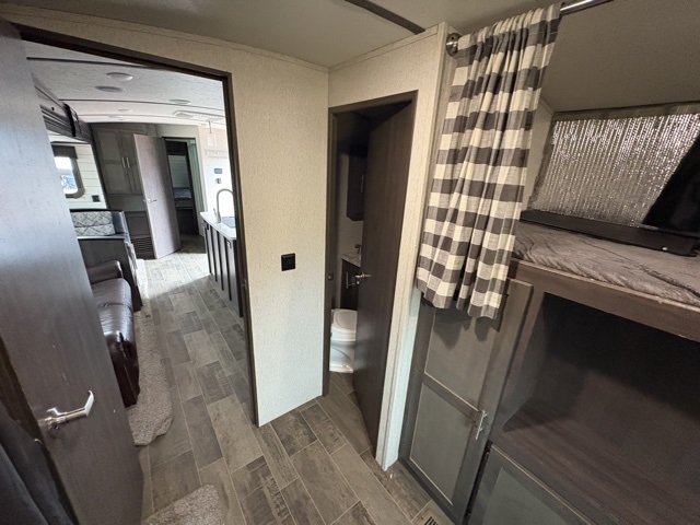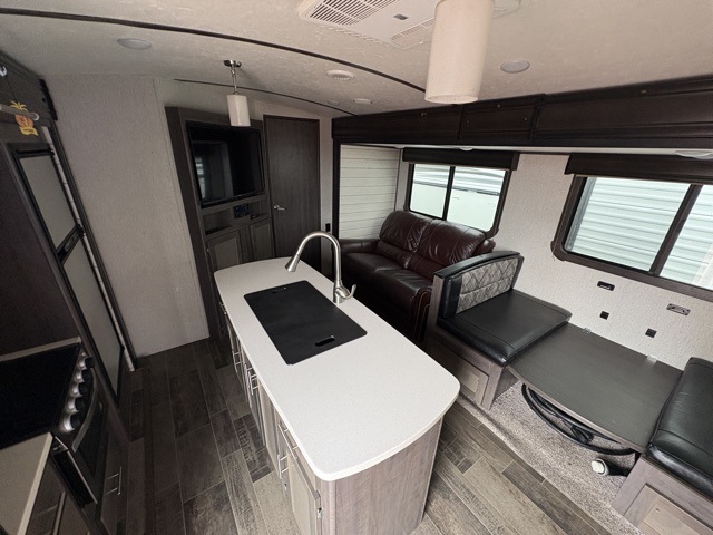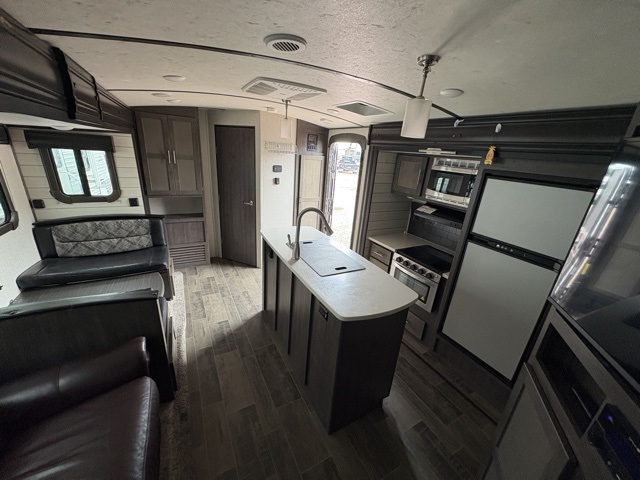 After looking for the perfect travel trailer for your bigger family, your search is over! You can comfortably sleep nine people each night thanks to the private bunkhouse with two bunks and a jack knife sofa, the king bed in the front bedroom, and the tri-fold sofa and XL dinette. This model features a walk-through bath that leads to the front bedroom and a convenient half bath with it's own exterior entry door! Cook dinner on the outside kitchen after preparing the meal using the counter space on the kitchen island and maybe make more food inside with full amenities.