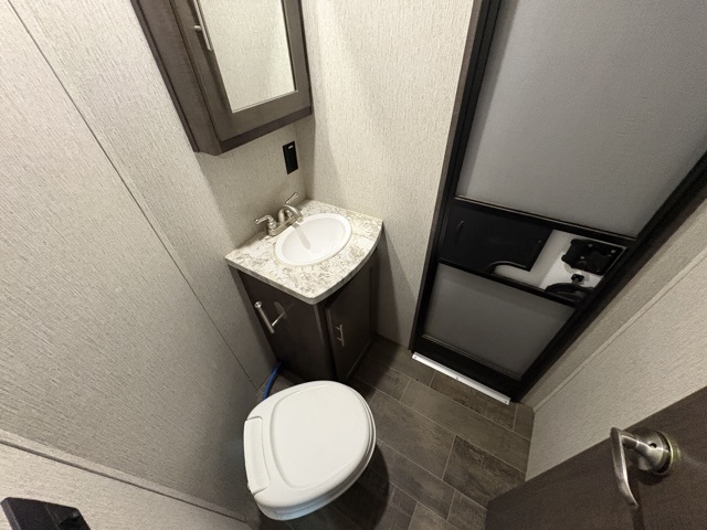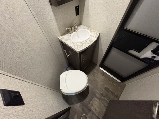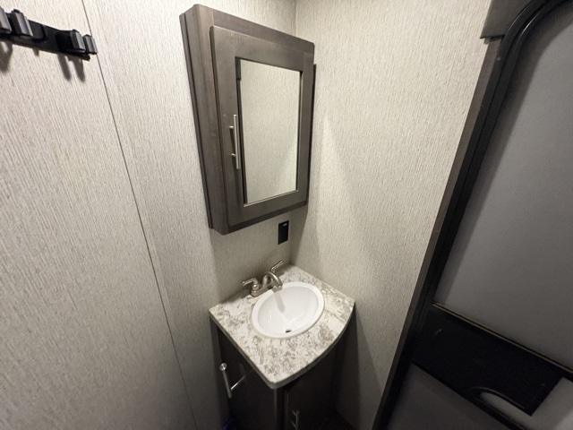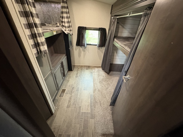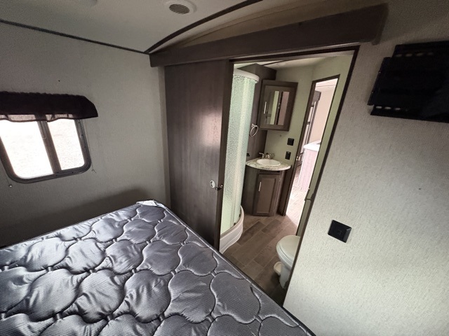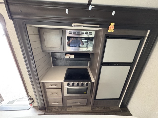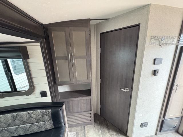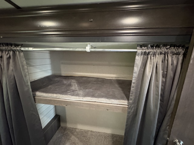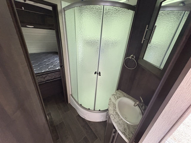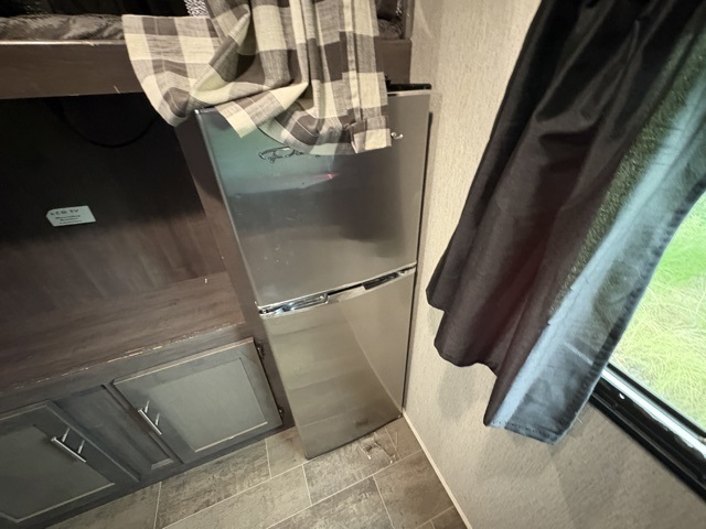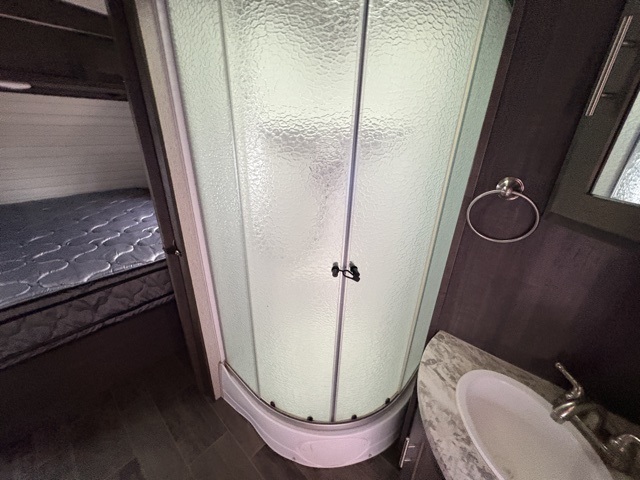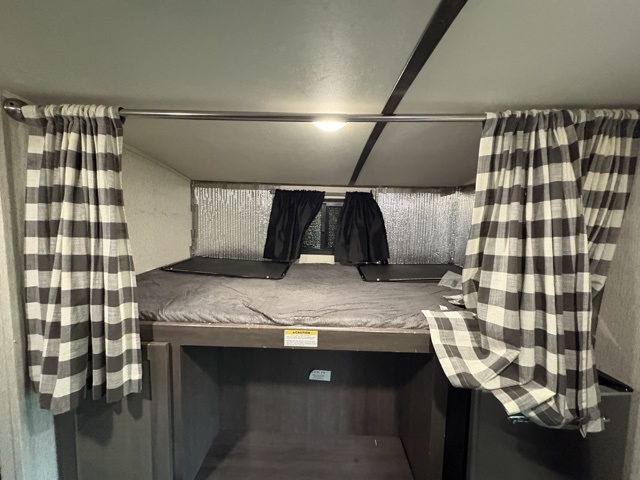 After looking for the perfect travel trailer for your bigger family, your search is over! You can comfortably sleep nine people each night thanks to the private bunkhouse with two bunks and a jack knife sofa, the king bed in the front bedroom, and the tri-fold sofa and XL dinette. This model features a walk-through bath that leads to the front bedroom and a convenient half bath with it's own exterior entry door! Cook dinner on the outside kitchen after preparing the meal using the counter space on the kitchen island and maybe make more food inside with full amenities.