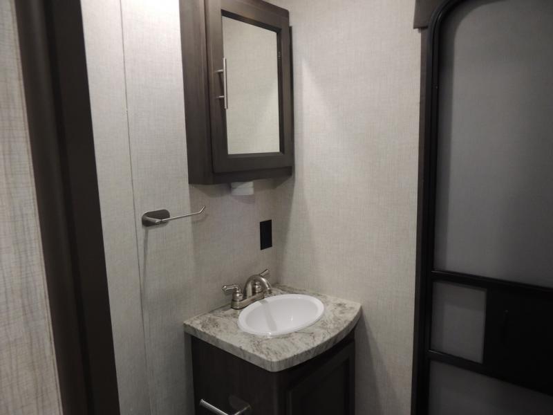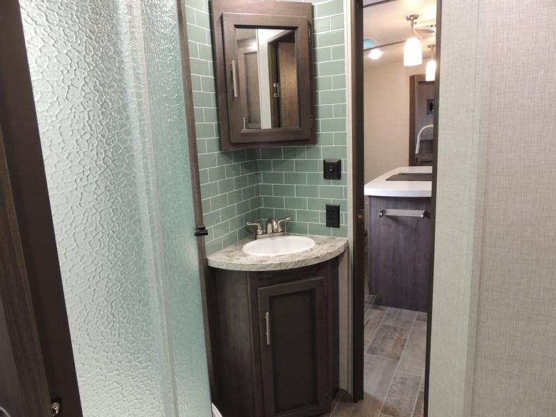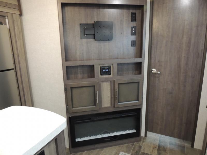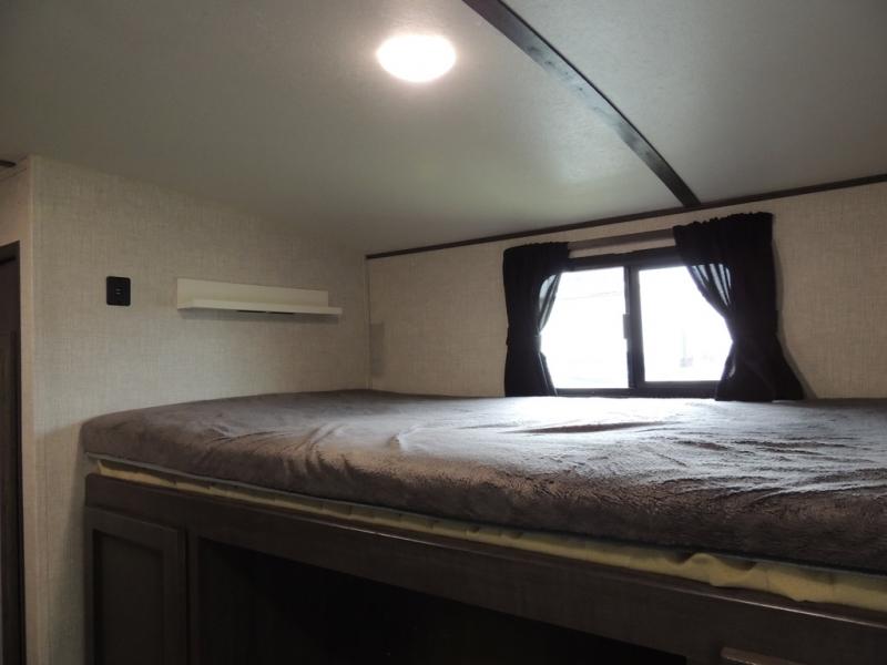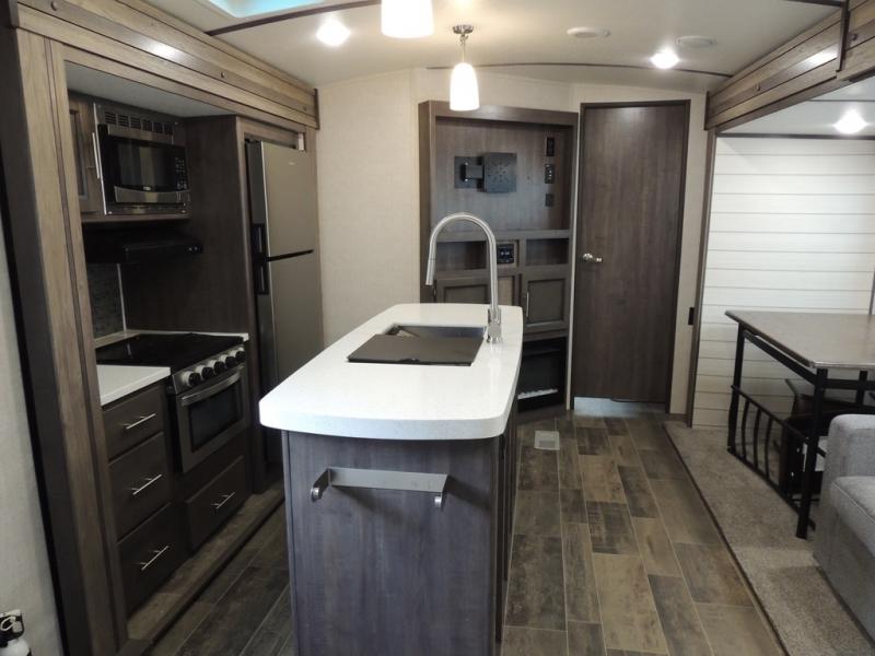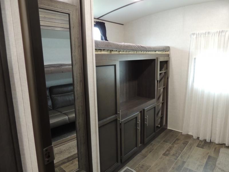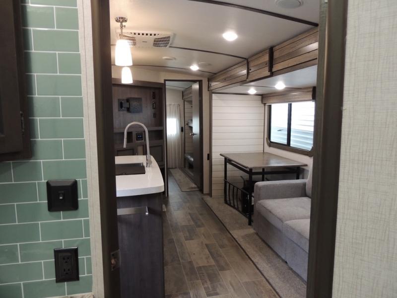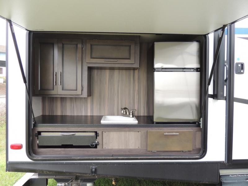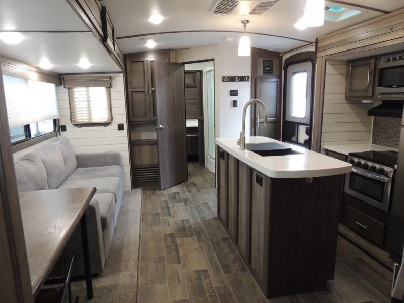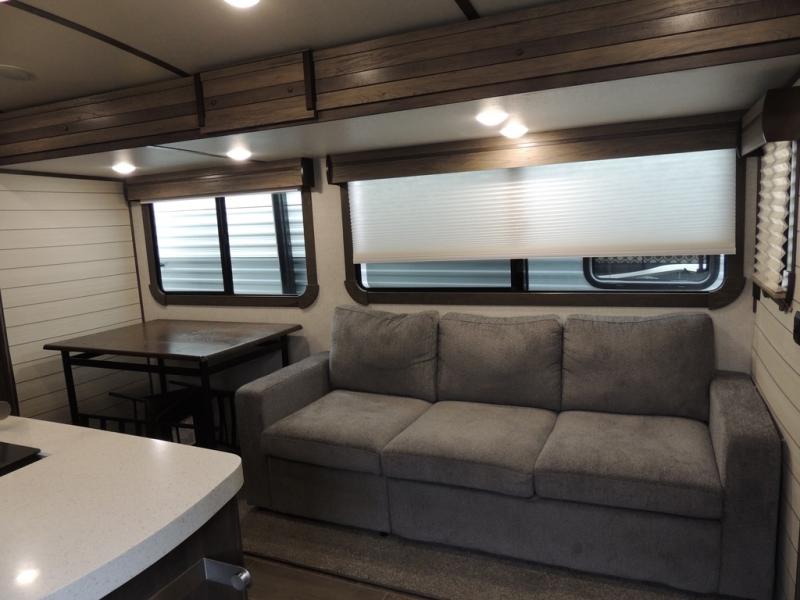After looking for the perfect travel trailer for your bigger family, your search is over! You can comfortably sleep nine people each night thanks to the private bunkhouse with two bunks and a jack knife sofa, the king bed in the front bedroom, and the tri-fold sofa and XL dinette. This model features a walk-through bath that leads to the front bedroom and a convenient half bath with it's own exterior entry door! Cook dinner on the outside kitchen after preparing the meal using the counter space on the kitchen island and maybe make more food inside with full amenities.