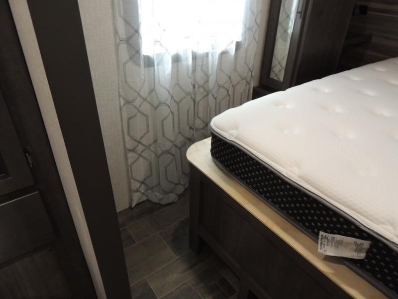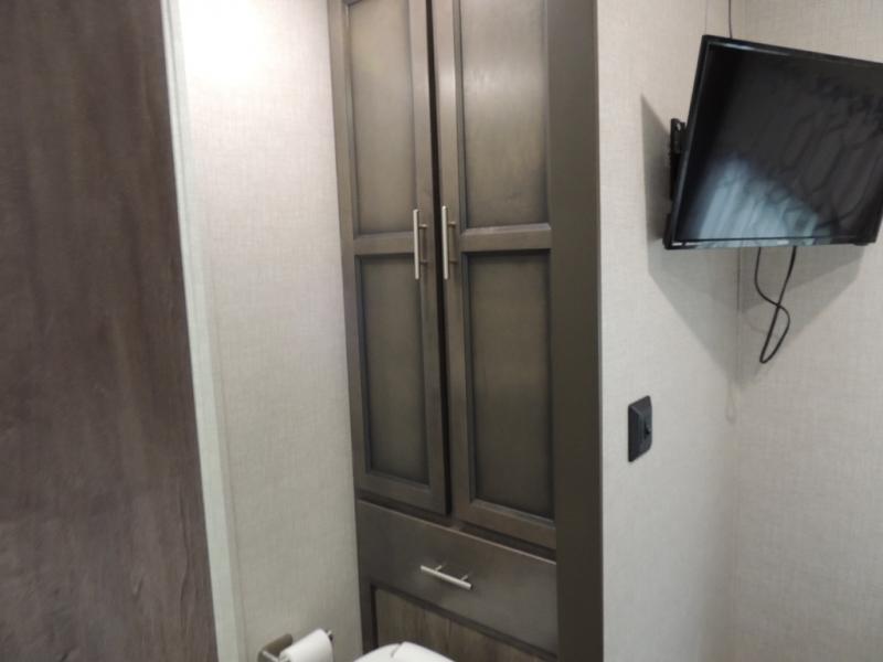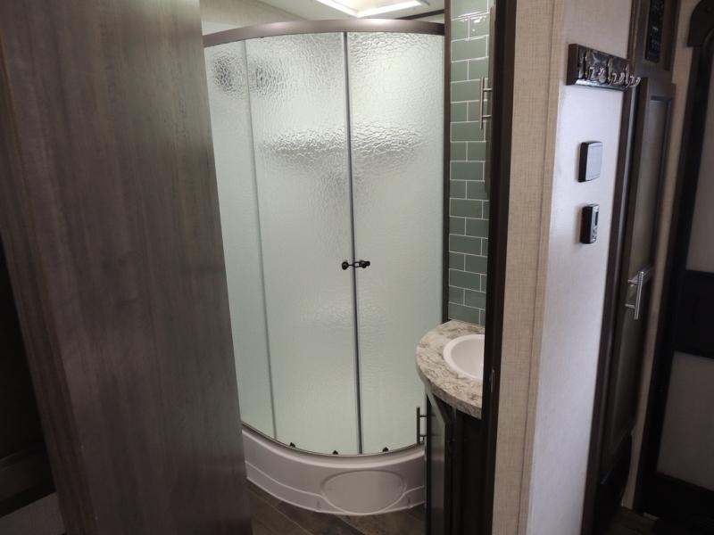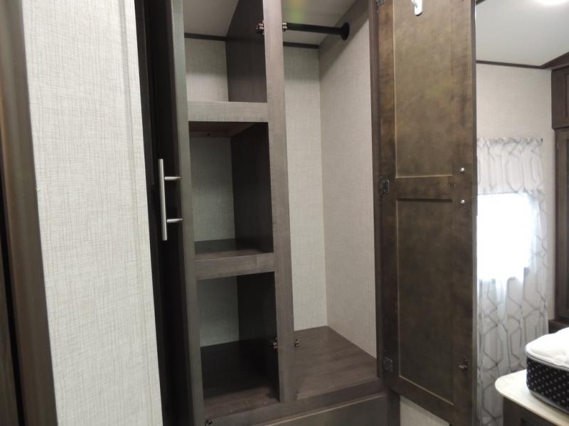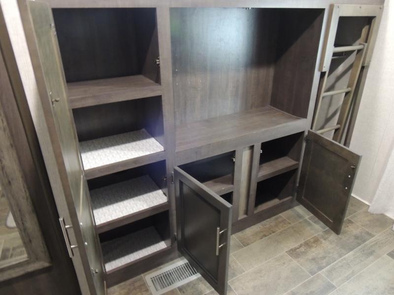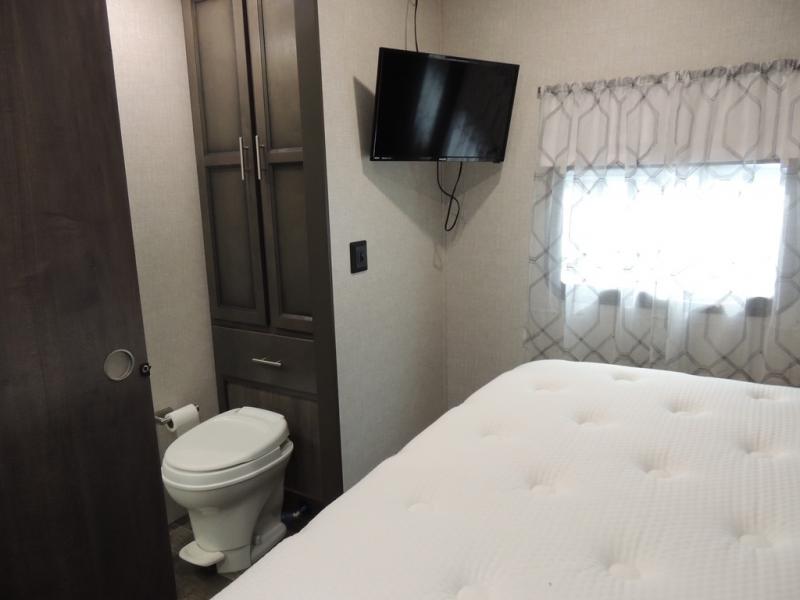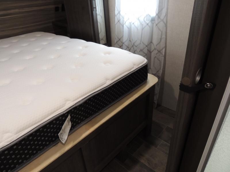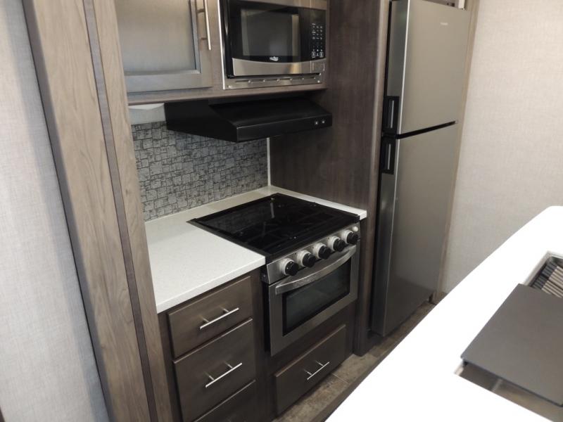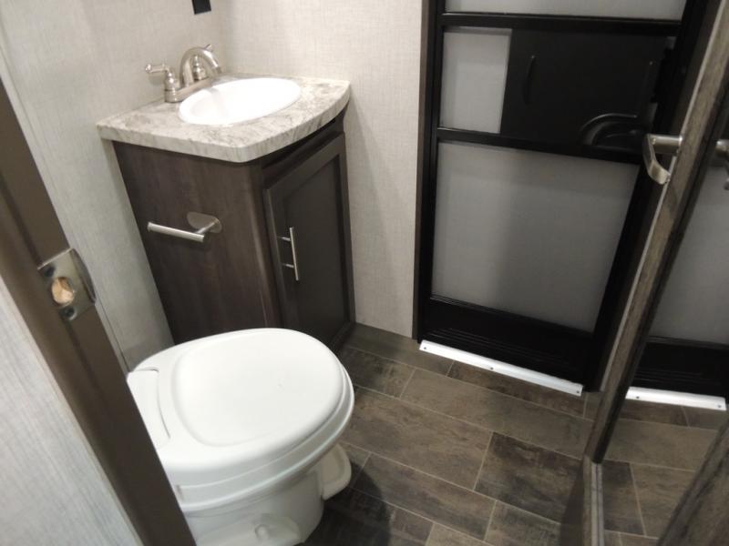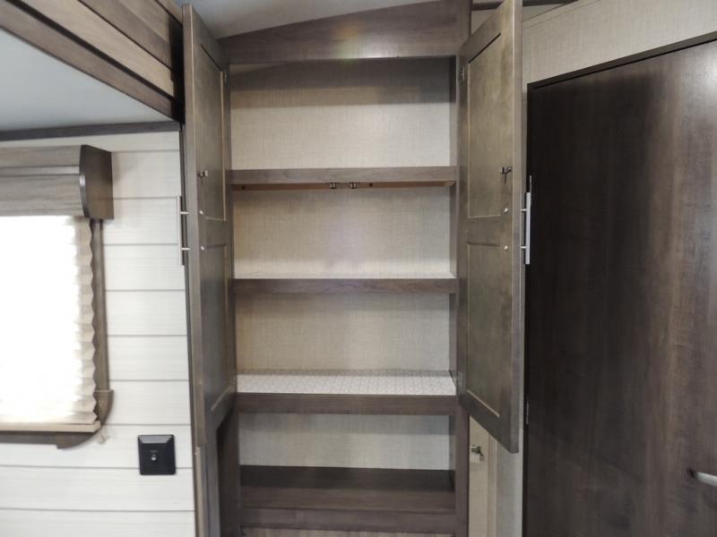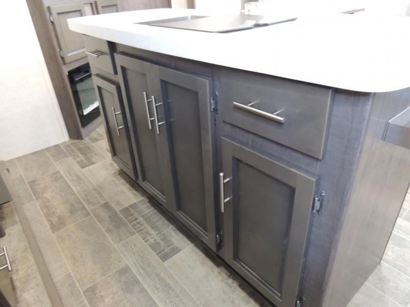 After looking for the perfect travel trailer for your bigger family, your search is over! You can comfortably sleep nine people each night thanks to the private bunkhouse with two bunks and a jack knife sofa, the king bed in the front bedroom, and the tri-fold sofa and XL dinette. This model features a walk-through bath that leads to the front bedroom and a convenient half bath with it's own exterior entry door! Cook dinner on the outside kitchen after preparing the meal using the counter space on the kitchen island and maybe make more food inside with full amenities.