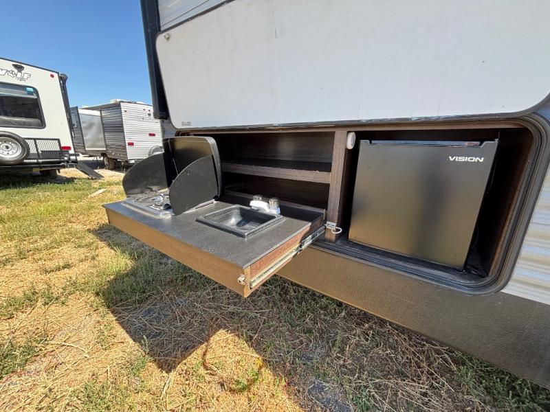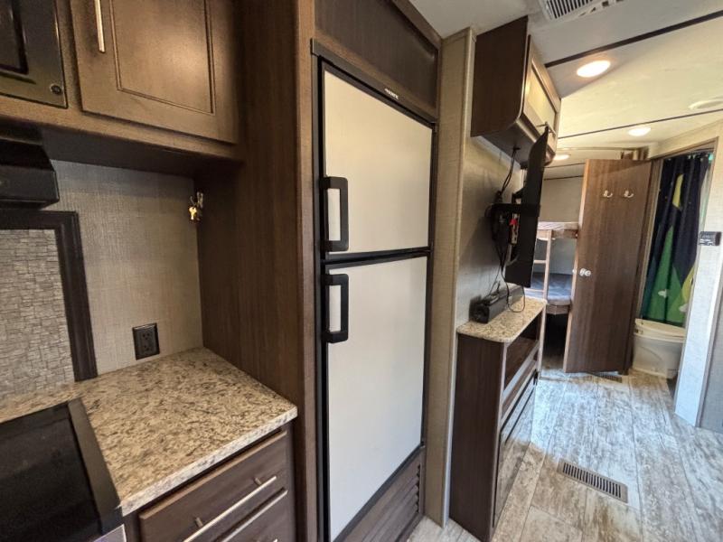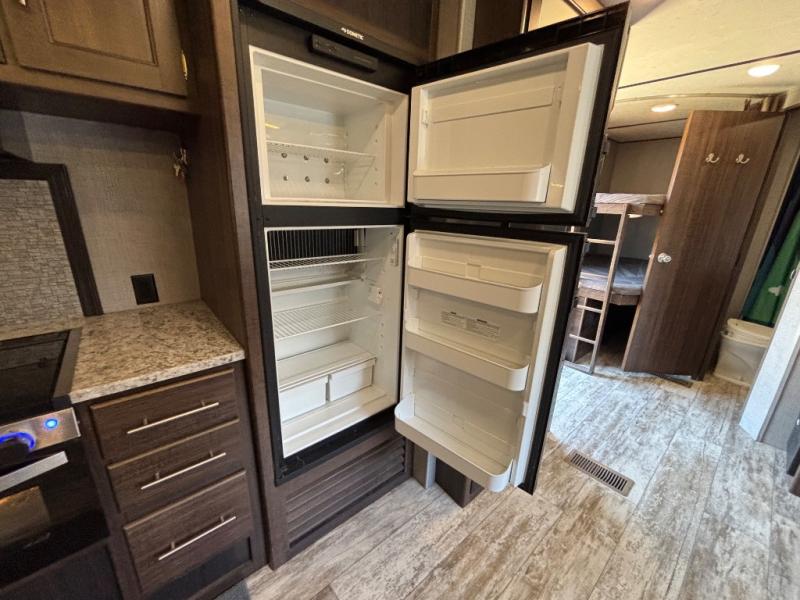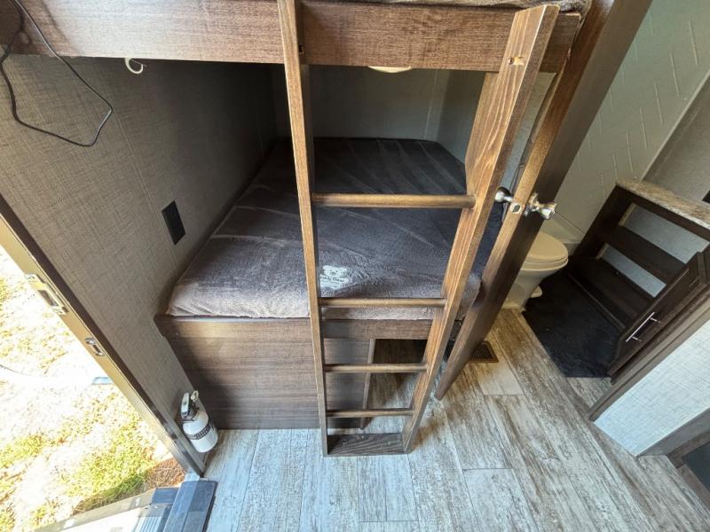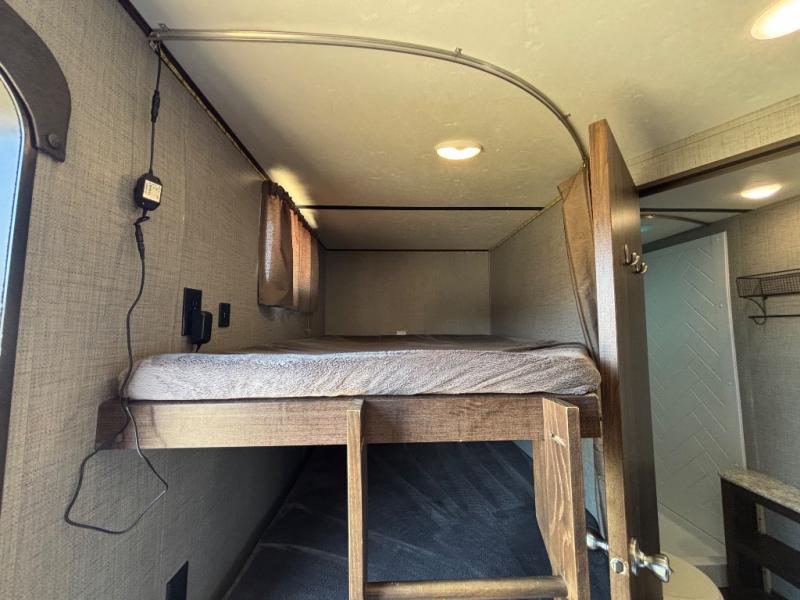 This Zinger Lite travel trailer has everything you're looking for to start your next big adventure. With room to sleep ten, you can be sure to have an unforgettable time with friends and family. The kids will love the ladder that leads to the bunk beds, and this unit features a front bedroom with an RV queen bed and two shirt closets for your clothes. Enjoy playing games around the U-shaped dinette or kick back on the sofa with a friend. Since this unit includes a single slide, you can enjoy extra space to move around freely. You'll love the kitchen with a refrigerator, generous counter space, and a pantry for late-night snacks, plus a bonus outdoor kitchen!