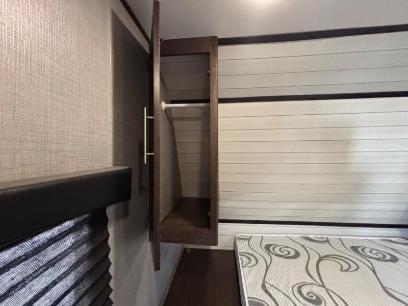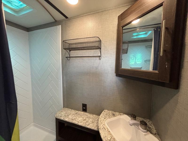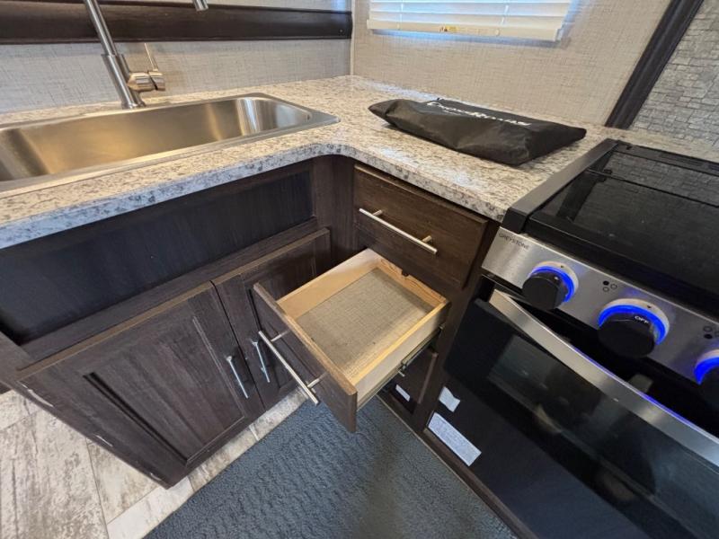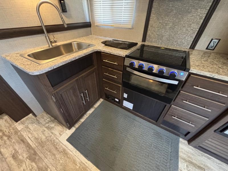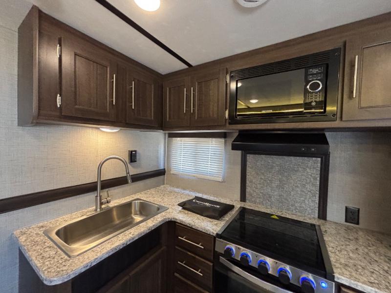 In each Zinger Lite travel trailer, you will find generous storage compartments for all your valuables and comfortable features to make each camping trip enjoyable. You'll enjoy the AM/FM Stereo with Bluetooth and the LED lighting and designer valances will make you feel right at home. The chef of the family will love the Zinger Lite kitchen with its Maple cabinet drawers, stainless steel sink and high rise faucet. Each model includes a mirrored medicine cabinet to store all your necessities, and the bedspread in the bedroom will provide a comfortable night's rest!