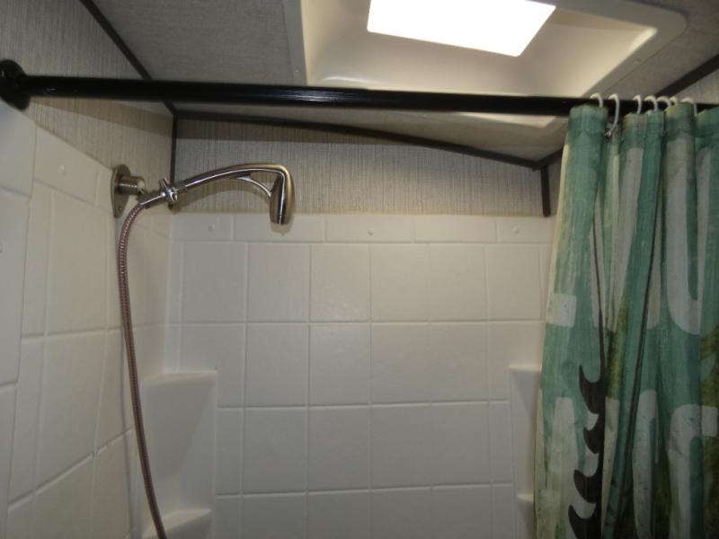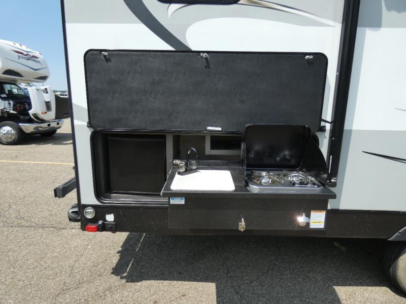 When you are daydreaming about camping with your family, stop and imagine yourself in this MPG travel trailer. Your kids will surely be sleeping on the double-size bunks with their friends while you lie on the king-size bed in the private bedroom. The kids will probably like the fact that your bedroom is on the opposite side of the trailer when they stay up late giggling. The convenience of a full bath next to the bunks allows you to pass on using the public facilities and the kiddos to be close to the bathroom at night. You can make meals on the outside kitchen while visiting with your camping friends around the campsite or inside with full kitchen appliances.