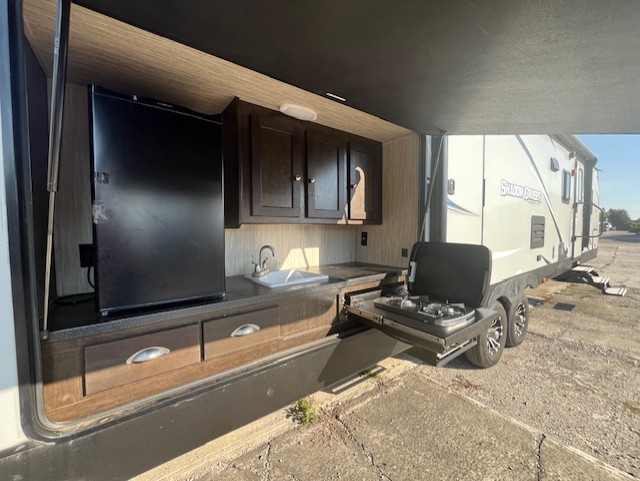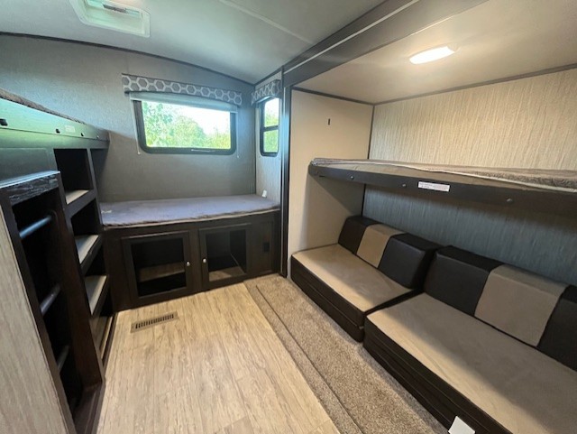 For a truly fun and relaxing camping trip, choose this double-slide Shadow Cruiser travel trailer. The kids will love having their own space in the private bunkhouse that features a folding futon and bunk beds. The front private bedroom includes a queen bed that is perfect for a good night's rest. This unit includes a dinette and a sofa within the living room slide out. You can cook dinner inside on the three-burner range, or you can grill up some burgers using the outside kitchen. This travel trailer also includes two entry doors for easy access.