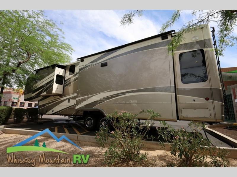 THE EXTERIOR COLOR IS DRV'S PLATINUM HAZE FULL BODY PAINT PACKAGE WITH FULL CLEAR COAT - SLIDE SIDES ARE NOT PAINTED. THE INTERIOR IS REGENCY WITH LATTE CABINETRY AND ASPHALT FLOORING.