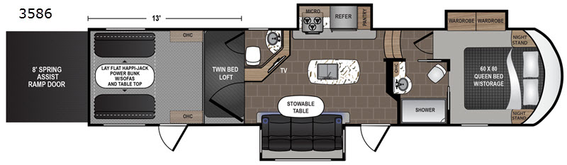 Looking for the ultimate fifth wheel to accommodate the family's wish list? This layout offers a separation from the garage and the main living/kitchen area allowing the kids to have their own space once the toys have been unloaded. They will love the sofas and table below the power bunk as well as having their own half bath. You will find more sleeping space on the sofa and twin bed loft in the main living area. The cook can make meals at the kitchen island while watching the LED TV. Everyone will appreciate the triple slides throughout allowing more floor space to move around especially on those rainy days. Come see what else makes this the perfect toy hauler for your family!