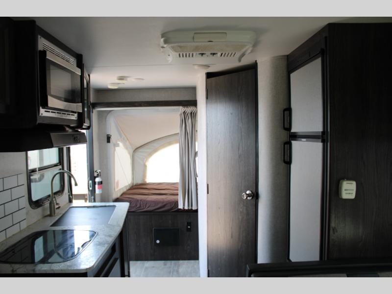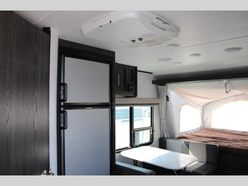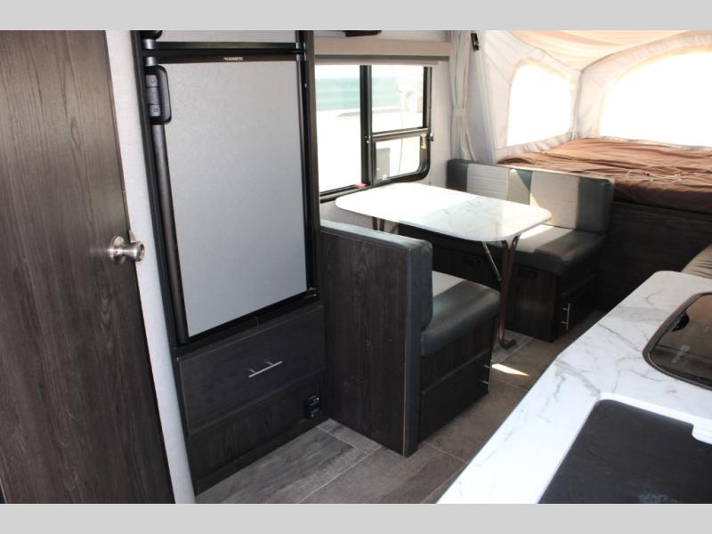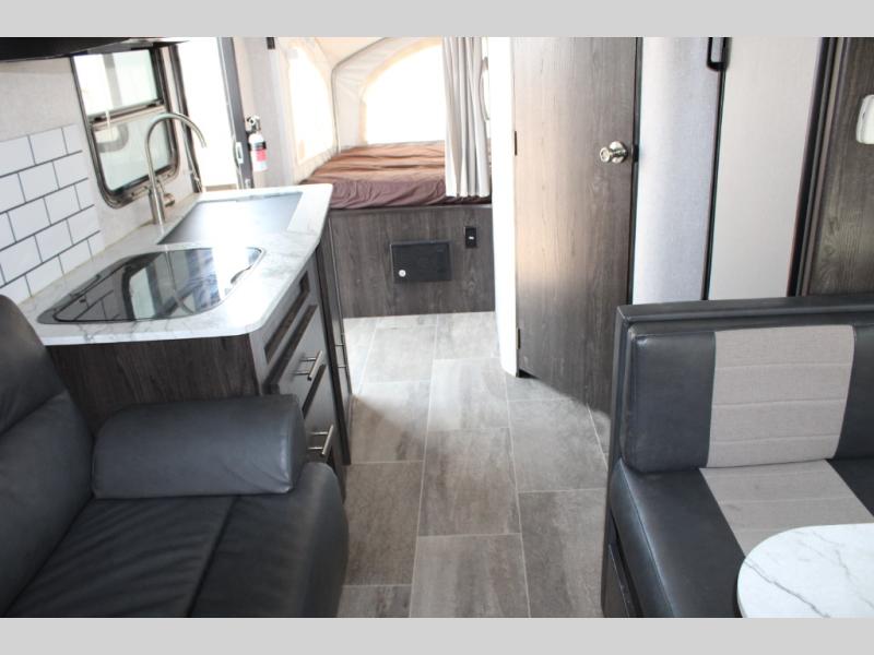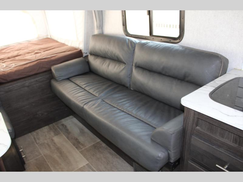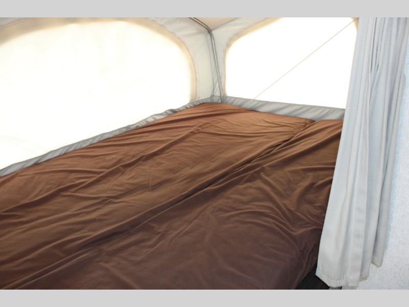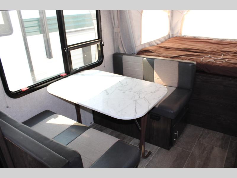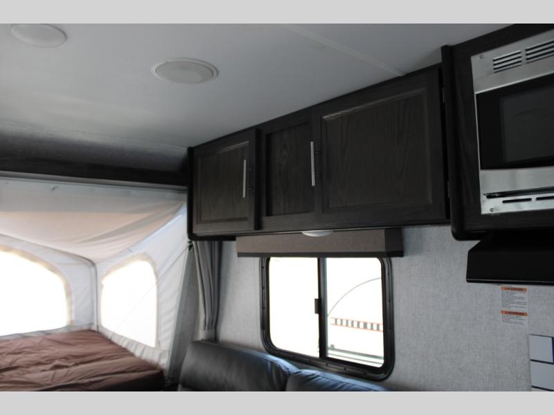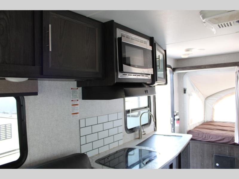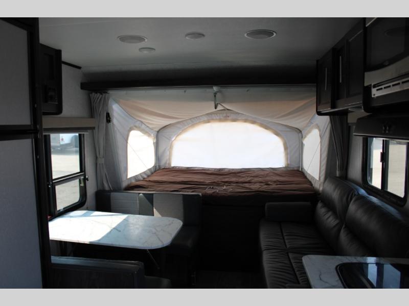 Camping just got easier with this ready-to-go expandable. Last-minute plans are acceptable to make because of its ultra-light technology and fully-loaded interior. Once you load up all of your camping essentials, you can head out to find your favorite campsite. The two queen tent beds provide a cozy and comfortable place to sleep each night, and the full bathroom allows you to skip using the public facilities. During the day, just imagine visiting with family and friends relaxing on the sofa or booth dinette in the living area while dinner is being prepared in the kitchen with full amenities. You will find shelves and cabinets throughout to store all your things. Take a look!