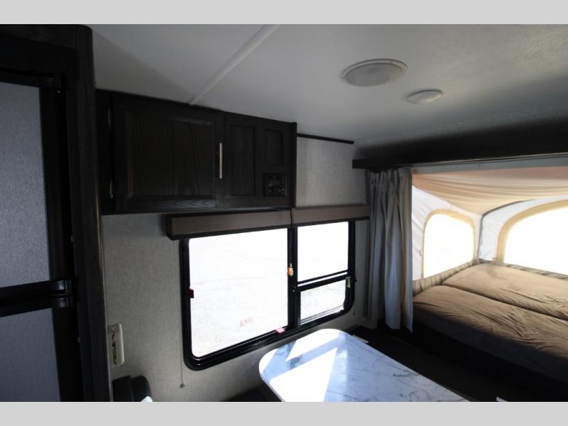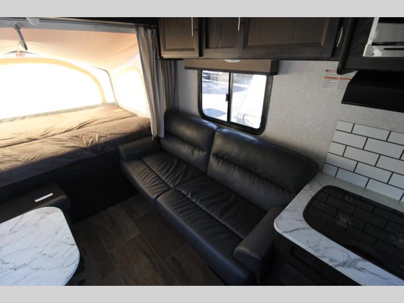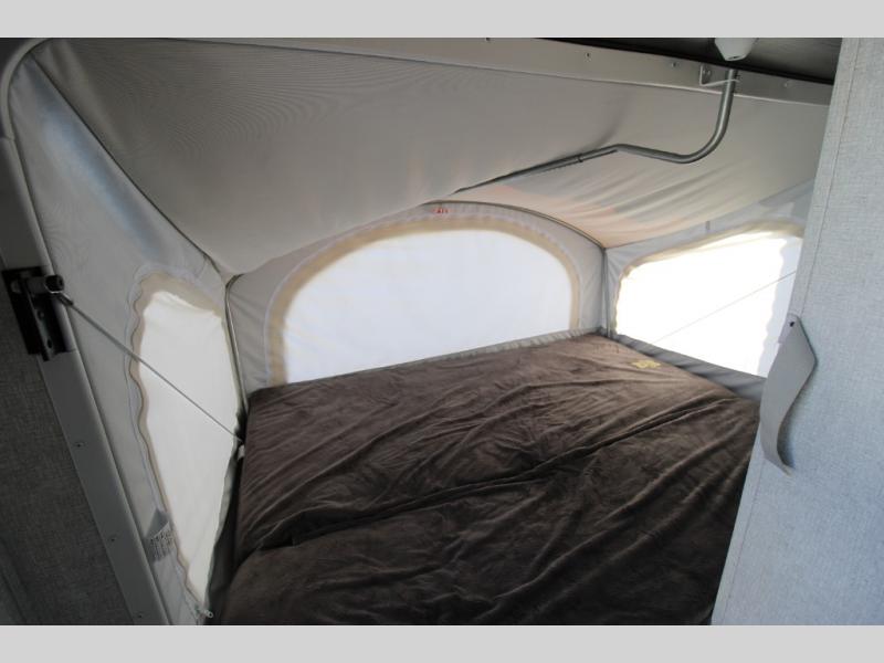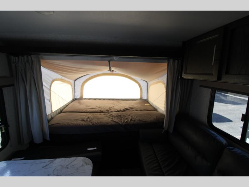 Camping just got easier with this ready-to-go expandable. Last-minute plans are acceptable to make because of its ultra-light technology and fully-loaded interior. Once you load up all of your camping essentials, you can head out to find your favorite campsite. The two queen tent beds provide a cozy and comfortable place to sleep each night, and the full bathroom allows you to skip using the public facilities. During the day, just imagine visiting with family and friends relaxing on the sofa or booth dinette in the living area while dinner is being prepared in the kitchen with full amenities. You will find shelves and cabinets throughout to store all your things. Take a look!