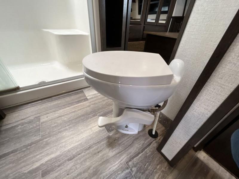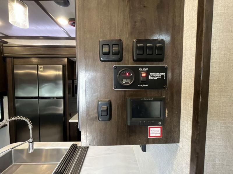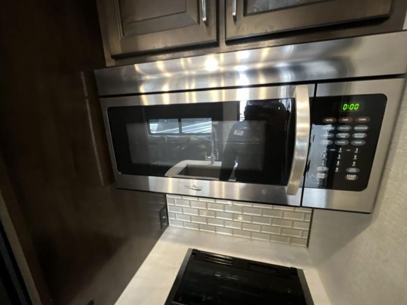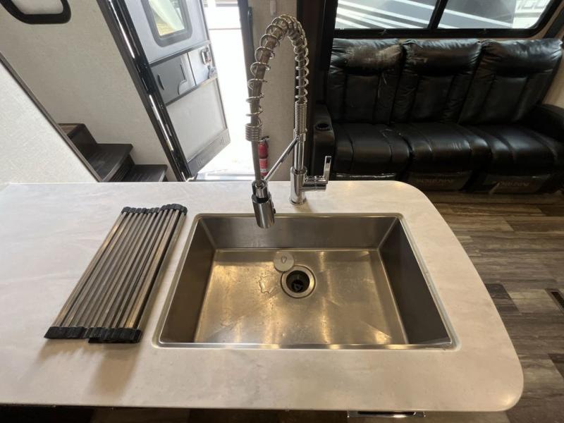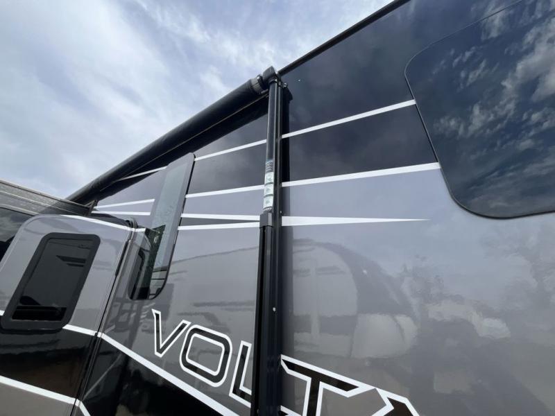 Not all toy haulers are created equal! The Voltage fifth wheel toy hauler by Dutchmen RV offers luxury living and a separate toy box giving you the ultimate experience every time! The interior offers hardwood cabinet doors, upgraded Beauflor linoleum, a heated and massaging residential sofa, and a stainless steel farmer's sink in the kitchen. The garage includes Tuff Ply flooring, 2,500-lb. tie downs secured to the frame, a 12" diamond plate along the garage wall, a Zero-G ramp door, and outside there is a 20-gallon fuel station and a 30-gallon fuel tank to supply your generator. You might get the mobile app to add to the iN-Command remote panel that gives you access to the lights, the generator, the climate systems, and more!