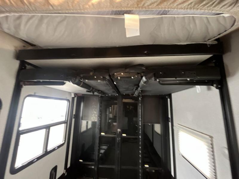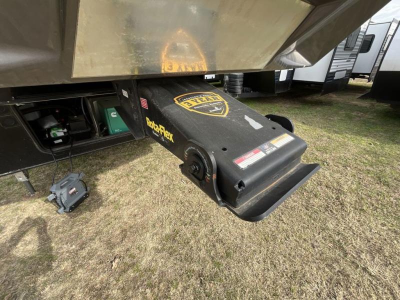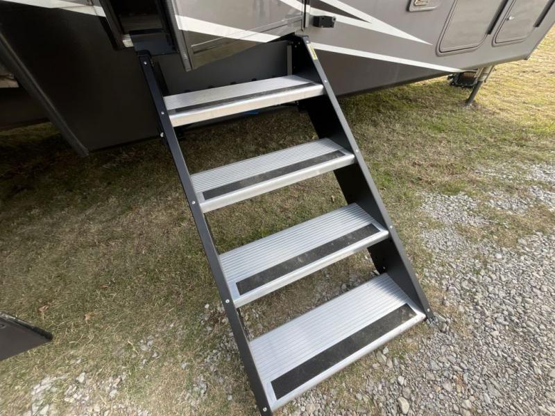 Load up and head out to the off-road park of your dreams where you can easily set up this Voltage toy hauler to relax in comfortably after hitting the trails. You will have a master suite with a king bed and plenty of storage, plus a private entry into the full bathroom. You can relax in the main living and kitchen area on the large sofa slide while watching the 50" TV and staying cozy from the fireplace, or you can sit on the opposing sofas with a table top in the 11' separate garage after the toys have been removed. There is a half bath and a lay-flat Happi-Jack power bunk as well, plus a patio system with zero stack up and a manual awning for an additional outdoor living space above ground.