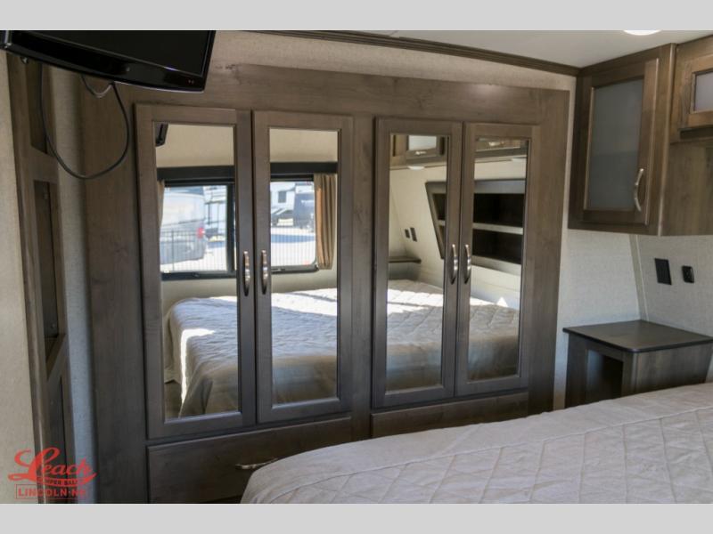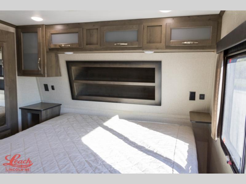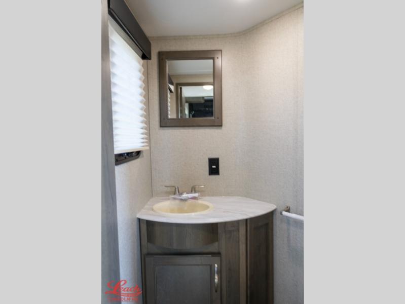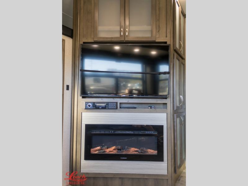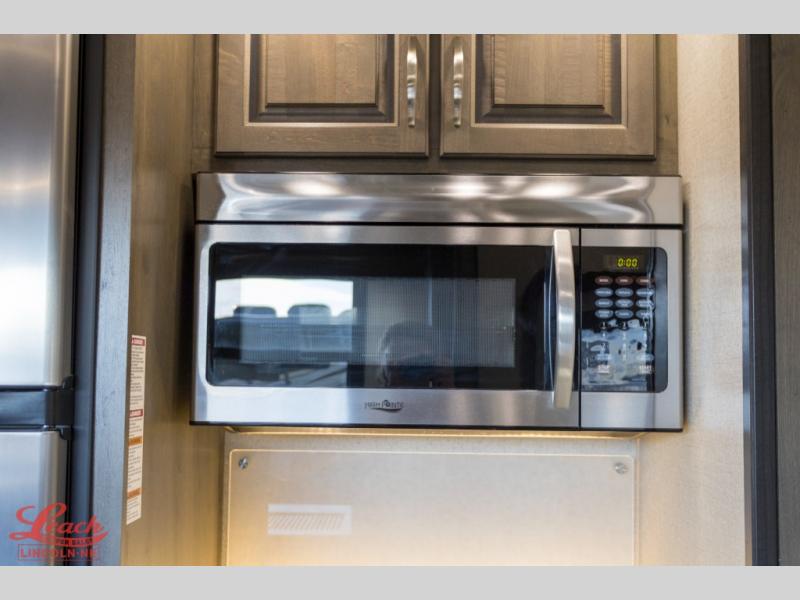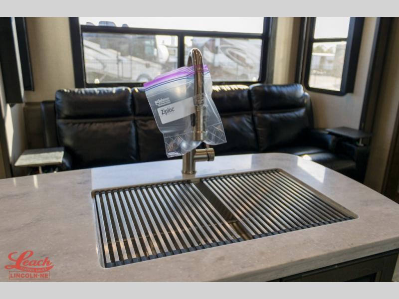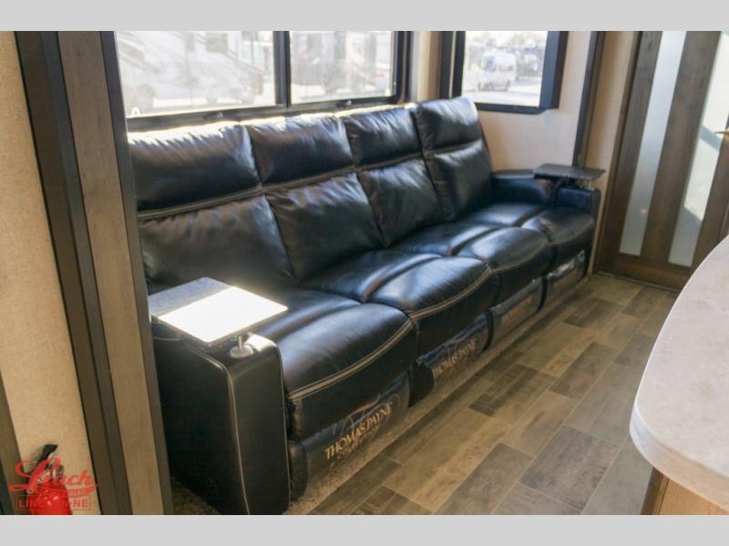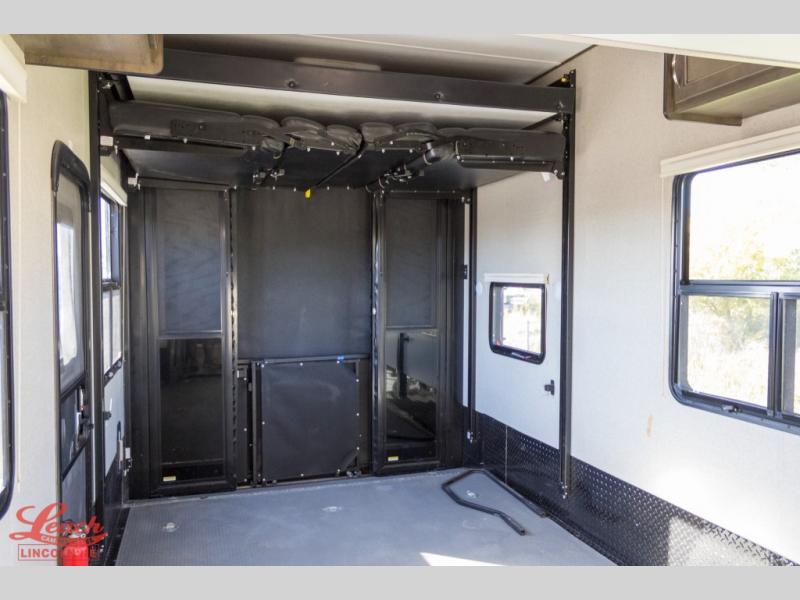 Not all toy haulers are created equal! The Voltage fifth wheel toy hauler by Dutchmen RV offers luxury living and a separate toy box giving you the ultimate experience every time! The interior offers hardwood cabinet doors, upgraded Beauflor linoleum, a heated and massaging residential sofa, and a stainless steel farmer's sink in the kitchen. The garage includes Tuff Ply flooring, 2,500-lb. tie downs secured to the frame, a 12" diamond plate along the garage wall, a Zero-G ramp door, and outside there is a 20-gallon fuel station and a 30-gallon fuel tank to supply your generator. You might get the mobile app to add to the iN-Command remote panel that gives you access to the lights, the generator, the climate systems, and more!