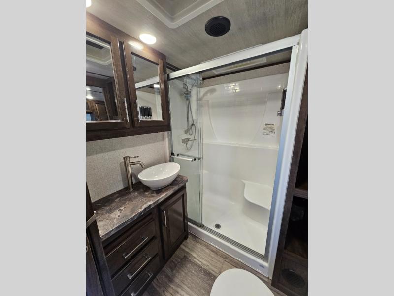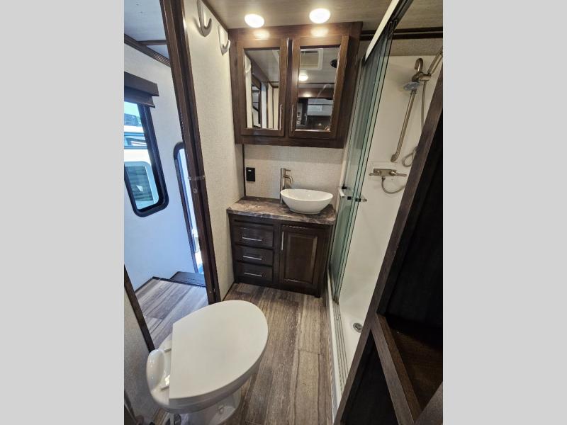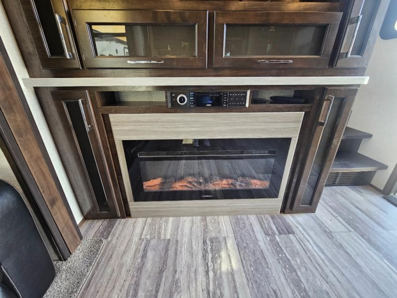 Not all toy haulers are created equal! The Voltage fifth wheel toy hauler by Dutchmen RV offers luxury living and a separate toy box giving you the ultimate experience every time! The interior offers hardwood cabinet doors, upgraded Beauflor linoleum, a heated and massaging residential sofa, and a stainless steel farmer's sink in the kitchen. The garage includes Tuff Ply flooring, 2,500-lb. tie downs secured to the frame, a 12" diamond plate along the garage wall, a Zero-G ramp door, and outside there is a 20-gallon fuel station and a 30-gallon fuel tank to supply your generator. You might get the mobile app to add to the iN-Command remote panel that gives you access to the lights, the generator, the climate systems, and more!