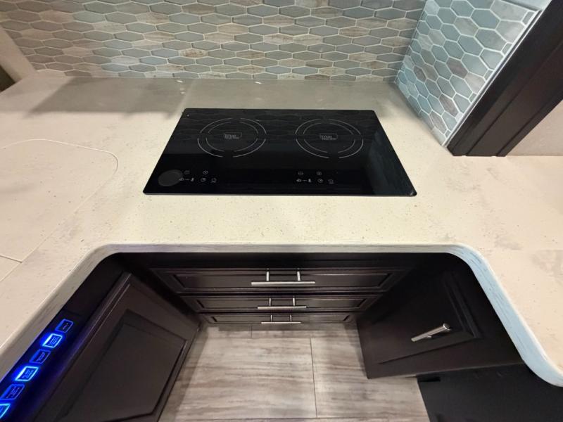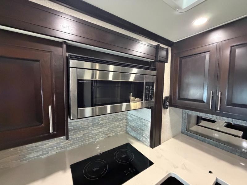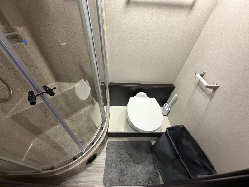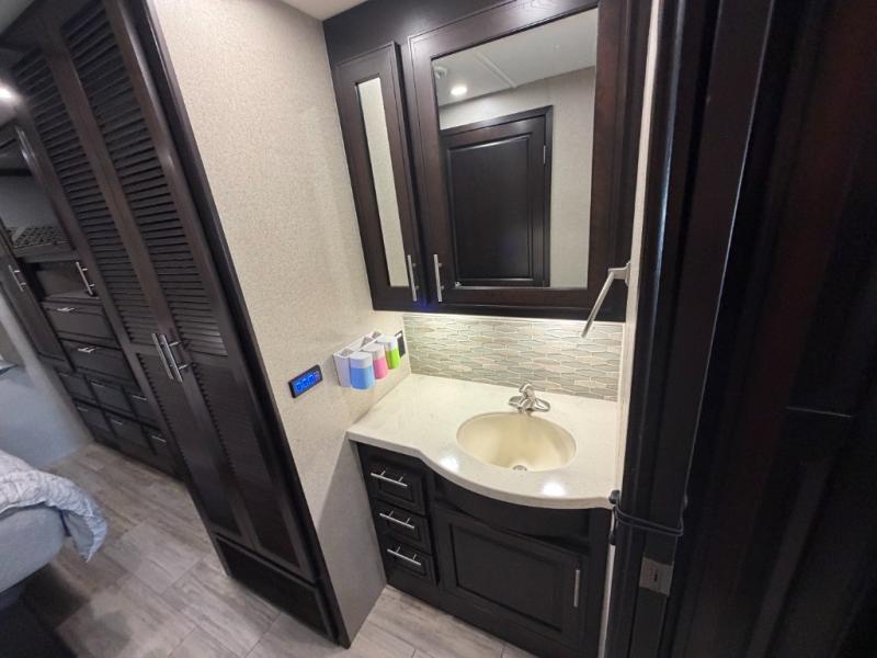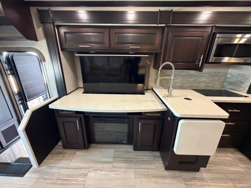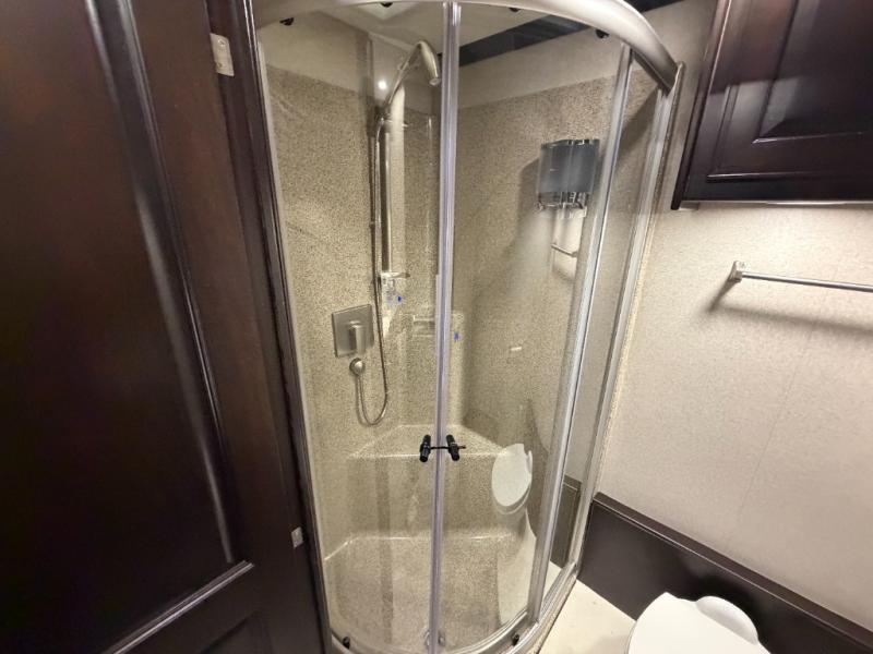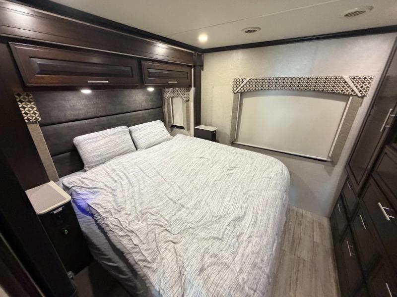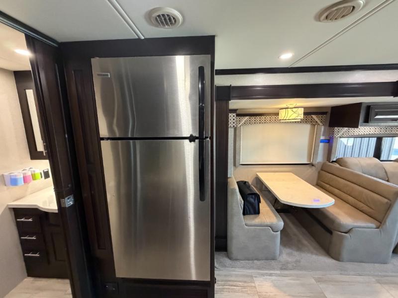 Nothing will stop you from experiencing first-class adventures with this DX3 Super C diesel motorhome! The king-size bed in the rear private bedroom will deliver the ultimate relaxation each night, and the bedroom 32" LED TV will let you watch your favorite movie before bed. Step foot into the granite-textured fiberglass shower each morning and welcome the morning sunlight through the shower skylight above. After you are all ready for the day, you can grab a quick breakfast from the pantry or spend a little more time preparing a full meal on the three-burner range.