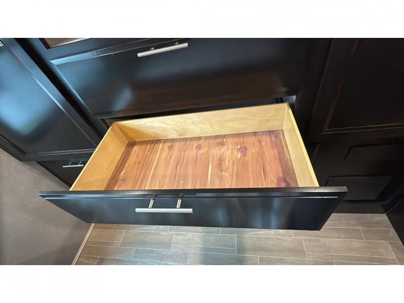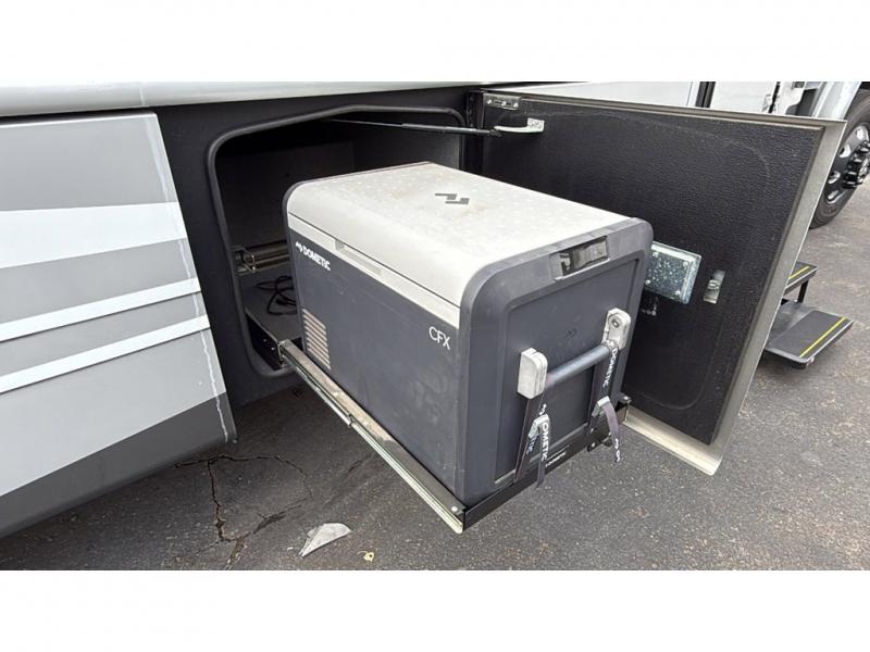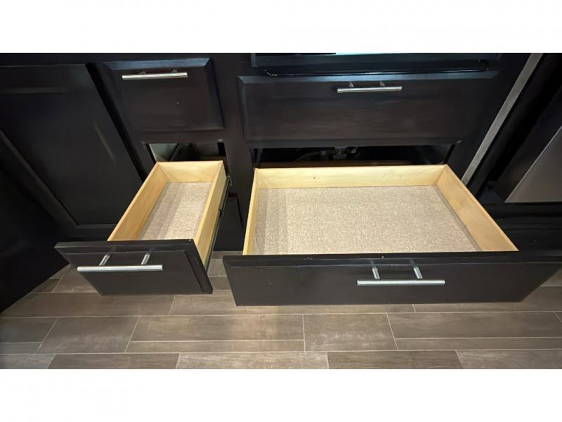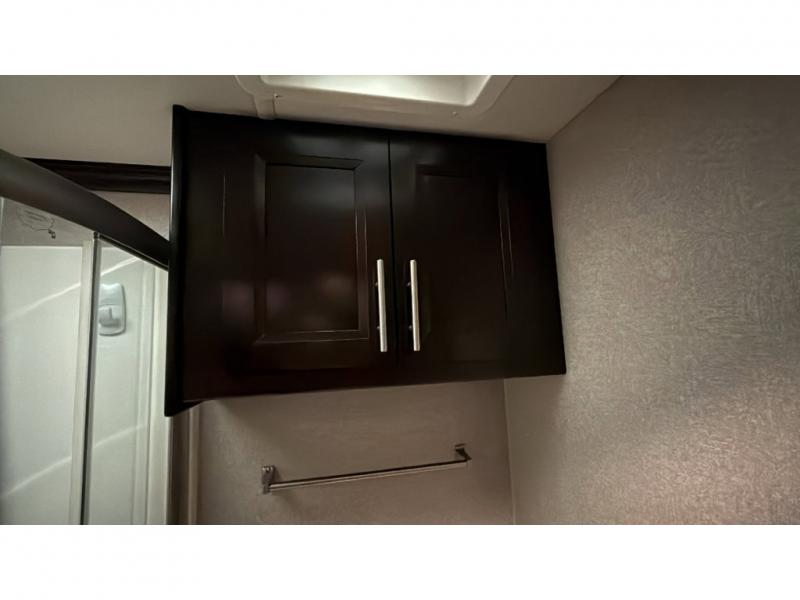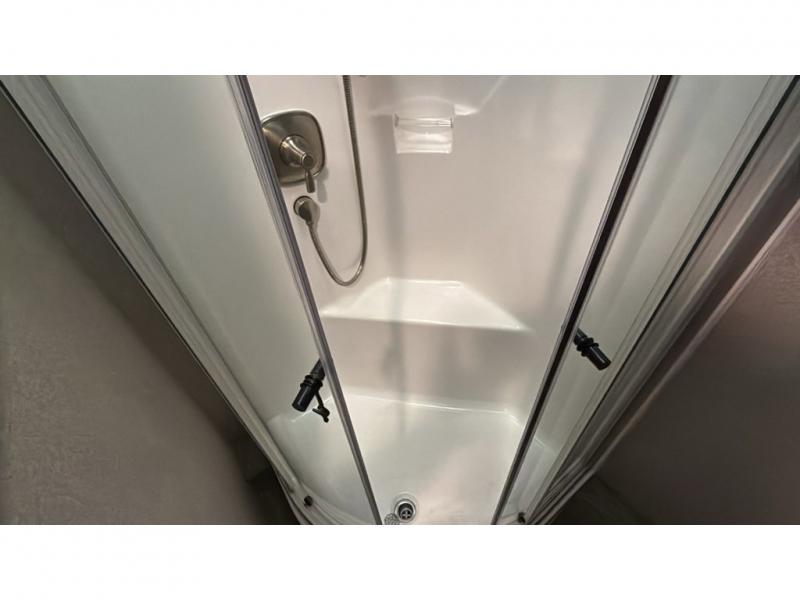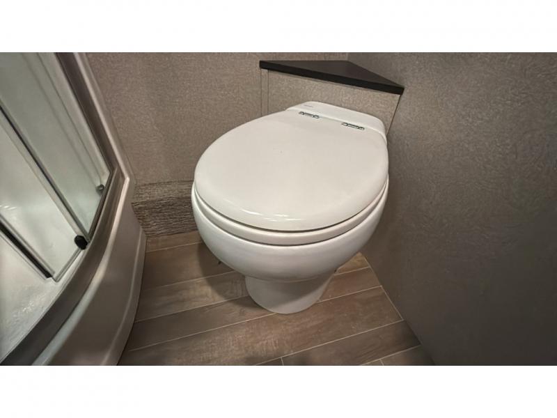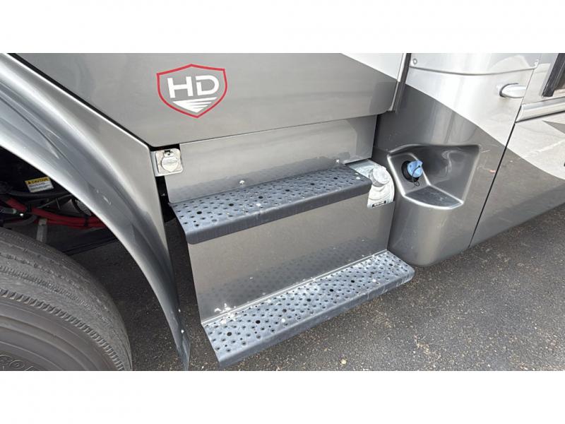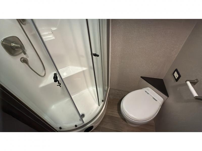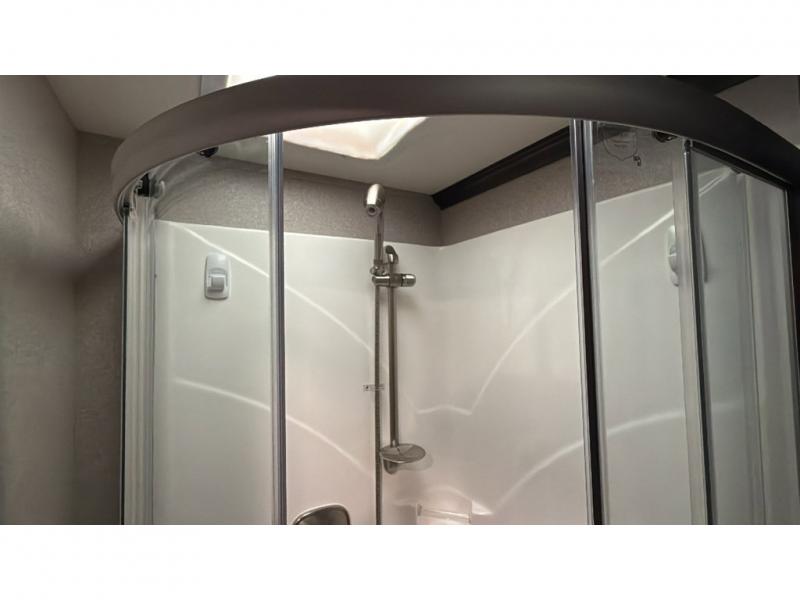 With each Dynamax Force HD super C diesel motorhome, you will appreciate seamless rotocast storage with LED lights, aluminum storage doors with paddle latches, and plenty of interior storage so you can bring all your comforts of home with you. You'll find coordinating window treatments and hardwood shaker-style cabinetry, along with LED recessed ceiling lights and under-cabinet lighting in the kitchen. Sleep peaceful each night on a king bed that features a deluxe padded headboard and a designer bedding package and the LED reading lights allow you to enjoy your favorite book before bed. These models also include an Oxygenics Body Spa RV shower head, a glass shower door, and a shower skylight so you can clean up everyday just like you would at home.