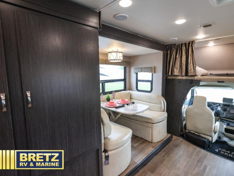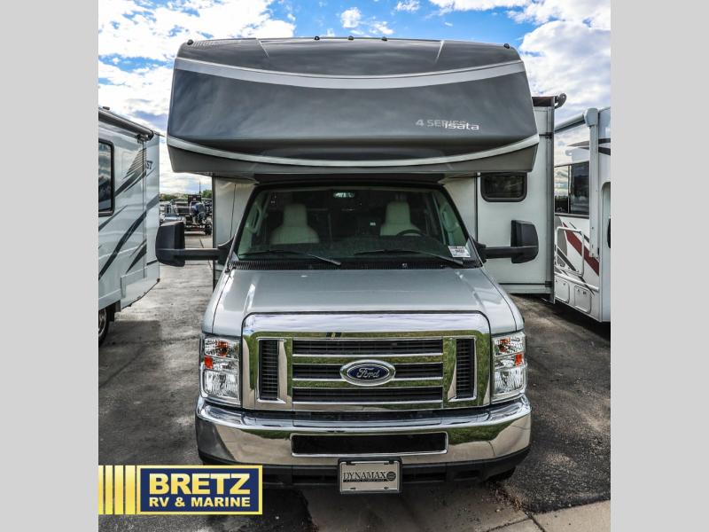 Each isata 4 class C motorhome by Dynamax has been constructed with 1 1/2" aluminum-framed, laminated sidewalls with block foam insulation. an aluminum-framed floor, and Front End Diamond Shield paint protection for a strong unit that will last for years to come. The seamless rototcast storage compartments with LED lighting can hold all of your gear and the electric awning with LED lights will be the perfect spot to sit under each evening as you enjoy the sunset. Inside you'll appreciate the 7 cu.ft. 2-way refrigerator with a side pantry, solid surface countertops, MaxxAir Power Vents in the galley and bath, and USB charging ports to keep all of your gadgets connected.