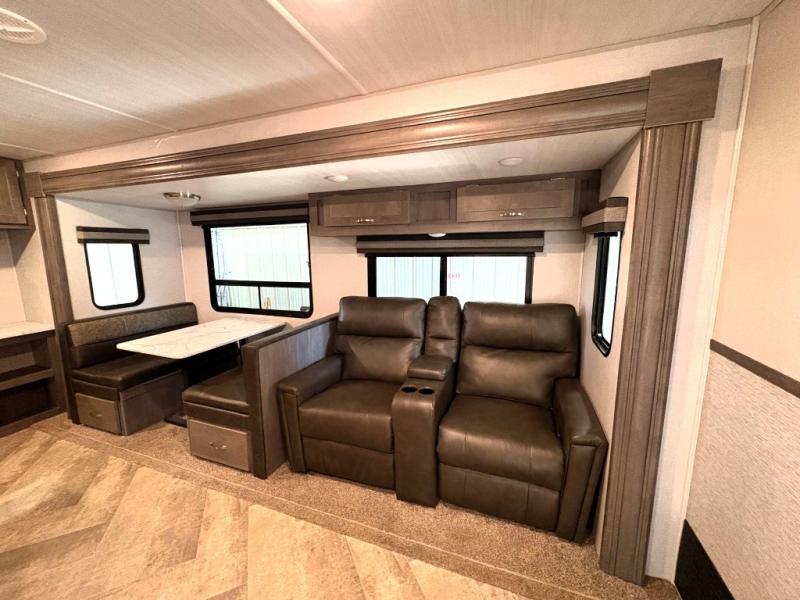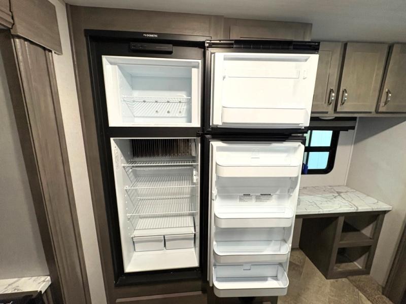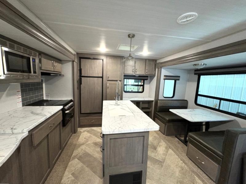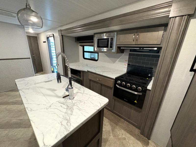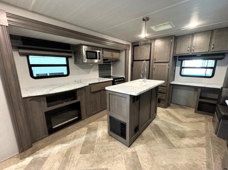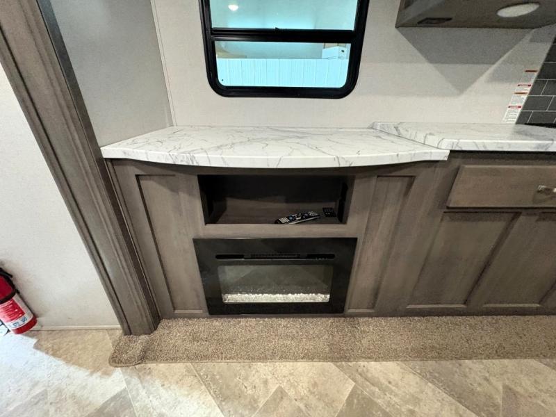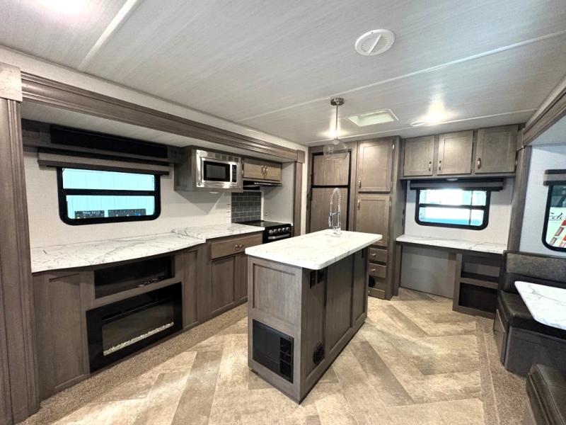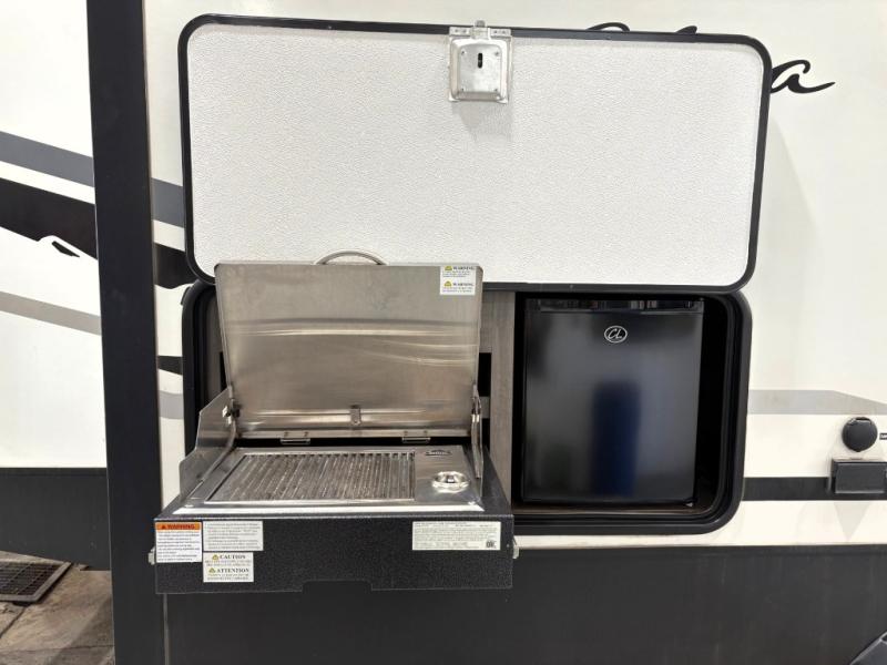 Set your sights on this Alta travel trailer that features dual opposing slides in the main living area, and the convenient desk in the rear allows you to telecommute if you need to. This model includes a kitchen island which will make it feel more like home, and the 40" TV across from the tri-fold sofa allows your family to watch your favorite shows. There is even a fireplace for those chilly spring evenings. Prepare dinner inside on the three-burner cooktop or outside at the outdoor kitchen, and the 21' power awning with LED lights will create a nice atmosphere as you plan out your next day.