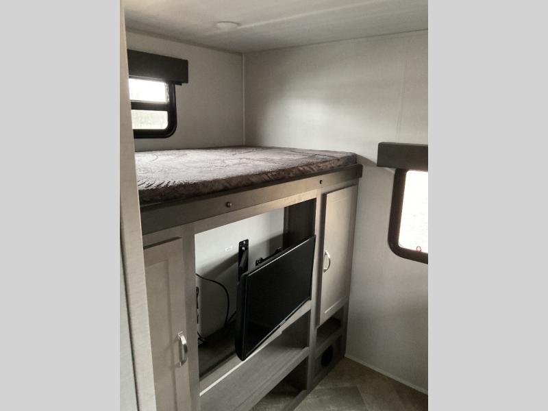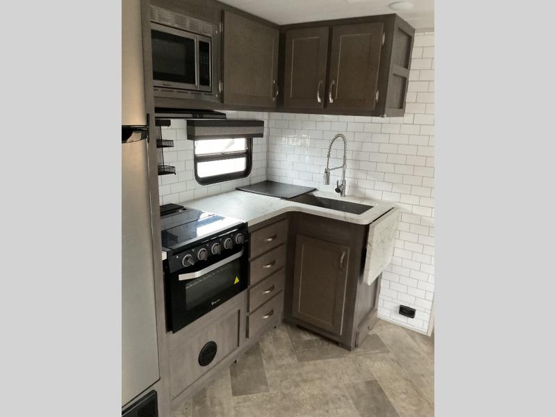 If you've been looking for a trailer with ample space that allows you to invite the whole family along, look no further than this Alta travel trailer. Beginning with having two entry doors with one entrance leading into the kitchen/living area and the other exterior entry leading into the bath for convenience. There is also a hallway with coat hooks just as you exit the bath where the kids can place their jackets and things. The rear bunkhouse will be great for all the kids, and since it includes a slide out, they'll have extra floor space to play indoors. The inside kitchen amenities will allow the cook to prepare and make any meal, plus the outside kitchen allows the outdoor chef to help with side dishes and such.