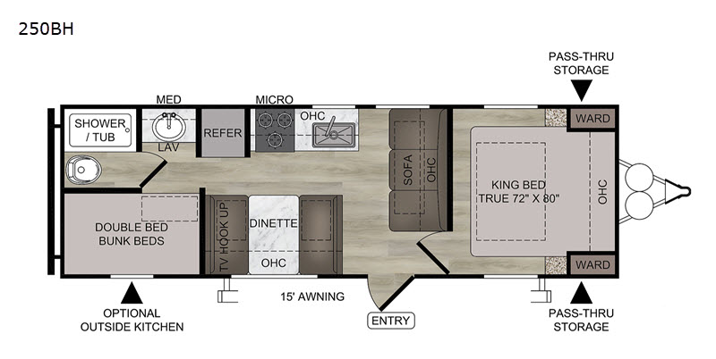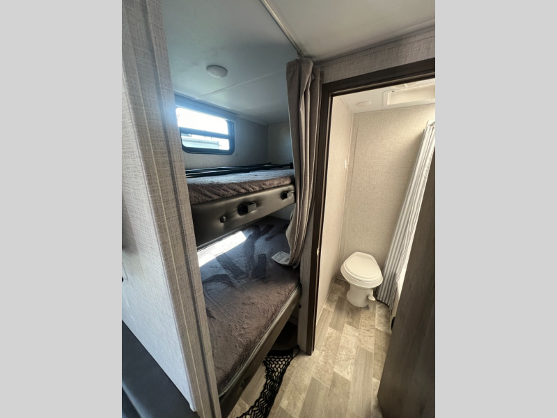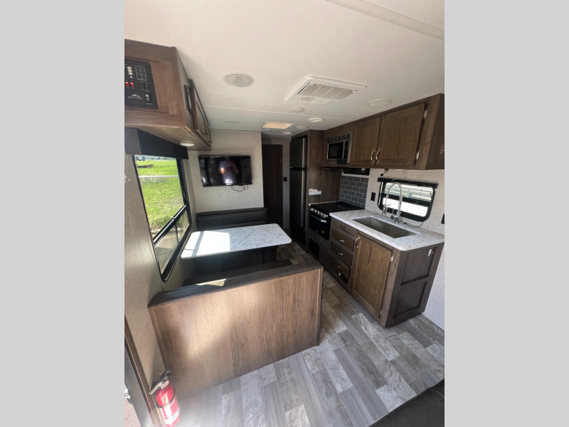 Where will your next scenic destination be with this Della Terra travel trailer? You'll be able to explore your favorite mountain range or hike within your state's local park while still enjoying home-like comforts at the end of the day. The king-size bed will provide the ultimate relaxation throughout the night, and the double-size bunks will provide such a fun experience for your kids. You will be grateful that the private toilet and shower/tub room with bath sink just outside the door is located right next to the bunks so that your kids don't have to wander far in the middle of the night. When the sun rises, you can all come together with a hot breakfast at the booth dinette and sofa. And you might like to add the optional outside kitchen for more choices when cooking.