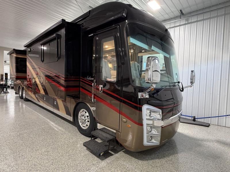 Your days will be filled with fun and sun when you take this Anthem Class A diesel motorhome out on the road! The full and half bath provide plenty of convenience for both you and your guests, and since the full bathroom is located within the rear master suite, you'll be able to spend your nights in complete luxury. Your friends will appreciate the hide-a-bed sofa for its comfort, and with the two sets of opposing slides, everyone will have enough space to spread out at night.