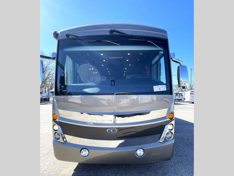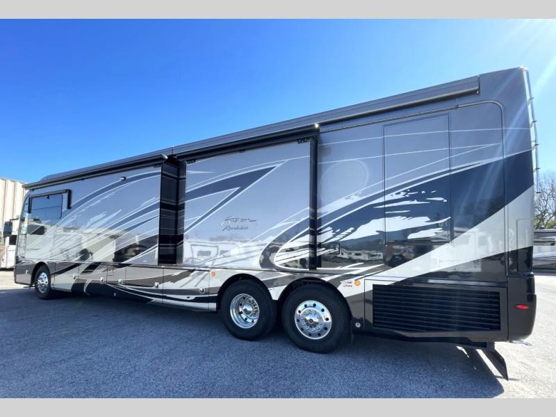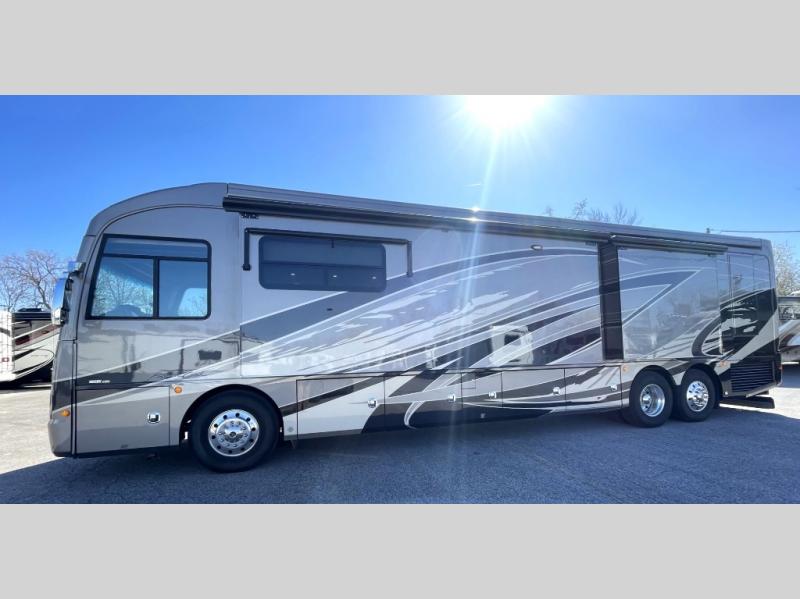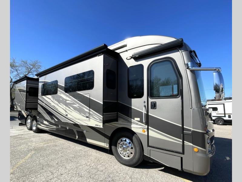 Experience a legacy of luxury with any one of these Revolution Class A diesel motorhomes by American Coach! Each model comes with rigid construction standards and the latest technology like the Liberty Bridge® chassis, the push-button start, and the LCD digital dash with a 10-inch monitor. With an independent front suspension and an UltraSteer® B-series with passive steer, you can be in ultimate control. Inside, you'll enjoy the solid wood cabinetry, solid surface countertops, and residential appliances. All of your entertainment needs will be met with a TV in the living area, bedroom, and exterior, plus the JBL soundbar will allow you to enjoy your favorite action movie to the fullest! Another great feature that you will find is the Aqua-Hot 400D heating system which works to create an even and perfect temperature all throughout the coach by using tubing to run hot liquid into heat exchangers that disperse the heated air, and it also creates a readily available and continuous supply of hot water for taking showers and doing dishes. It's time you revolutionized the way you travel with an American Coach Revolution Class A diesel motorhome!