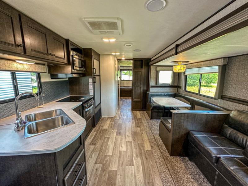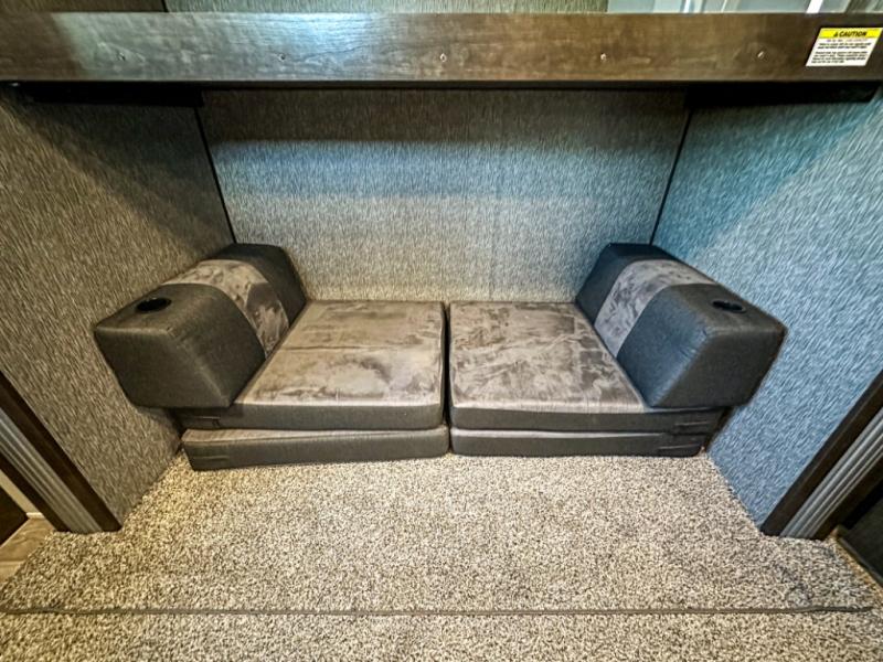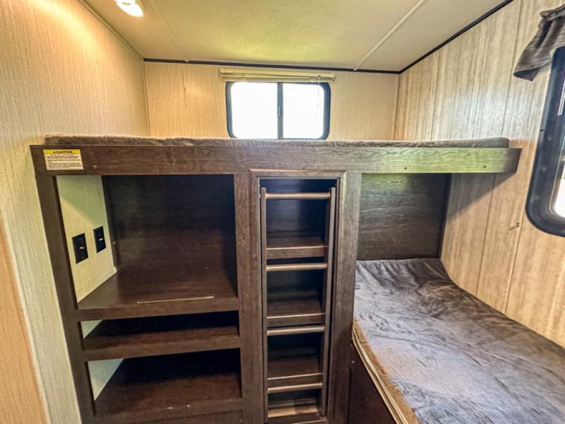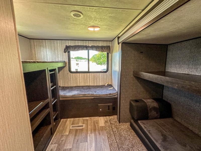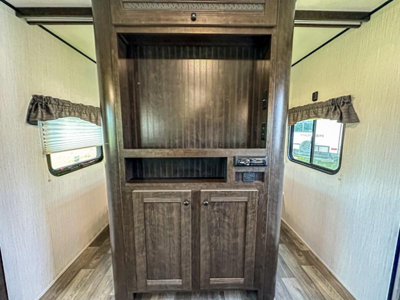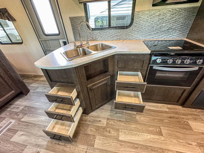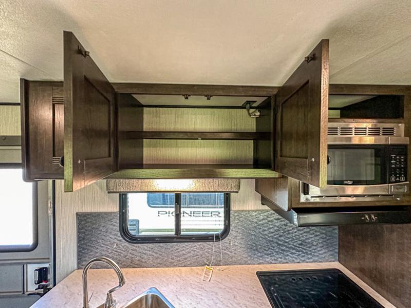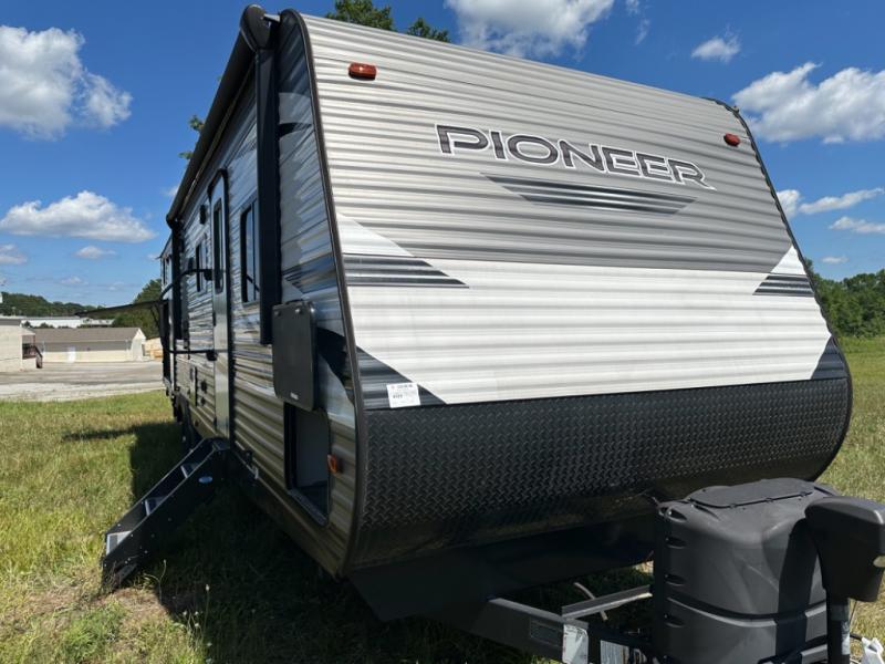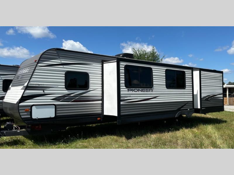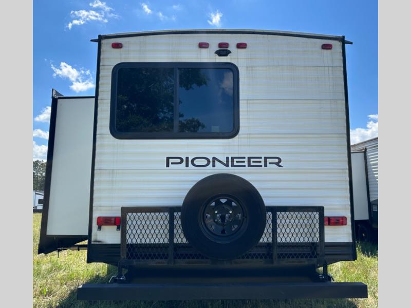 Accommodating, spacious, and comfortable are just a few of the ways you could describe this Pioneer travel trailer! From the private bunkhouse in the back to the private bedroom in the front, this trailer gives you plenty of separated living space to enjoy your time exploring. As you sit down for breakfast at the U-shaped dinette and grab a second cup of coffee, you will appreciate having extra floor space with the large electric-powered slide in the central living area.