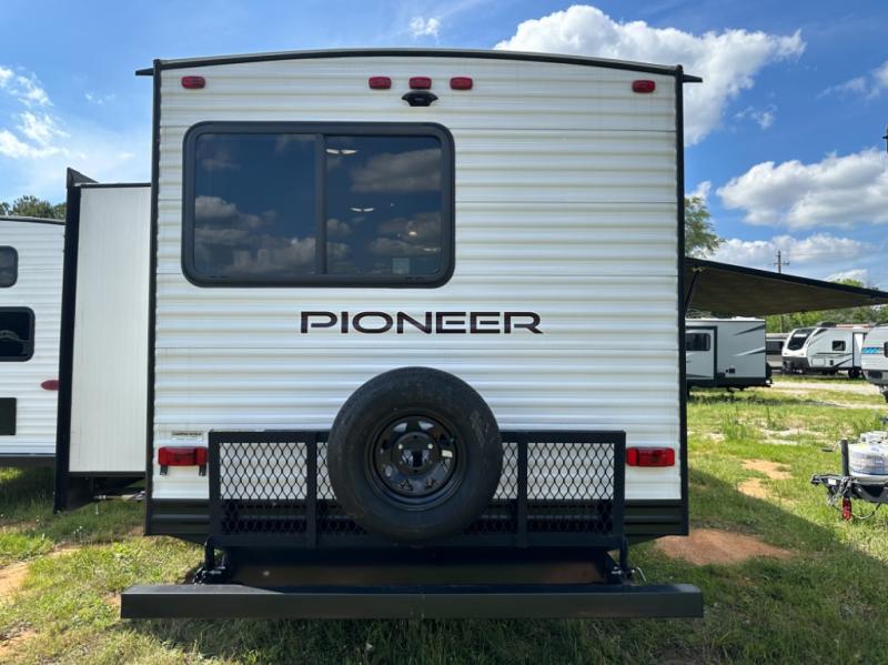 Accommodating, spacious, and comfortable are just a few of the ways you could describe this Pioneer travel trailer! From the private bunkhouse in the back to the private bedroom in the front, this trailer gives you plenty of separated living space to enjoy your time exploring. As you sit down for breakfast at the U-shaped dinette and grab a second cup of coffee, you will appreciate having extra floor space with the large electric-powered slide in the central living area.