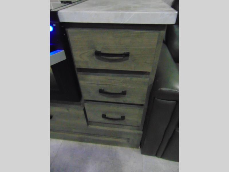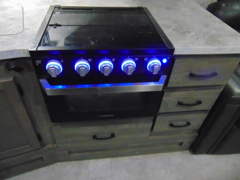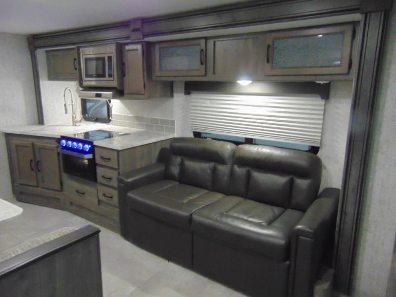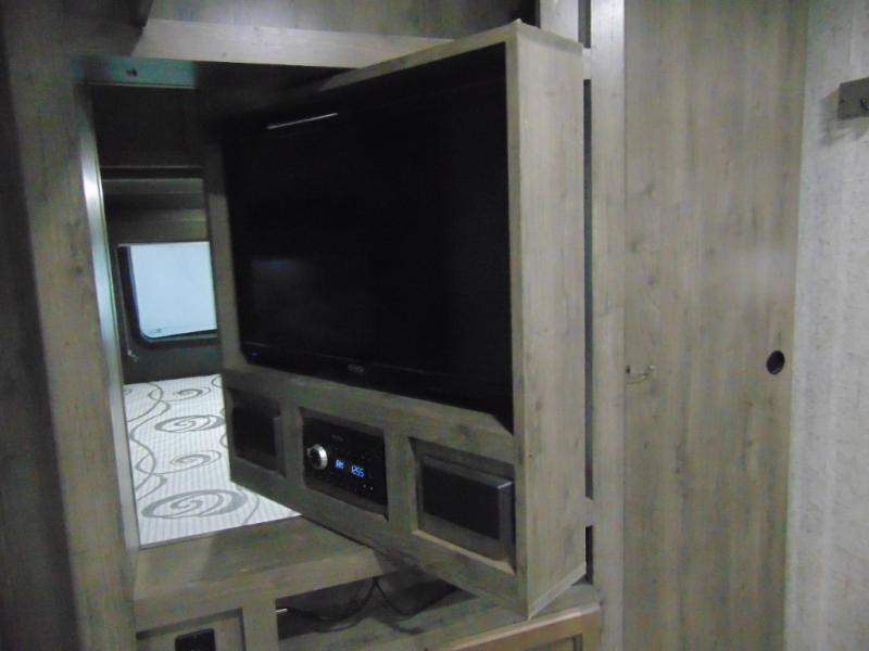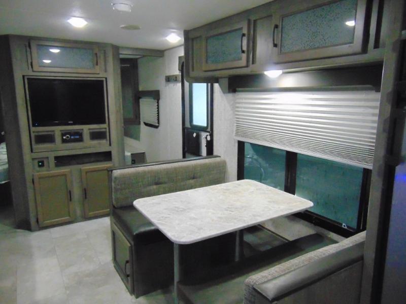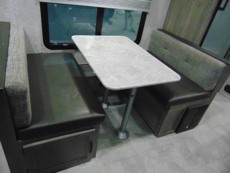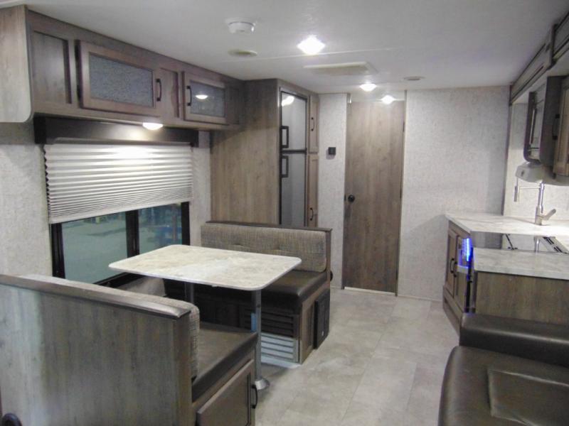 Eat, sleep, relax, and play all in this lightweight travel trailer that includes a large slide out for more interior space. After you've set up camp, have a look around the campground, then come back to prepare lunch on three burner range or use the outside kitchen. This model features a power awning with LED lights and exterior speakers with LED Lights to create an outdoor living space you are sure to love. When it's time to call it a night, the front private bedroom with a queen bed will be the perfect stop to rest your head and your guests will find sleeping space on sofa and dinette once folded down.