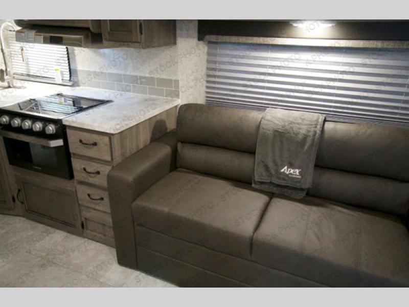 Each Apex Ultra-Lite travel trailer and toy hauler by Coachmen is easily towable, yet packed with comfortable features to make your camping experience great. These units feature LED lighting throughout, an interior convenience center, and a stainless steel microwave to make it feel more like home. You'll love the LED motion light in the exterior storage area and the hot/cold outside shower allows you to wash off your hiking boots and easily fill the dog's water bowl. Each model also includes an LED TV, an AM/FM/CD/DVD stereo with Bluetooth, and a USB charging station so you can still enjoy some entertainment and stay connected!