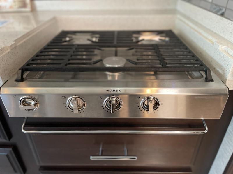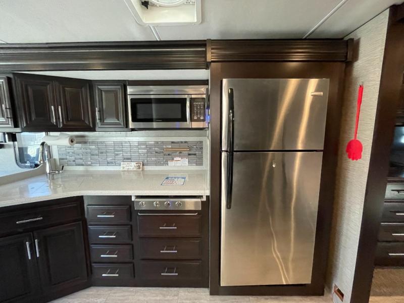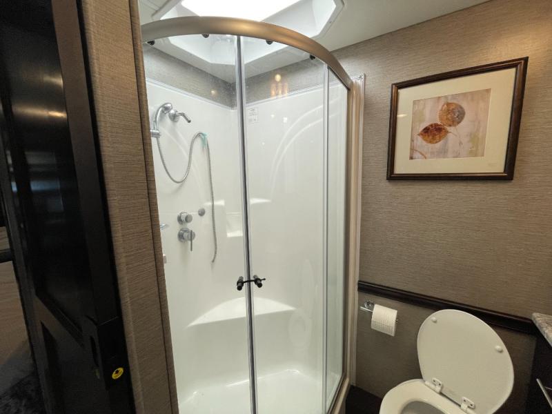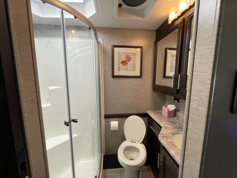 Whether you decide to live in this coach or explore for weeks at a time, you will experience luxury, comfort and spaciousness throughout. Imagine easily setting up the four slide outs at your favorite RV resort. You can then make a meal using the convection microwave while watching the 43" LED TV and visiting with your spouse relaxing on the Visionary hide-a-bed sofa. You will surely appreciate the farmhouse stainless steel sink to wash the dishes. And the polished solid surface kitchen countertops and the backsplash with tile inserts offer style you will love. When it's time to sleep, the king bed slide is waiting for you in the private rear bedroom. You will also find plenty of storage, a space prepped for a washer/dryer option, and a 32" LED TV. If your children joined you, they can sleep on the sofa, the Soft Touch Dream booth dinette and the bunk lift above the cab area. Everyone can stay clean with a full bathroom which includes a one piece fiberglass shower with tempered glass door and skylight, a solid surface under mount sink and a porcelain china bowl toilet with foot flush.