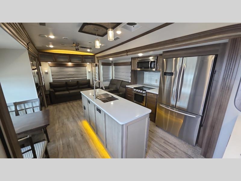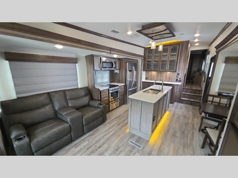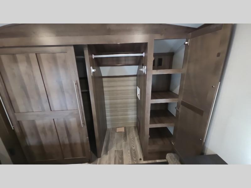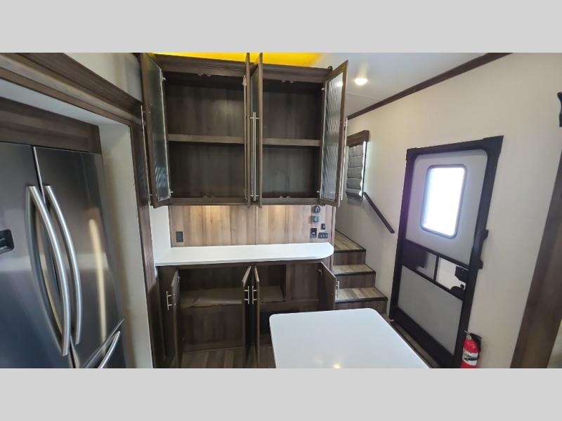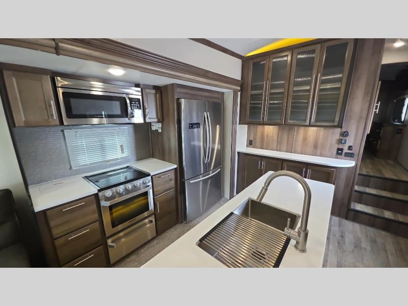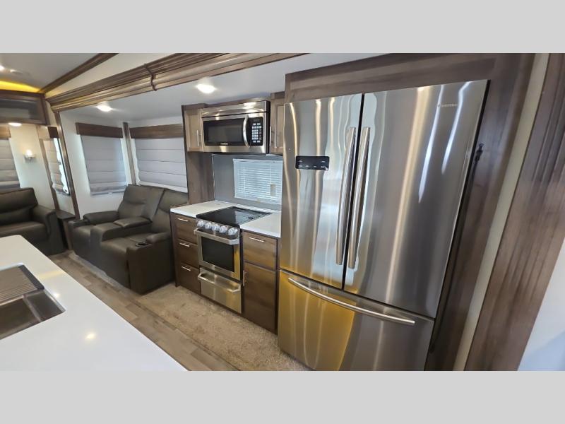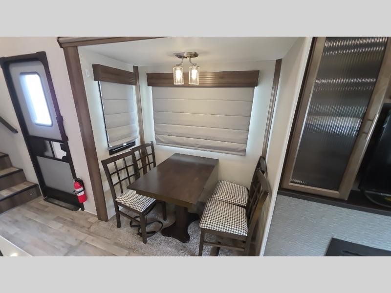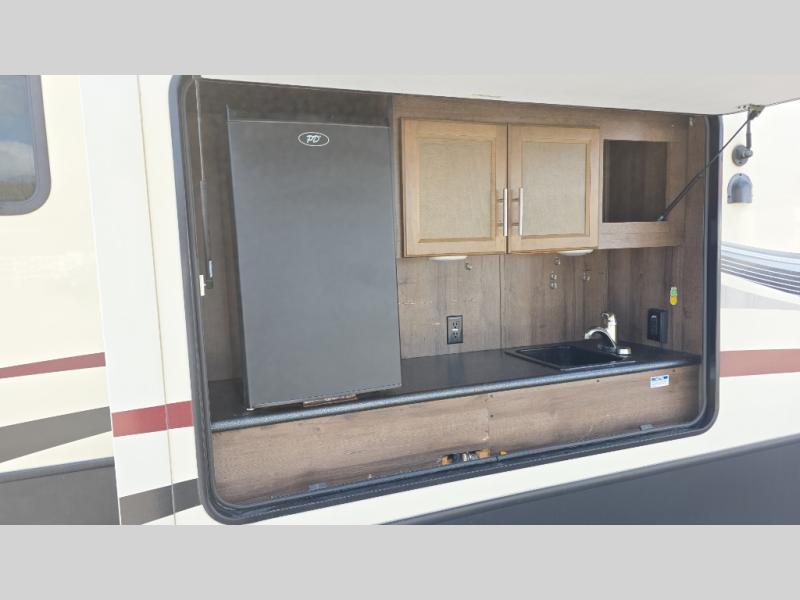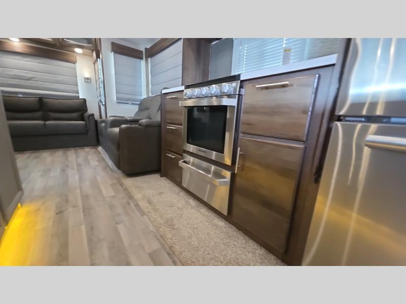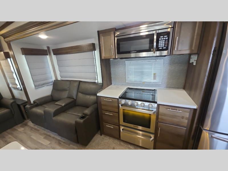 Looking for a couple's fifth wheel that includes extra sleeping space when the kids or your friends stay overnight? You can offer them the hide-a-bed sofa in the rear living area or they may even be able to sleep on the smaller sofa. The chef will love the layout of the kitchen including the island, hutch and appliances. Just imagine having the choice of making a meal in a microwave oven. You can store leftovers in the residential refrigerator or in the smaller refrigerator in the exterior kitchen. Once you are ready for bedtime, the king bed will allow you plenty of room to rest. You might even decide to use the washer and dryer to keep everything fresh and clean throughout your stay. Take a look!