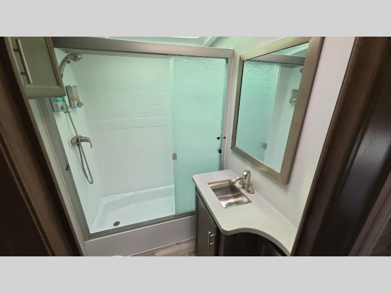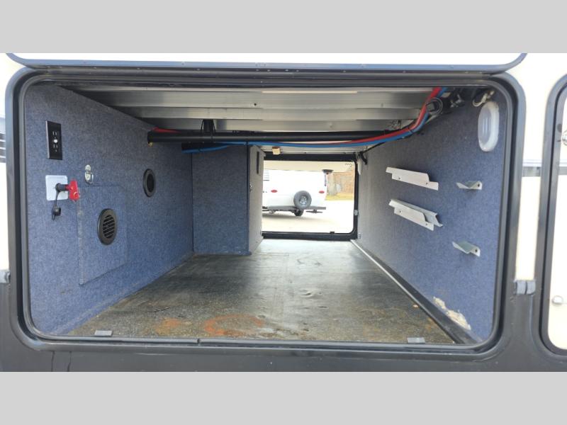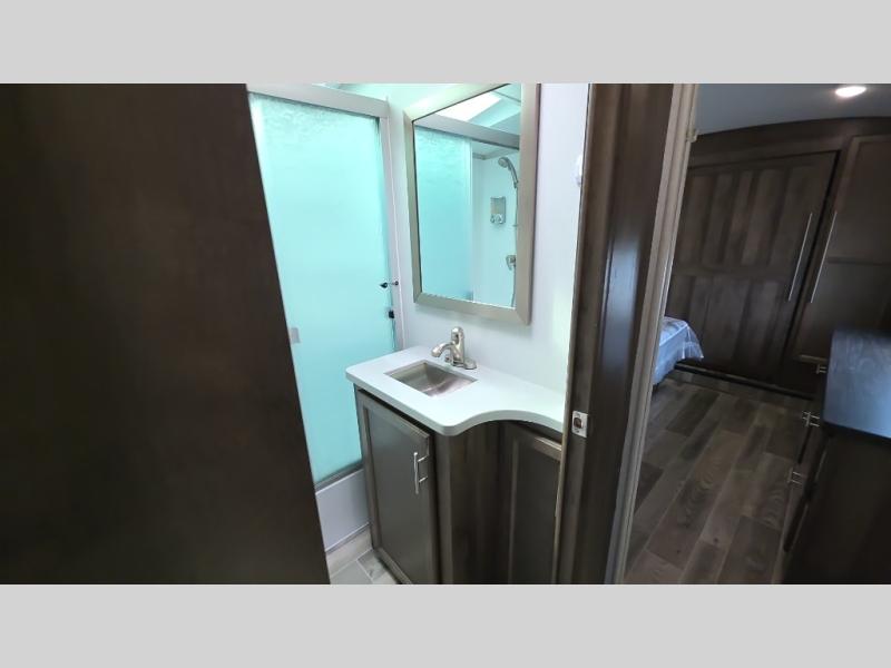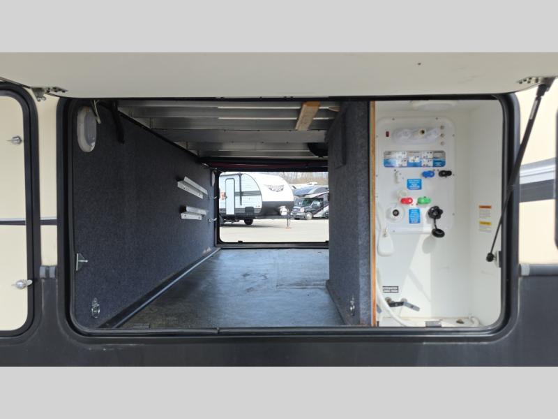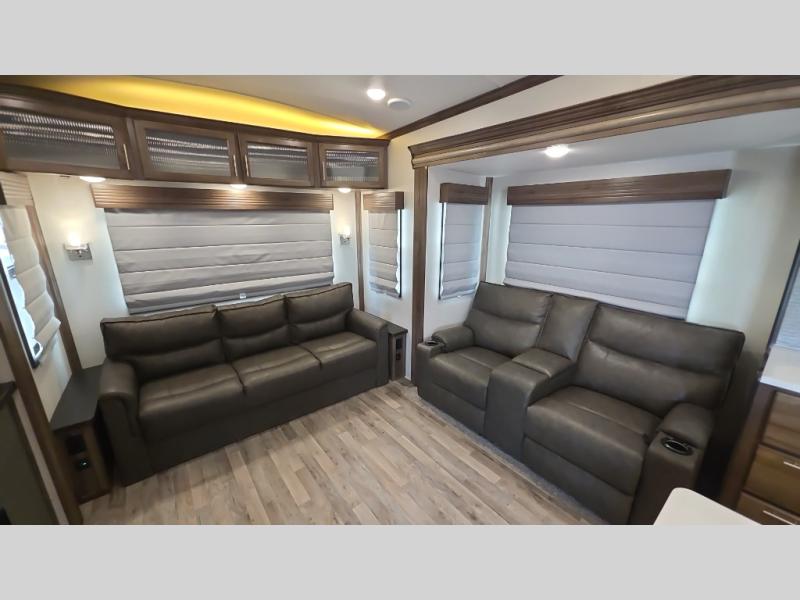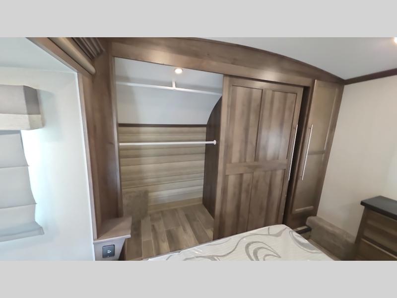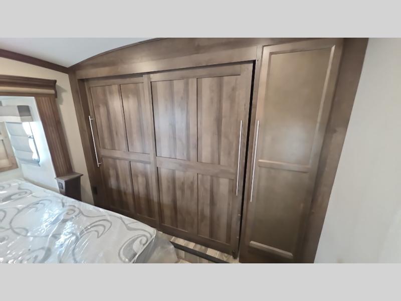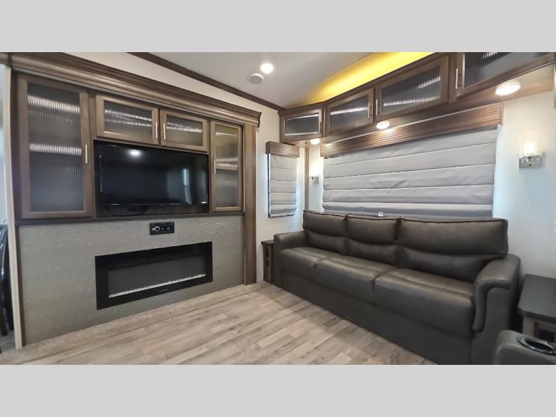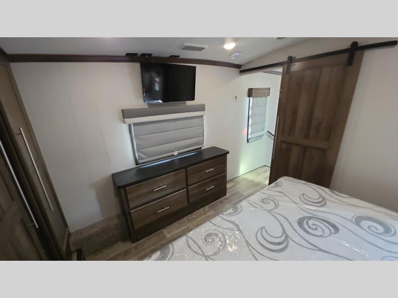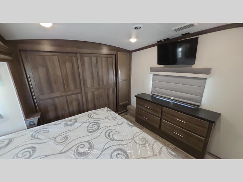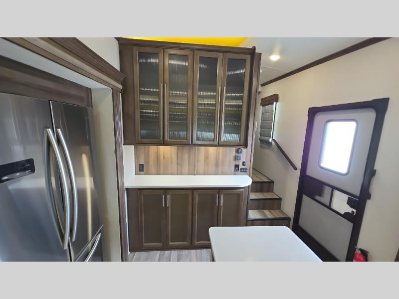 Looking for a couple's fifth wheel that includes extra sleeping space when the kids or your friends stay overnight? You can offer them the hide-a-bed sofa in the rear living area or they may even be able to sleep on the smaller sofa. The chef will love the layout of the kitchen including the island, hutch and appliances. Just imagine having the choice of making a meal in a microwave oven. You can store leftovers in the residential refrigerator or in the smaller refrigerator in the exterior kitchen. Once you are ready for bedtime, the king bed will allow you plenty of room to rest. You might even decide to use the washer and dryer to keep everything fresh and clean throughout your stay. Take a look!