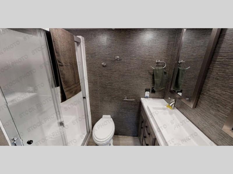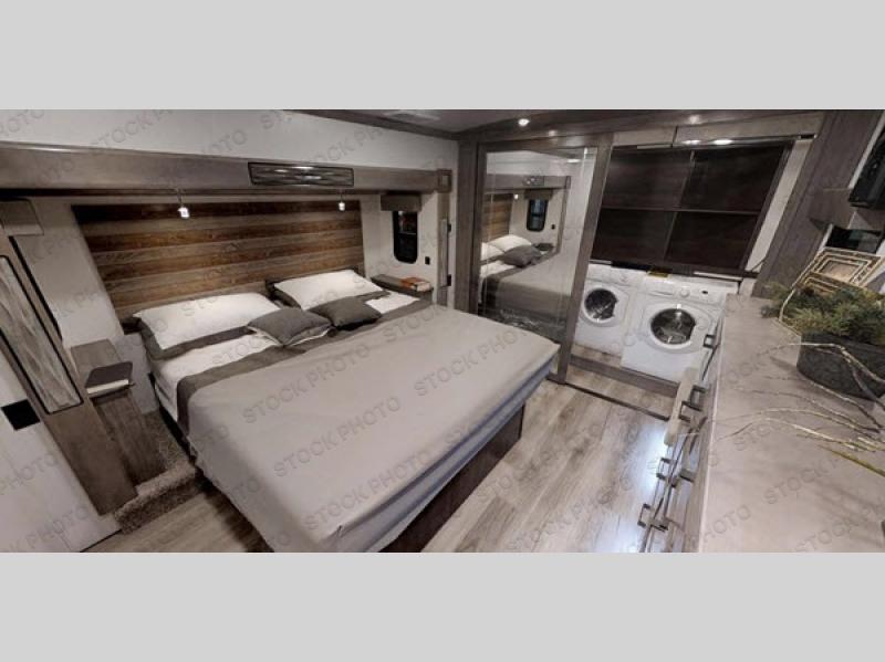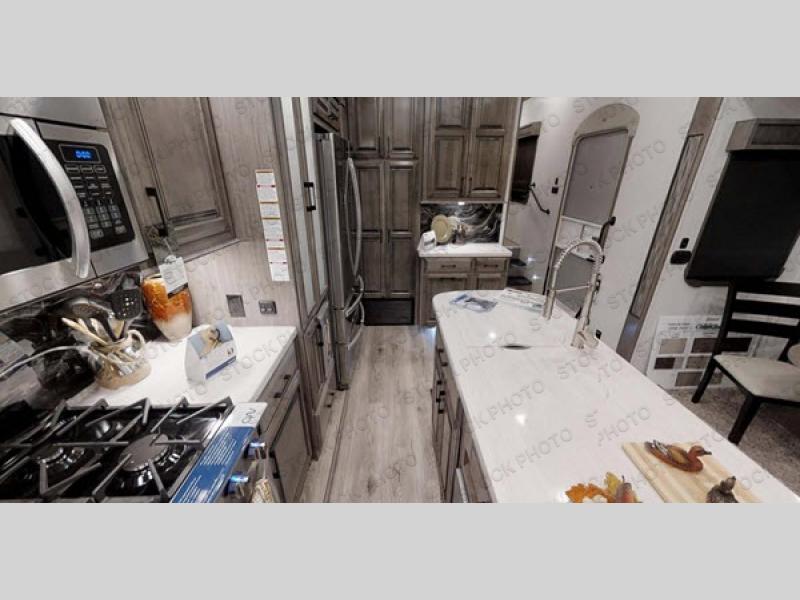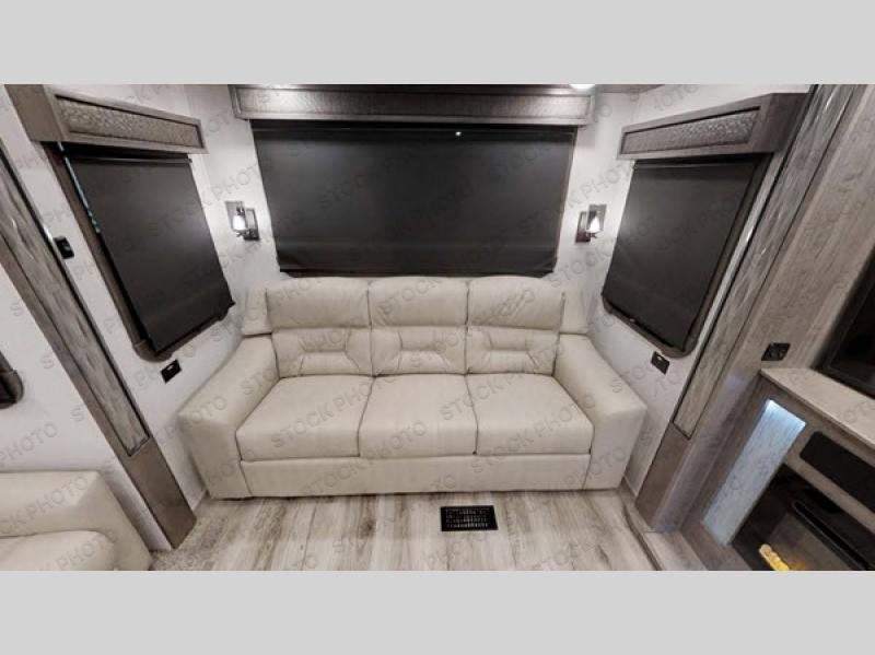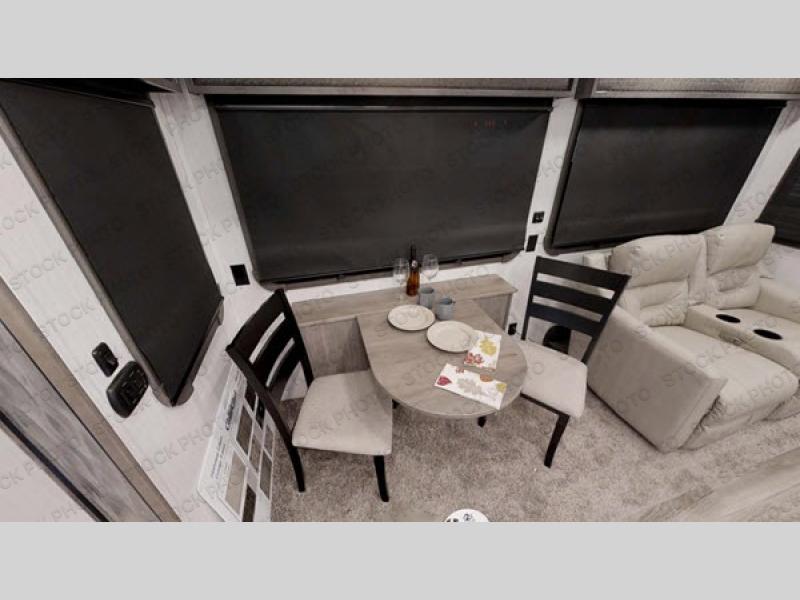 This fifth wheel is the perfect couple's coach to enjoy traveling the countryside with or setting up home base for awhile longer at your favorite location. From the three spacious slide outs for increased interior space, to the theater seats directly across from the fireplace, you will feel right at home! The kitchen island has a double sink, extra counter space, plus you can add an optional dishwasher which will speed up the clean-up process. Enjoy your meals at the free-standing dinette, and at night head up the stairs to the private front bedroom where you will find a king bed, a full-length wardrobe for your clothes, plus there is a spot that has been prepped for a washer and dryer so that you can easily keep up with the laundry while you are away from home!