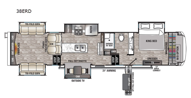 Whether you're looking for an RV to camp with on the weekends, or you're wanting to go full-time RVing, this fifth wheel is the one. Enjoy ample interior space thanks to the five slides and you can comfortably sleep six people each night. Mom and dad will surely love the front private bedroom with a slide out king bed and a large front wardrobe. There is even a space to add an optional washer and dryer to make wash day easier than ever. Your guests can convert the two tri-fold sofas in the rear living area and the power theater seats will allow you to kick up your feet to watch a movie on the 55" 4K TV. This model also includes a stainless steel 30" microwave oven, and a four burner cooktop to prepare home-cooked meals, and the two pantries included can hold all the canned goods and snacks. If you're looking to cook breakfast outdoors, just choose the optional exterior pull-out kitchen!