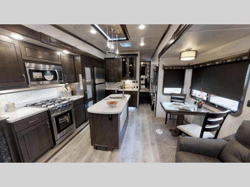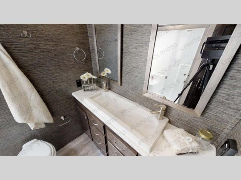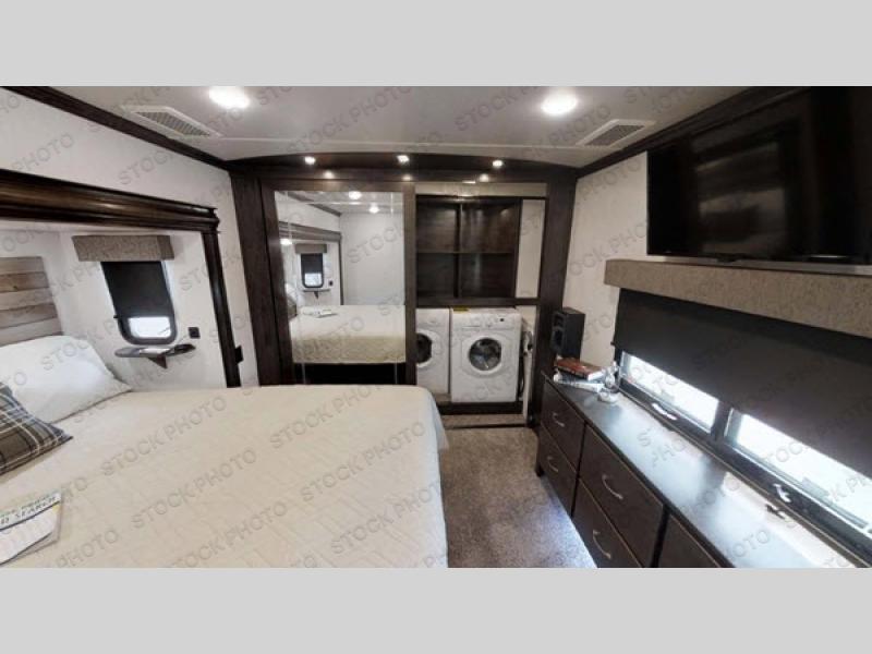 The kitchen is centrally located so you can make snacks and meals while visiting with everyone in the rear living area. Your family and guests can choose to relax on the hide-a-bed sofa, the power theater seats, or the four chairs around the free standing dinette. They can also enjoy the fireplace, the entertainment center and the 50" TV on a swing arm. You can cook in the full kitchen with lots of counter space, and you might decide to add a dishwasher option to the island. When you are ready to call it a night, you can head to the master bedroom with a residential style headboard and luxurious bedding decor, USB plug-ins on each side of the king bed, and plenty of storage. You might like to add an option or two such as an exterior pull-out kitchen with TV, and/or a washer and dryer.