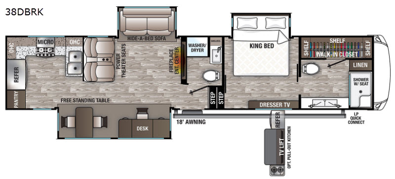 The chef in the family will love the rear kitchen offering lots of counter space and everything needed to stay fed for days thanks to the 20 cu. ft. refrigerator with icemaker, and the pantry. And there is an optional exterior pull-out kitchen with TV option if you would like to add that feature for future use. You can dine at the free standing dinette with four chairs, and complete some work at the desk with great views of your campsite out of the windows. The living area offers a hide-a-bed sofa and power theater seats, plus a fireplace. There is a half bath with a prepped space for a washer and dryer if you add those appliances. You can walk-through the master bedroom to find a residential style headboard and luxurious bedding decor, USB plug-ins on each side of the king bed, a dresser and a sliding bathroom door. The front full bathroom offers a large wardrobe with shelves, a double basin, trough sink, and a seated shower, you may never want to leave.