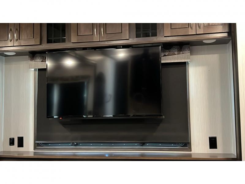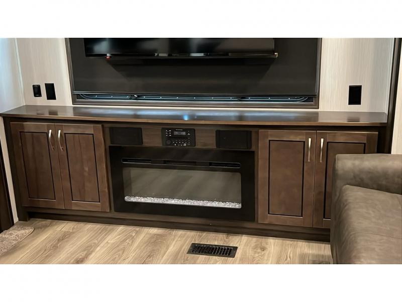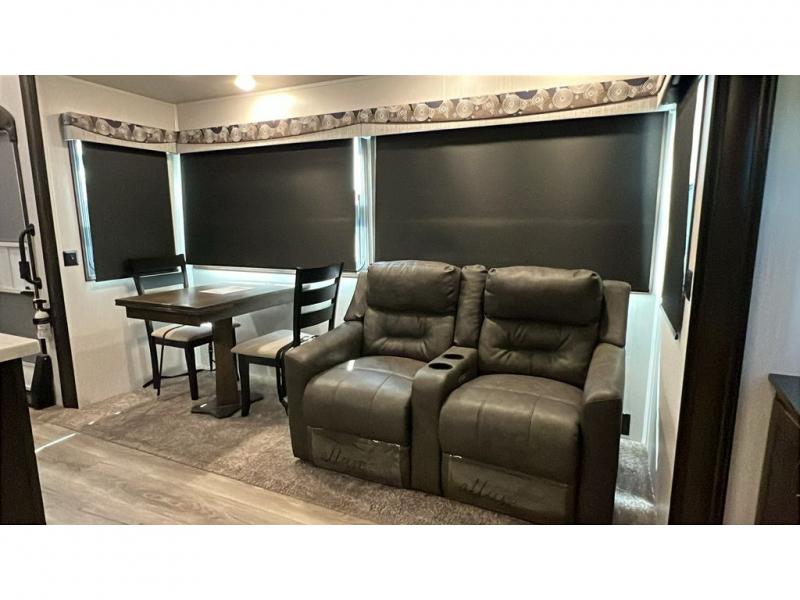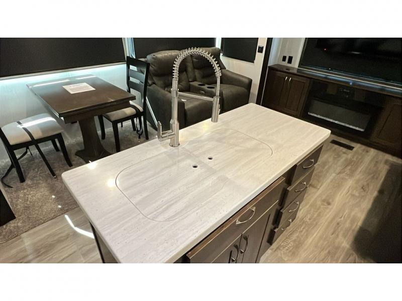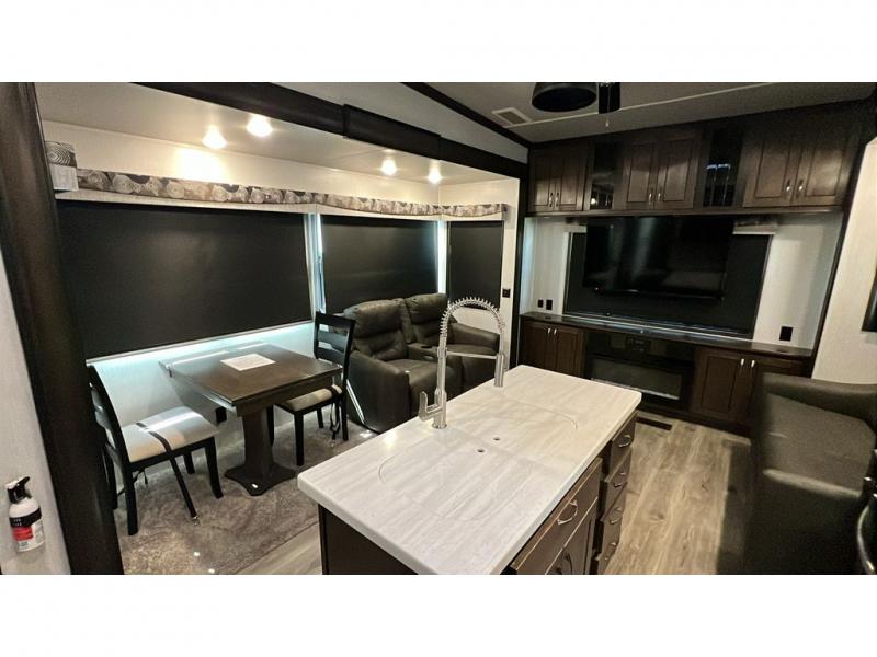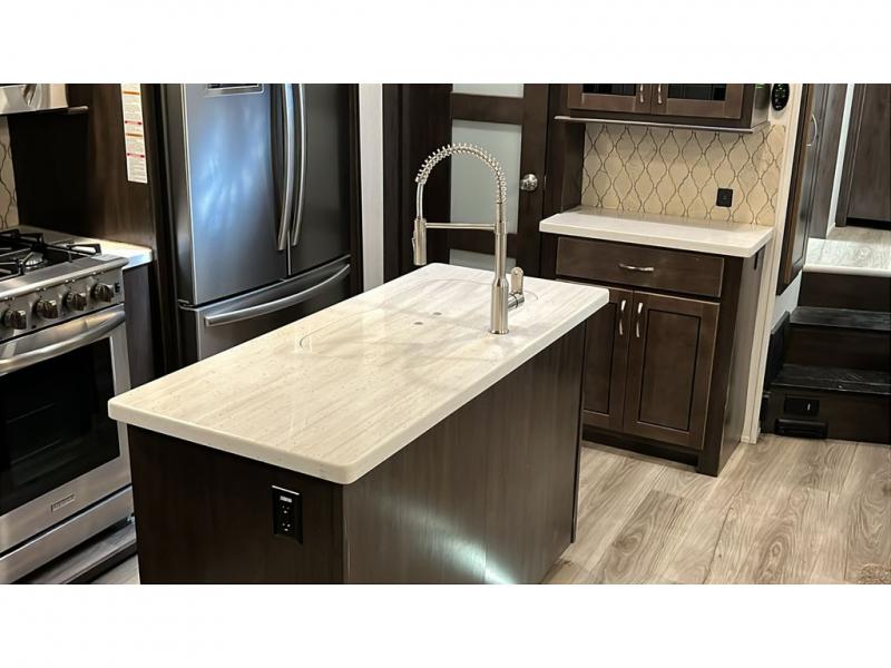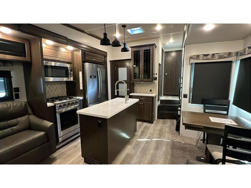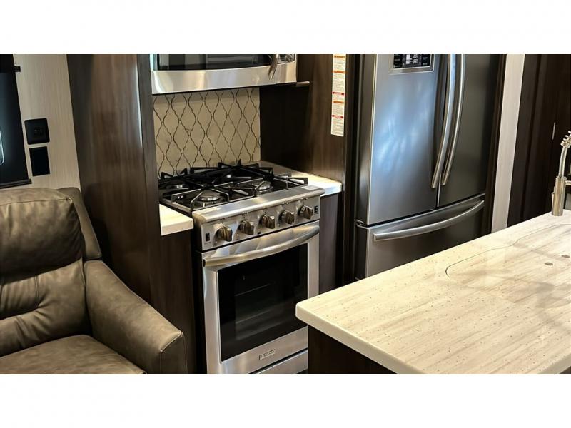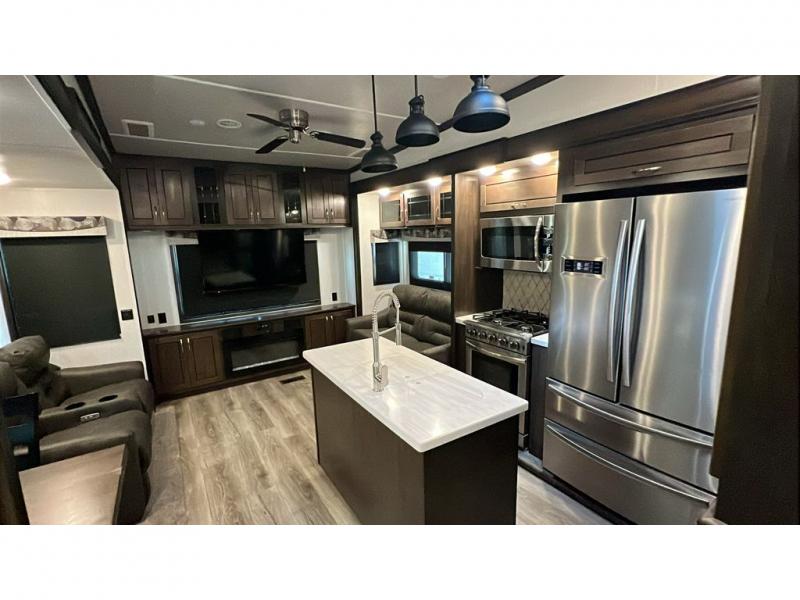 You can stop searching for your next RV! This fifth wheel has everything you may need while away from home, and some! The rear living/entertainment area features dual opposing slides to create an open and inviting space and the kitchen island in the middle brings it all together. You can relax each day on the power theater seats or on the hide-a-bed sofa and the free-standing table will allow you to enjoy meals just like you do at home. Prepare all your meals on the 24" gas range or in the 30" stainless steel microwave oven and an added perk is being able to choose the optional pull-out kitchen if you like to cook breakfast outdoors. This model features a front private bedroom with a king bed slide out, a large front wardrobe closet, and a 32" TV!