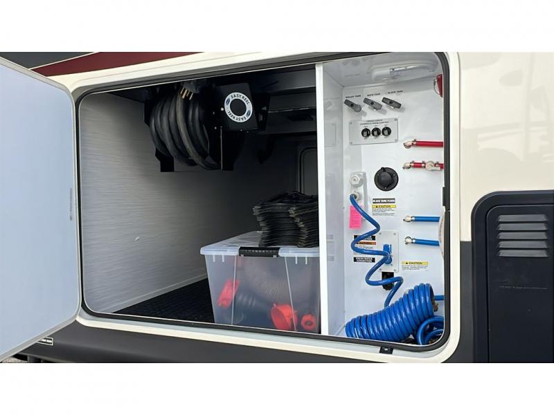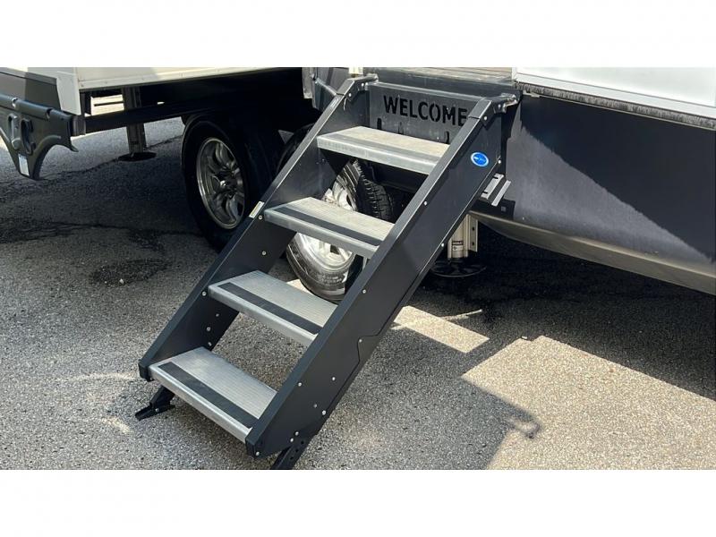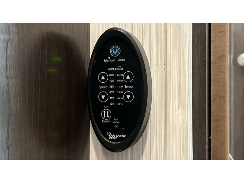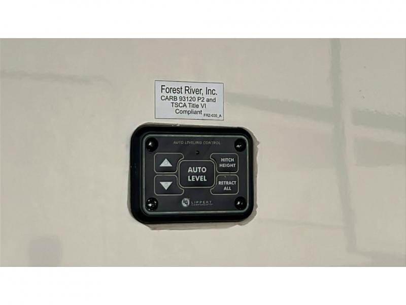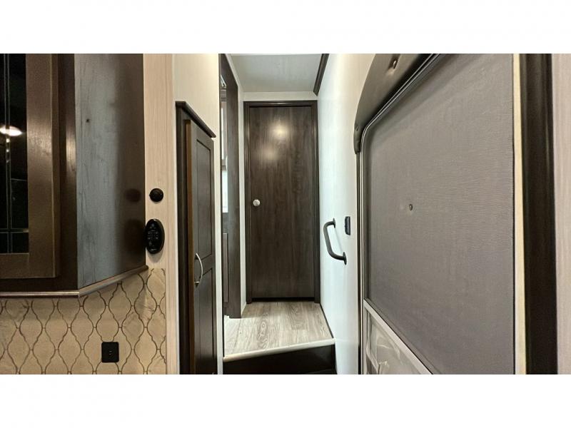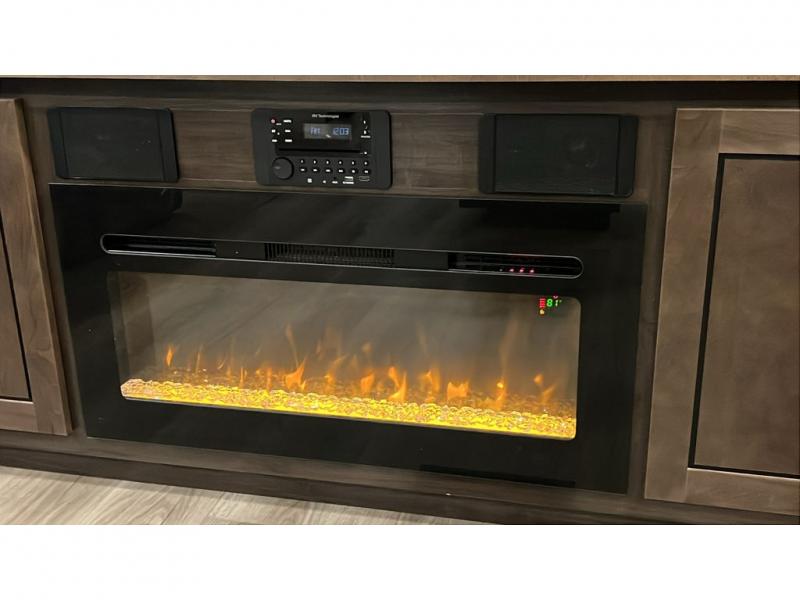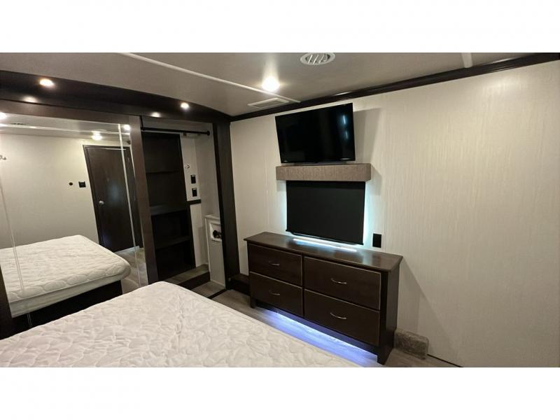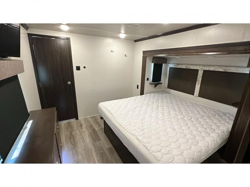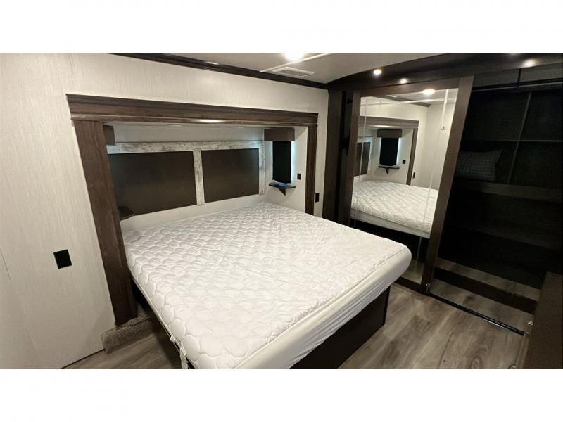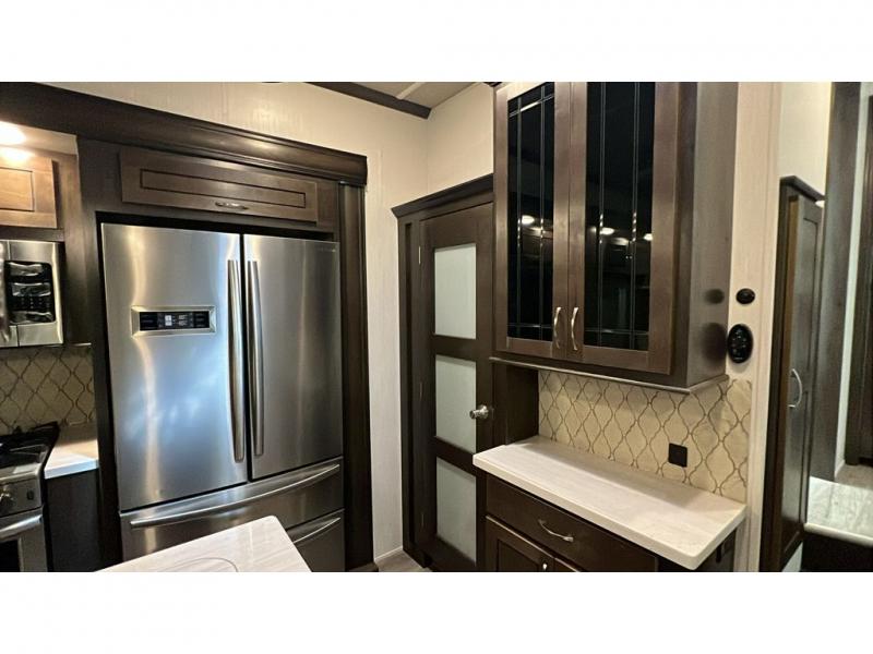 You can stop searching for your next RV! This fifth wheel has everything you may need while away from home, and some! The rear living/entertainment area features dual opposing slides to create an open and inviting space and the kitchen island in the middle brings it all together. You can relax each day on the power theater seats or on the hide-a-bed sofa and the free-standing table will allow you to enjoy meals just like you do at home. Prepare all your meals on the 24" gas range or in the 30" stainless steel microwave oven and an added perk is being able to choose the optional pull-out kitchen if you like to cook breakfast outdoors. This model features a front private bedroom with a king bed slide out, a large front wardrobe closet, and a 32" TV!