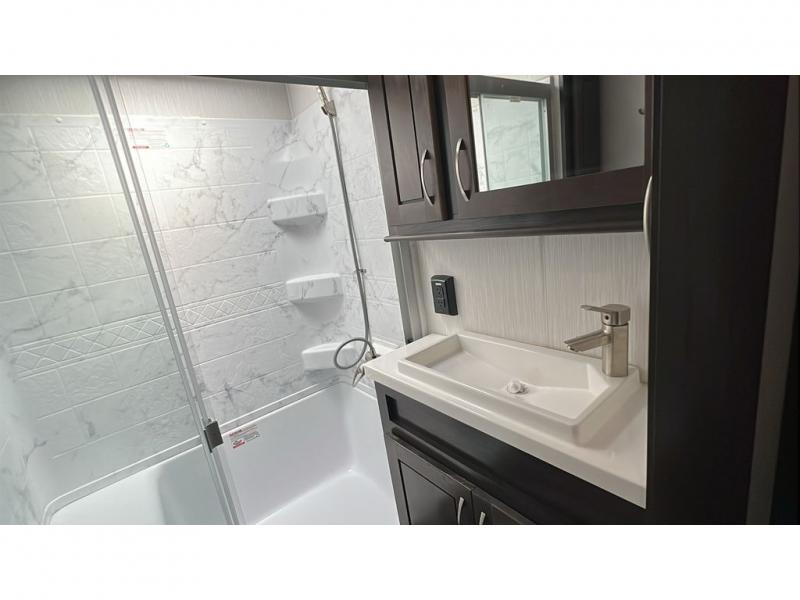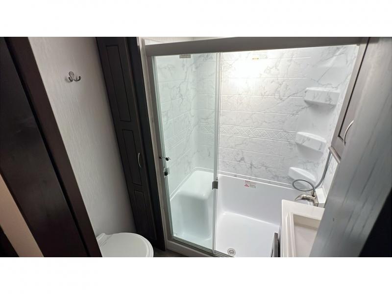 With any Forest River Cedar Creek Silverback Edition fifth wheel you will find Congoleum carefree flooring throughout and in the dining slide there is Shaw carpeting to give an at-home feel. The kitchen has everything that you would expect to find at home, including an Insignia, free-standing 24" four burner gas range, solid surface countertops, a 20 cu.ft. stainless steel refrigerator with an icemaker, and a Fantastic Create-A-Breeze fan with a rain sensor and thermostat. Each model features a fireplace, under-bed storage for all your luggage, a rectangular shower with a large seat and sliding glass doors, plus a space that has been prepped to add a washer and dryer if you choose. These models also include Dexter Heavy Duty Axles with E-Z Lube Hubs, Dexter Nev-R-Adjust Brakes, plus Dexter E-Z Flex Suspension with greased Zerk fittings for a smooth ride each trip!