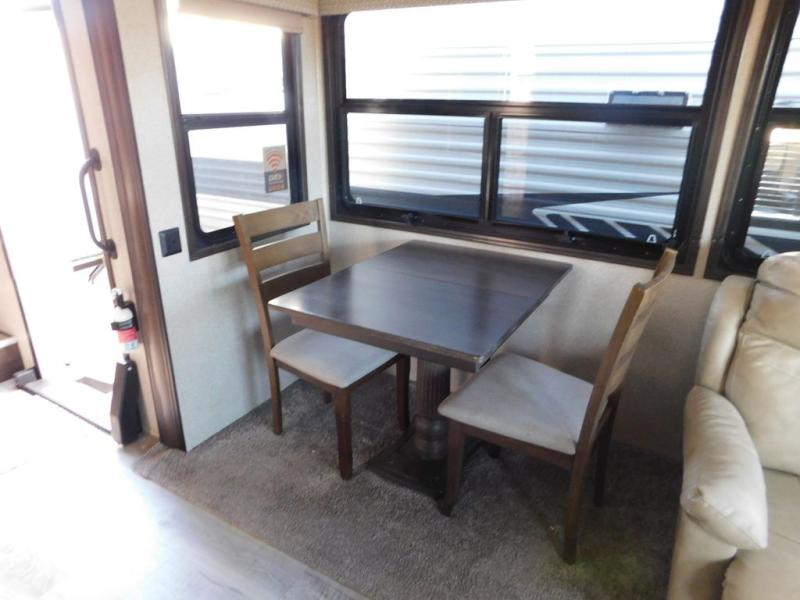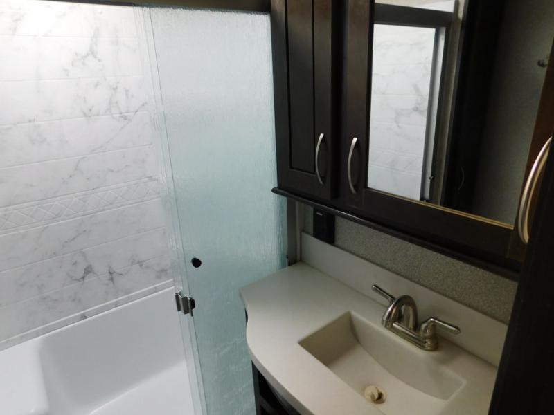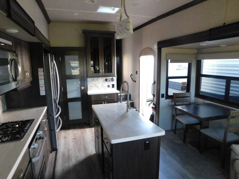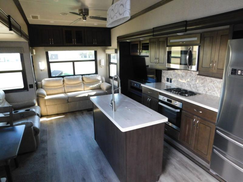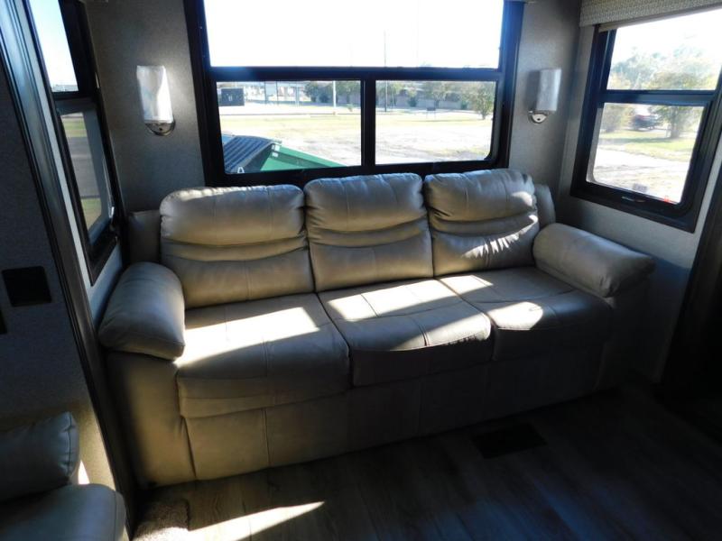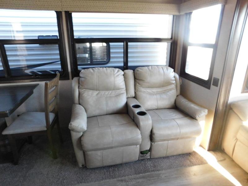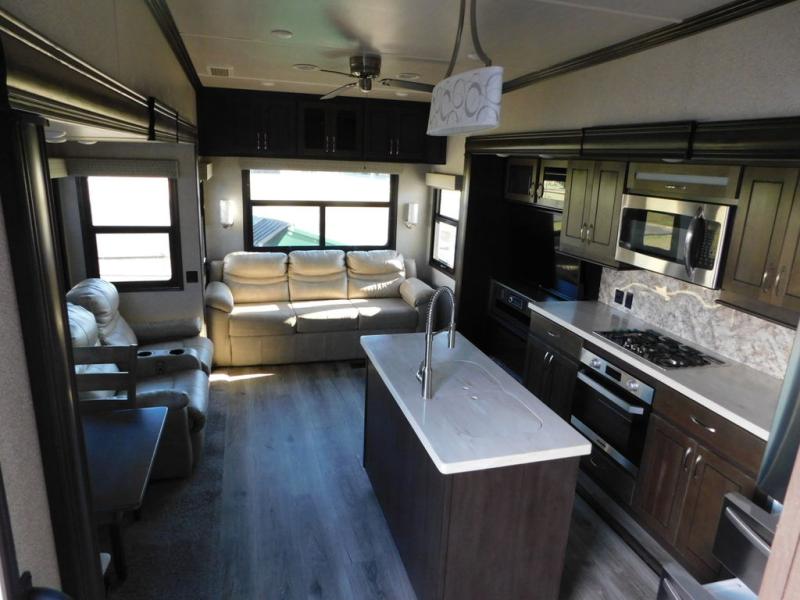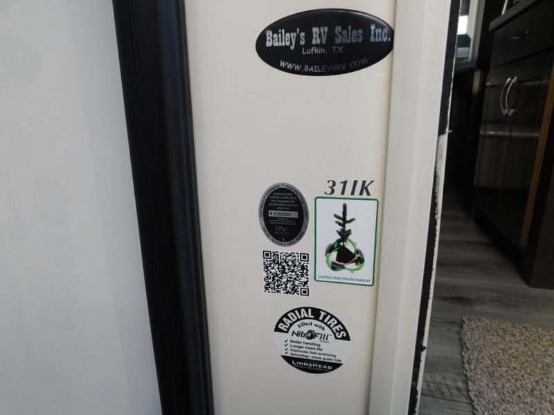 Are you ready to get away for the weekend while still enjoying the luxuries of home? Well then come check out this fifth wheel! It has a convenient kitchen island to provide more counter space and a double bowl sink with a high rise faucet to make clean up a breeze. You will also enjoy relaxing on the sofa or on the power theater seats while you watch a movie on the 50" TV on swing arm. If it's a chilly evening, everyone will love to watch the glow of the fireplace as you reminisce about your day. Mom and dad will love the front private bedroom that features a king bed slide out and a redesigned front wardrobe closet with removable shelves to add a washer and dryer if you choose.