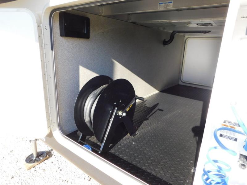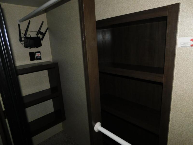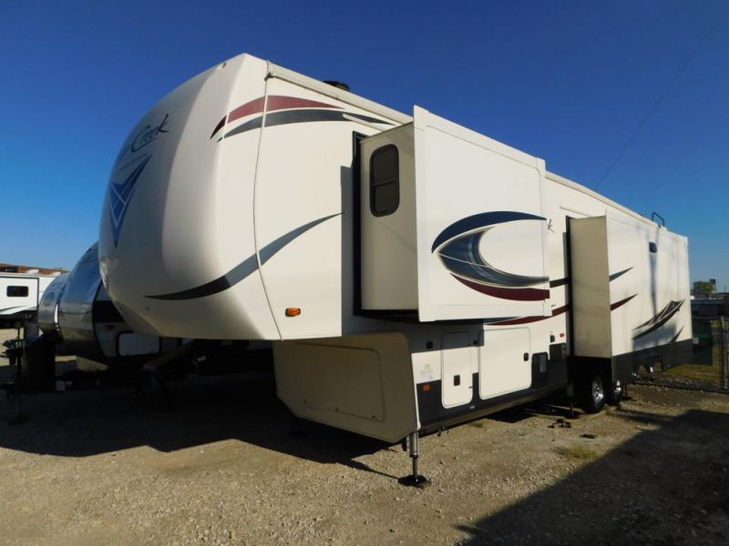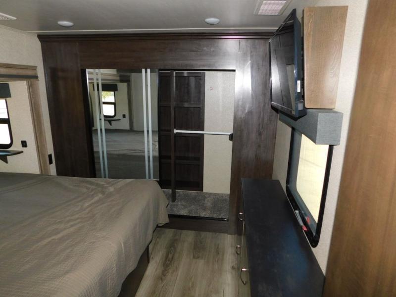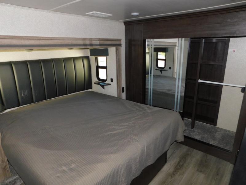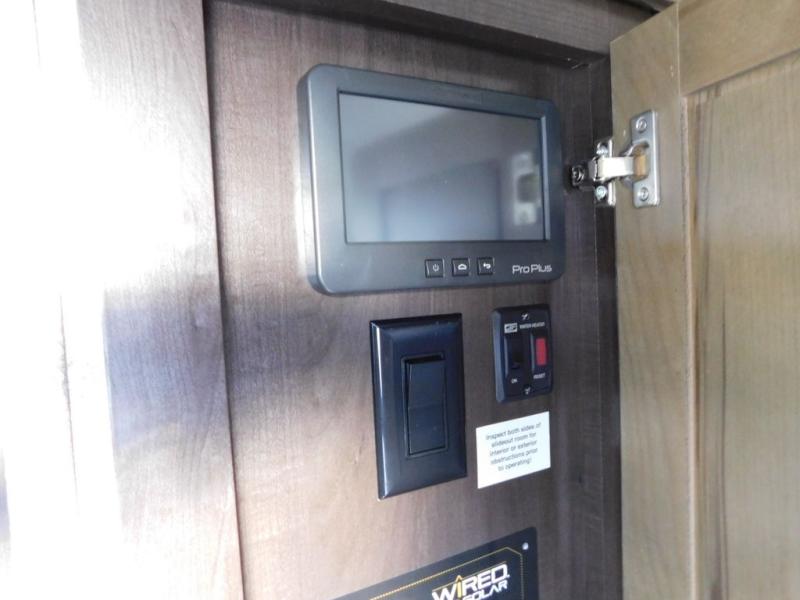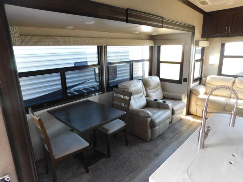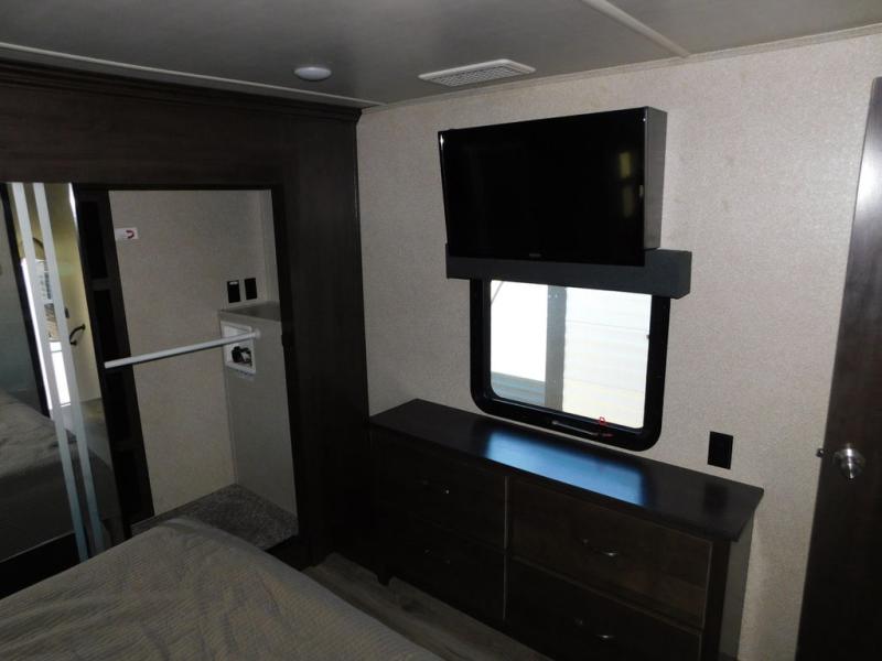Are you ready to get away for the weekend while still enjoying the luxuries of home? Well then come check out this fifth wheel! It has a convenient kitchen island to provide more counter space and a double bowl sink with a high rise faucet to make clean up a breeze. You will also enjoy relaxing on the sofa or on the power theater seats while you watch a movie on the 50" TV on swing arm. If it's a chilly evening, everyone will love to watch the glow of the fireplace as you reminisce about your day. Mom and dad will love the front private bedroom that features a king bed slide out and a redesigned front wardrobe closet with removable shelves to add a washer and dryer if you choose.