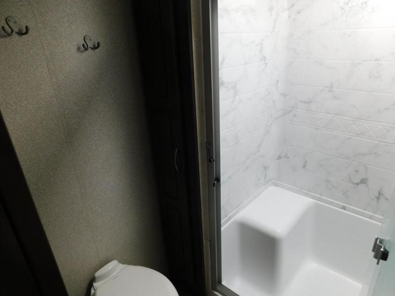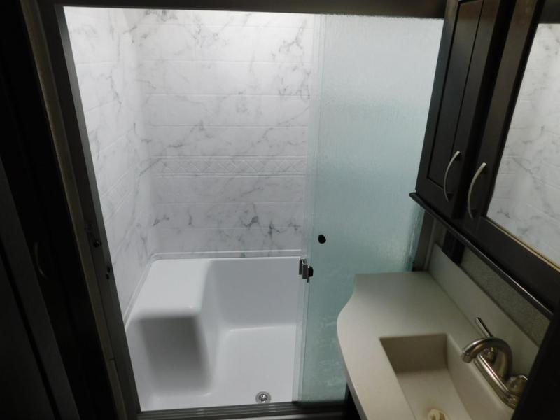 With any Forest River Cedar Creek Silverback Edition fifth wheel you will find Congoleum carefree flooring throughout and in the dining slide there is Shaw carpeting to give an at-home feel. The kitchen has everything that you would expect to find at home, including an Insignia, free-standing 24" four burner gas range, solid surface countertops, a 20 cu.ft. stainless steel refrigerator with an icemaker, and a Fantastic Create-A-Breeze fan with a rain sensor and thermostat. Each model features a fireplace, under-bed storage for all your luggage, a rectangular shower with a large seat and sliding glass doors, plus a space that has been prepped to add a washer and dryer if you choose. These models also include Dexter Heavy Duty Axles with E-Z Lube Hubs, Dexter Nev-R-Adjust Brakes, plus Dexter E-Z Flex Suspension with greased Zerk fittings for a smooth ride each trip!
