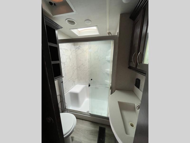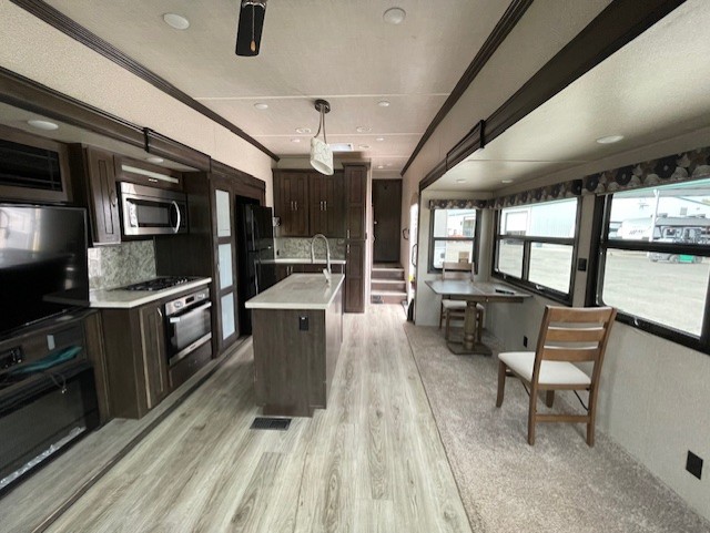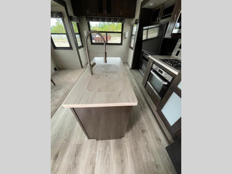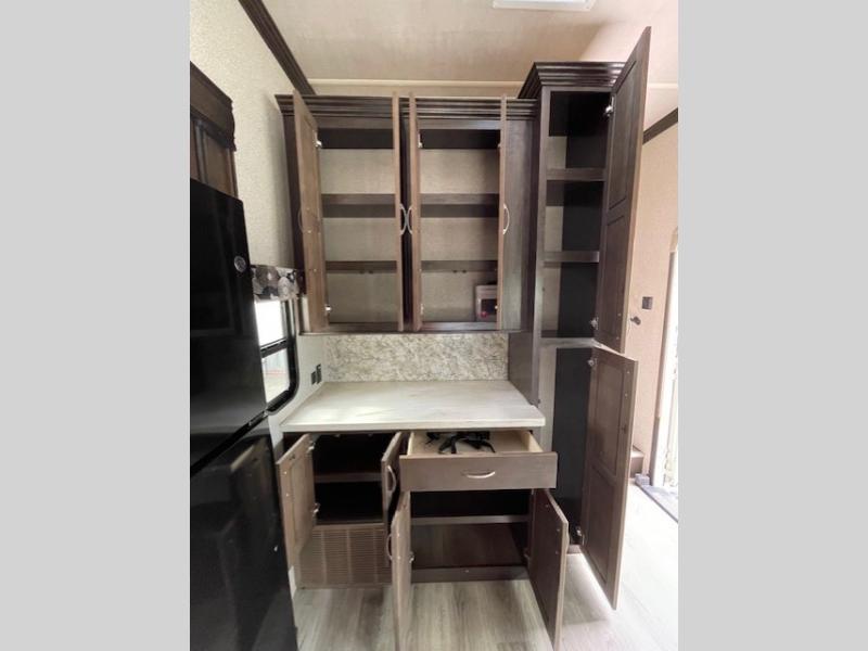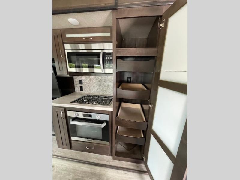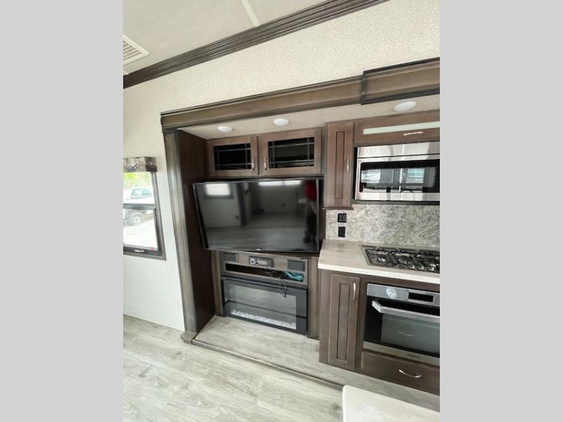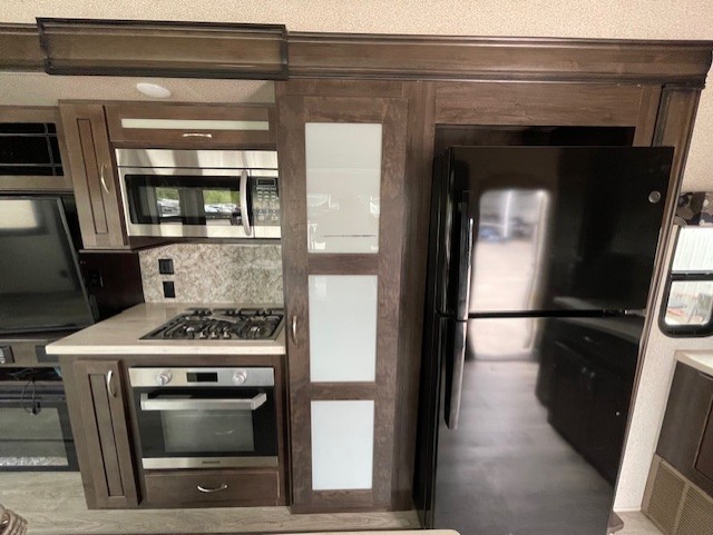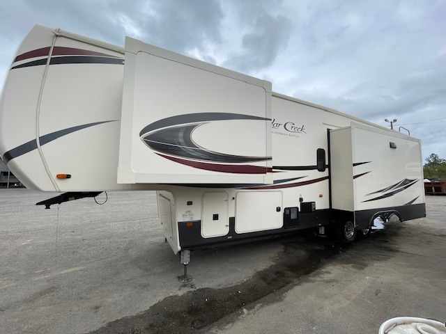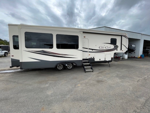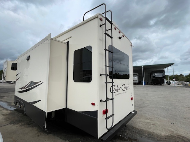 With any Forest River Cedar Creek Silverback Edition fifth wheel you will find Congoleum carefree flooring throughout and in the dining slide there is Shaw carpeting to give an at-home feel. The kitchen has everything that you would expect to find at home, including an Insignia, free-standing 24" four burner gas range, solid surface countertops, a 20 cu.ft. stainless steel refrigerator with an icemaker, and a Fantastic Create-A-Breeze fan with a rain sensor and thermostat. Each model features a fireplace, under-bed storage for all your luggage, a rectangular shower with a large seat and sliding glass doors, plus a space that has been prepped to add a washer and dryer if you choose. These models also include Dexter Heavy Duty Axles with E-Z Lube Hubs, Dexter Nev-R-Adjust Brakes, plus Dexter E-Z Flex Suspension with greased Zerk fittings for a smooth ride each trip!