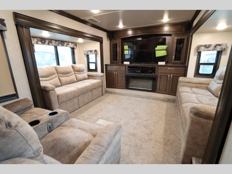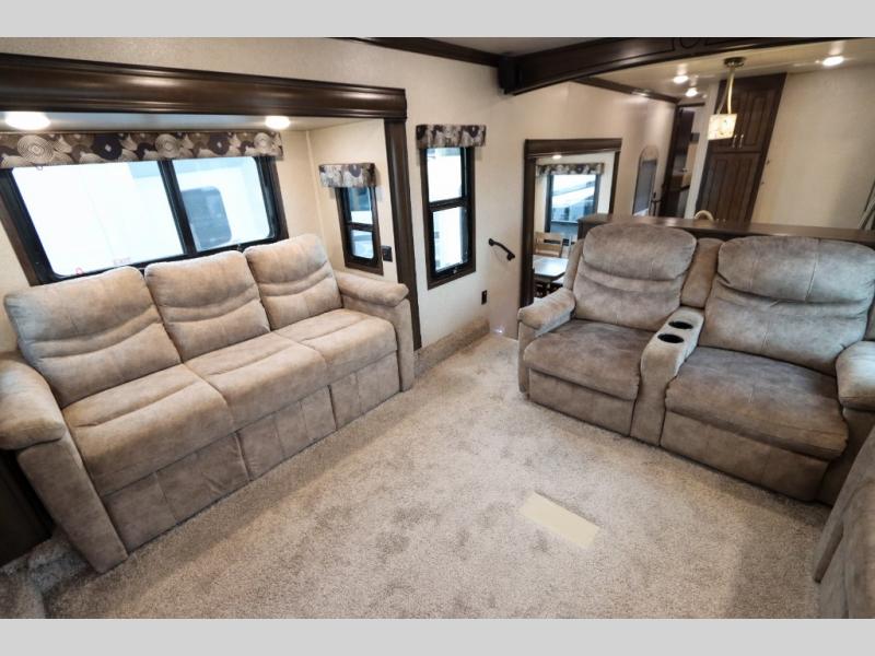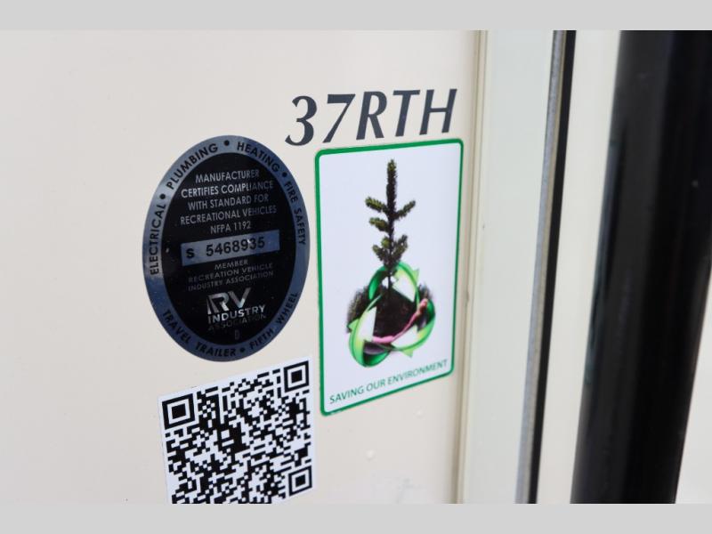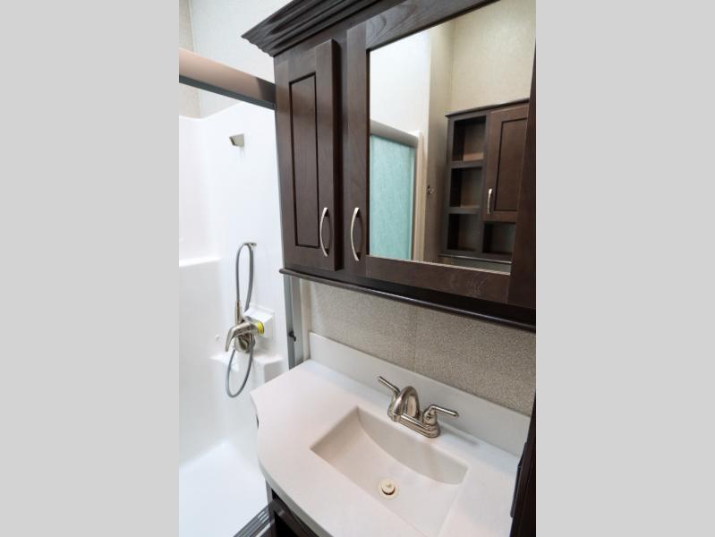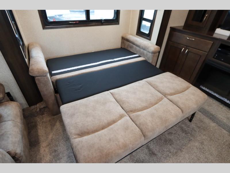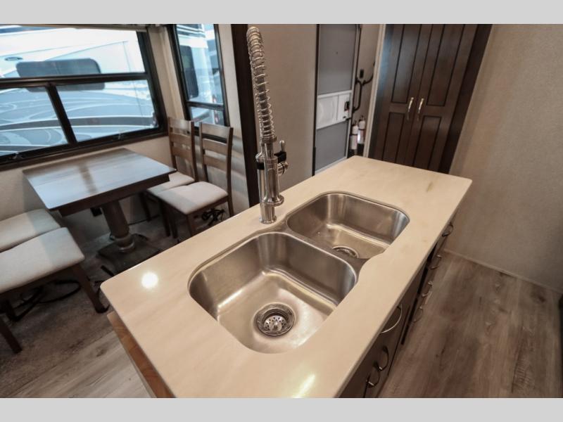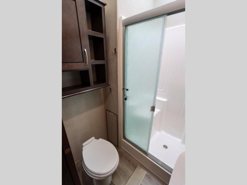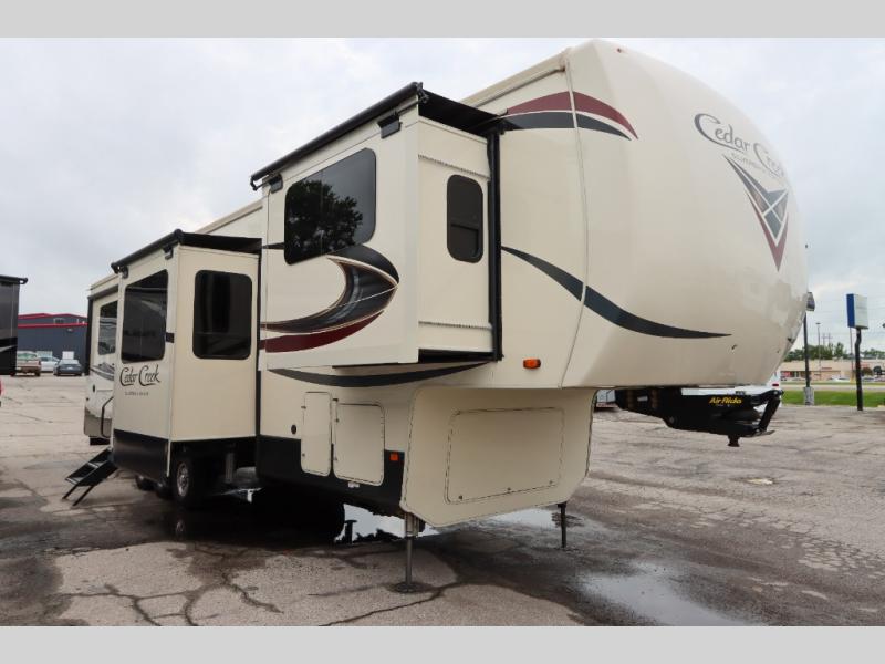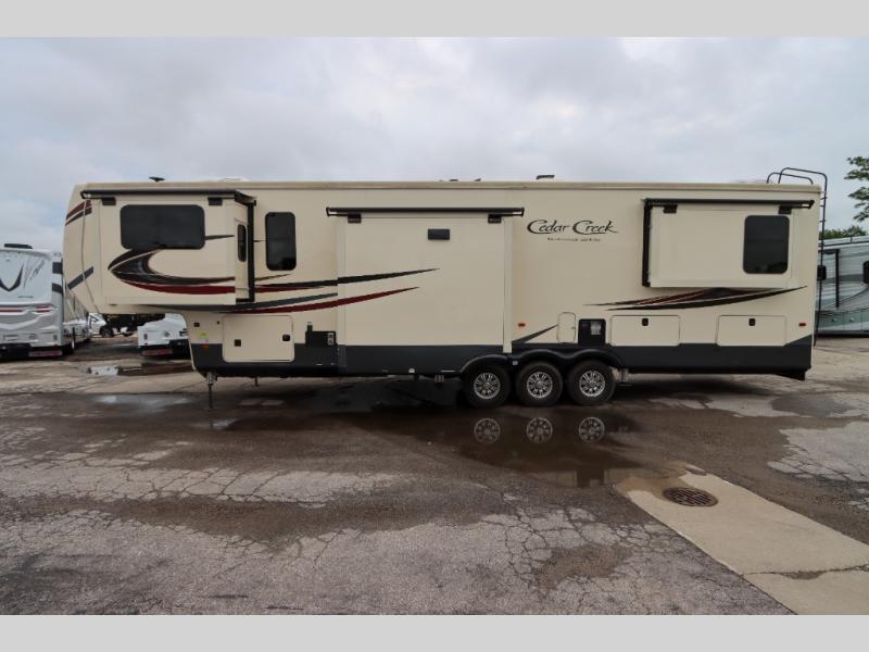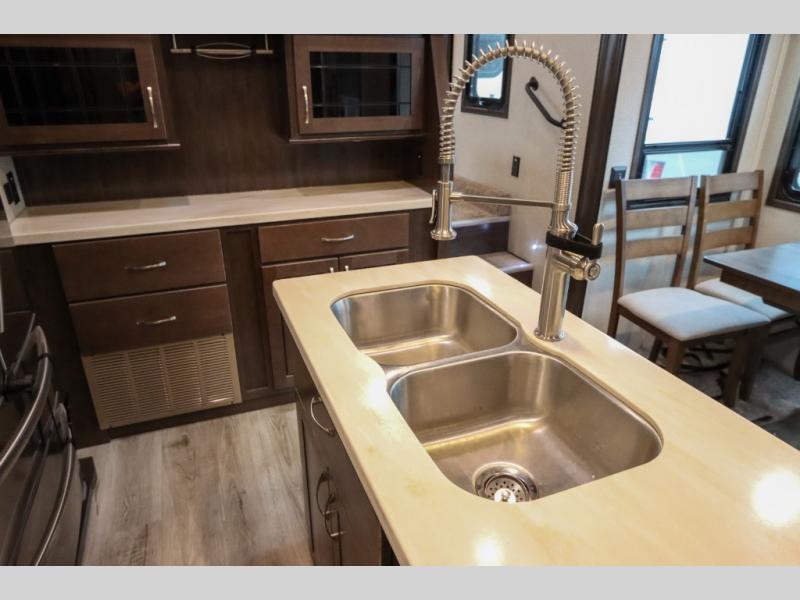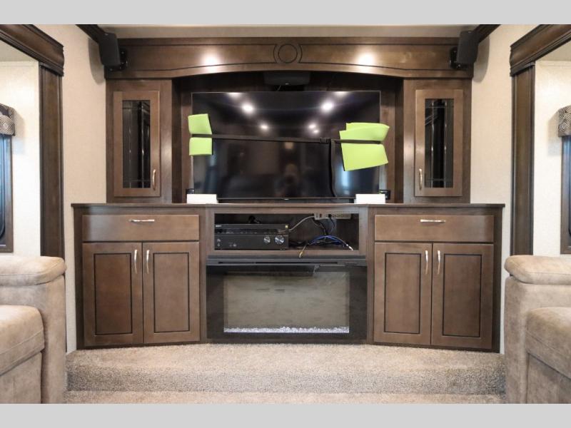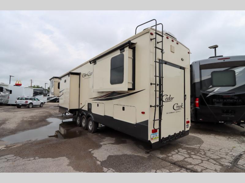 With any Forest River Cedar Creek Silverback Edition fifth wheel you will find Congoleum carefree flooring throughout and in the dining slide there is Shaw carpeting. The kitchen has everything that you would expect to find at home and more from the Furrion chef's kitchen with a gas cooktop, to the full panel backsplash, you won’t be disappointed! The 36" electric fireplace, the Jensen 12 volt CD/DVD/AM/FM/MP3/USB stereo system with a smart control app and Bluetooth, and the 50" LED TV with a swing arm in the living room are sure to be crowd pleasers! Each fifth wheel is constructed with Cedar Creek's famous all aluminum super-structure with a radius wrap metal skirt, and a Z-frame. Plus each comes with a Dexter safety and performance package which includes Dexter axles/brakes/suspension, and a Dexter E-Z flex rubber equalization system with bronze bushings and six greased zerks per side. You are sure to love camping in any one of these Forest River Cedar Creek Silverback fifth wheels so come choose your favorite one today!